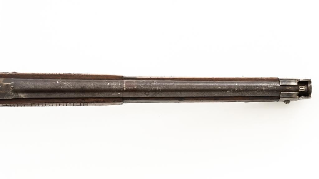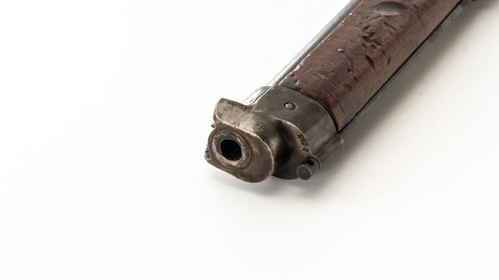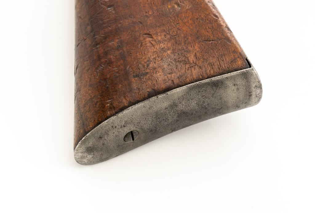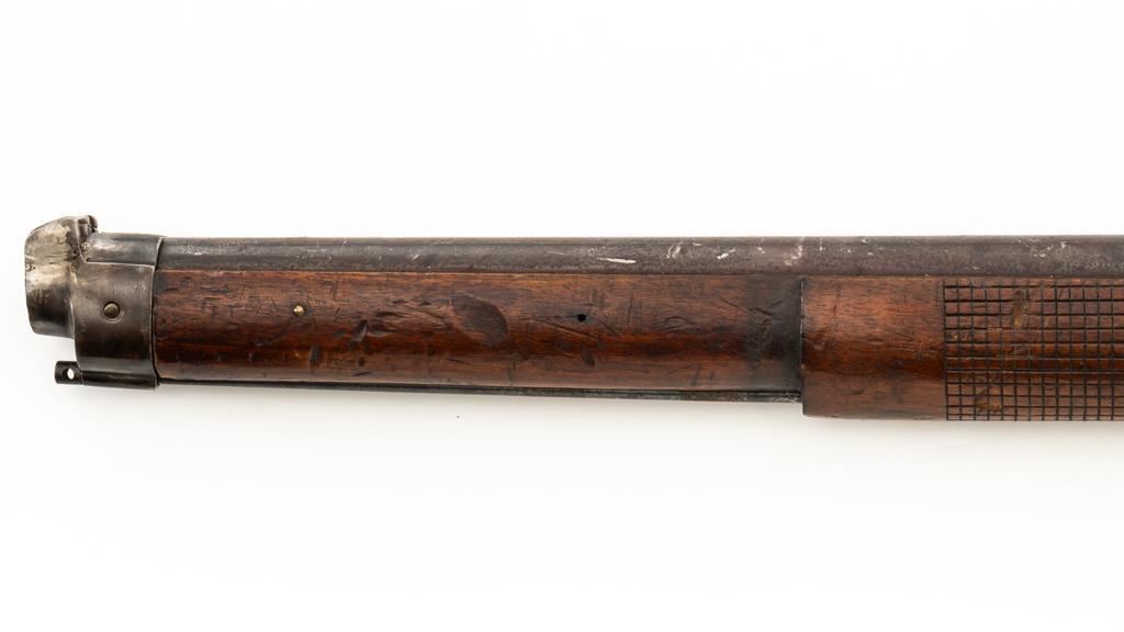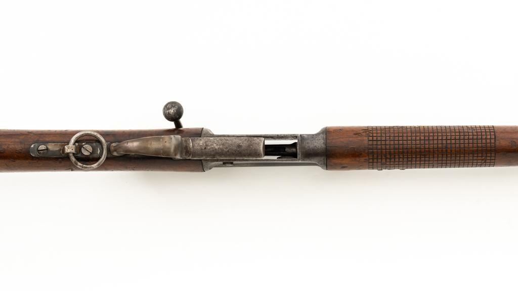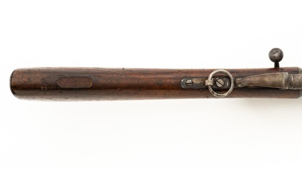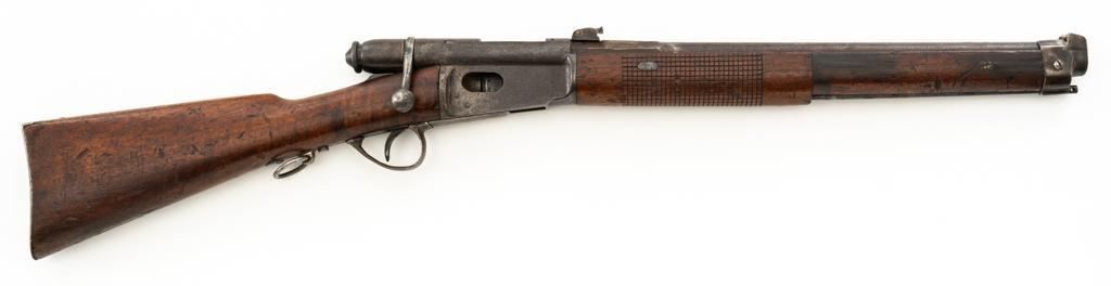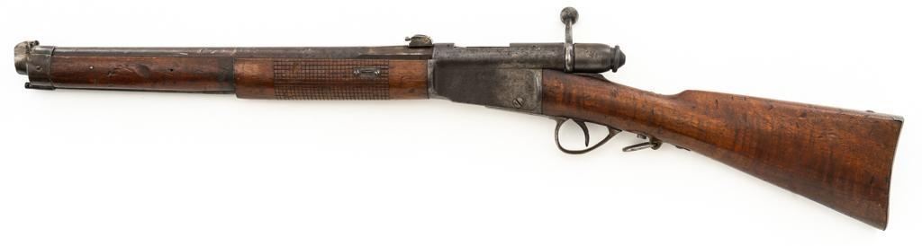 Modified Antique Swiss Model 1869/71 Vetterli Bolt Action Rifle, #97583, .41 Swiss Rimfire cal., barrel has been shortened to 18.25'', with blued finish, straight grip hardwood stock and checkered forend, inverted-''V'' front sight with protectors, and replacement ''V''-notched rear sight. Includes a modified steel cleaning rod and a sling ring has been welded onto the trigger guard tang. Left side of the is receiver marked ''SOC.IND.SUISSE/SYST.VETTERLIN.'' and there are Swiss crosses stamped on the rear receiver bridge and right side of the buttstock. Bolt is numbered but does not match. Rifle was modified by cutting back the forend, shortening the barrel, and attaching a newly fabricated forend cap. Condition overall is fair as modified. Metal retains little finish, with general patina, scratches, and some areas of light pitting. Wood with overall dents, scratches, and some areas of darkening. The old band spring and rear sling swivel recesses have been filled in. There are flat spots visible on the muzzle face and end of the nose cap. Action functions well. Rifling is well-defined but there is darkening and scattered erosion, particularly in the grooves. Missing the cartridge carrier, floorplate, and associated internal components. Est.: $200-$400. (Antique)