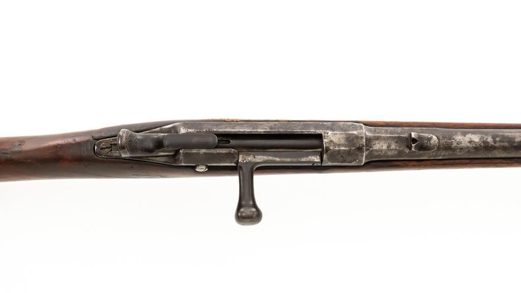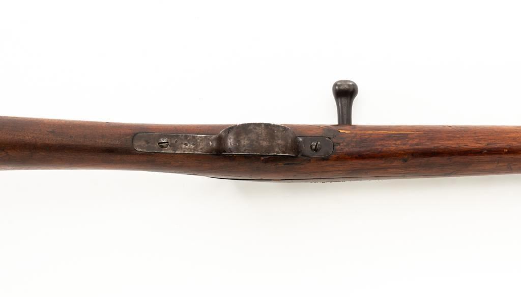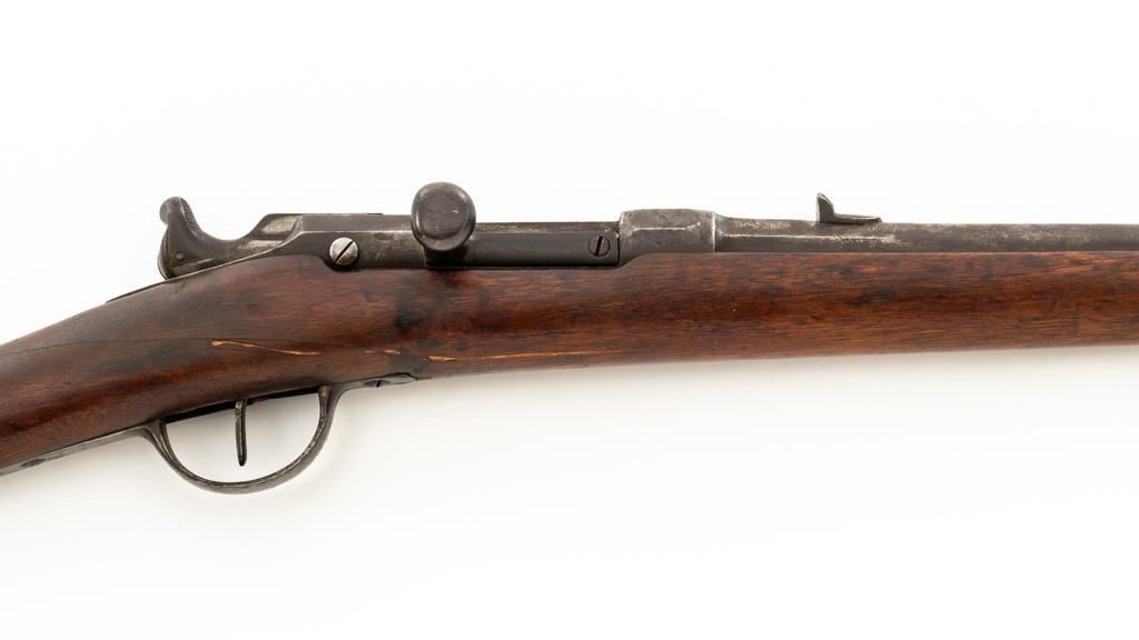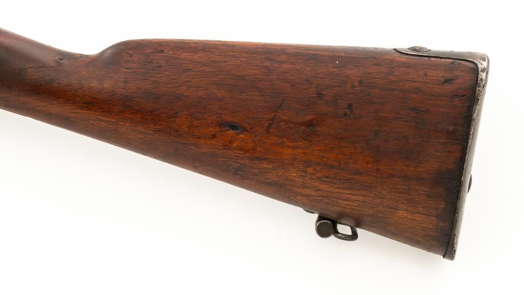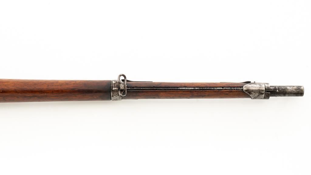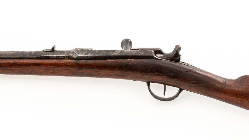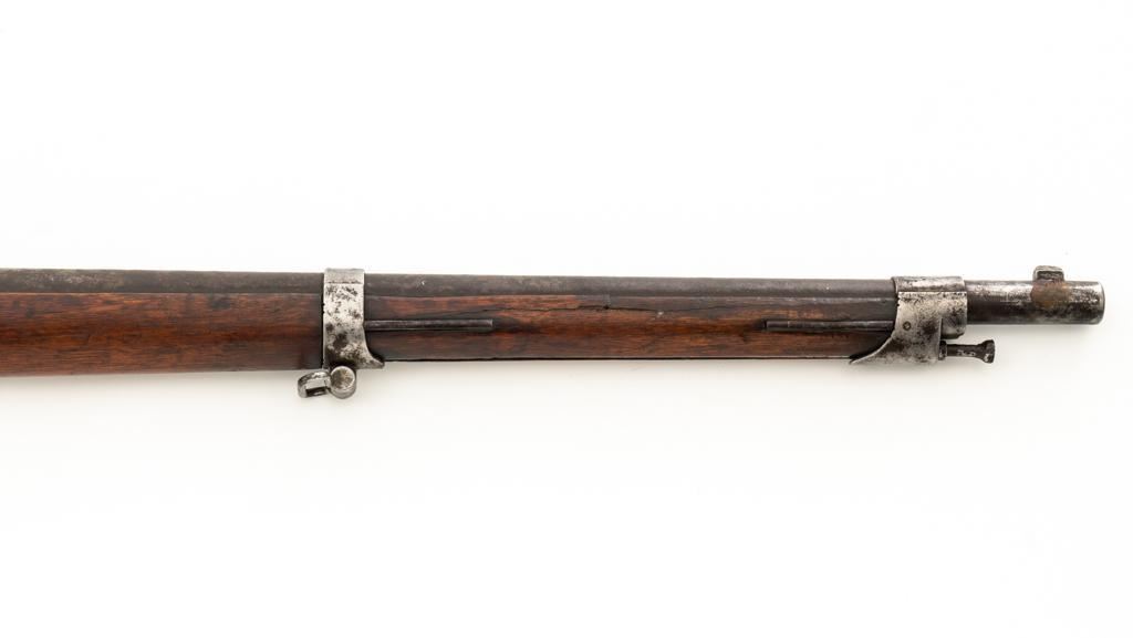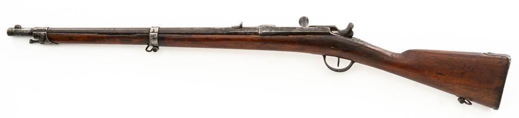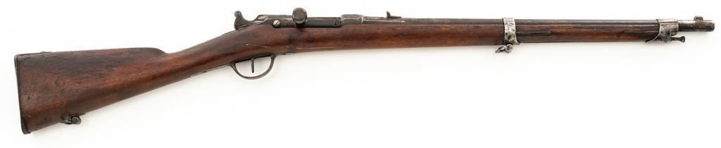 Modified Antique Belgian Made Gras Single Shot Bolt Action Rifle, #D3931, 11x59Rmm cal., 22.25'' barrel, bright finish, hardwood stock, inverted-''V'' front sight, and fixed rear sight with wide ''V''-notch. Includes steel cleaning rod that is in fair condition. Left side of the barrel shank is marked ''AF'', ''Tower'', and ''LEG''; ''M.1867''on the right side. Rifle was modified by removing the bolt head and filing the bolt face. Condition overall is fair, metal is generally dark but does has some cleaned areas on the barrel, receiver, and barrel bands. Stock was broken forward of the wrist and shows evidence of a glued repair on the left side. There are chips and cracks to both sides of the forend. Action functions well. Bore is dark and pitted with worn rifling. Est.: $150-$250. (Antique)