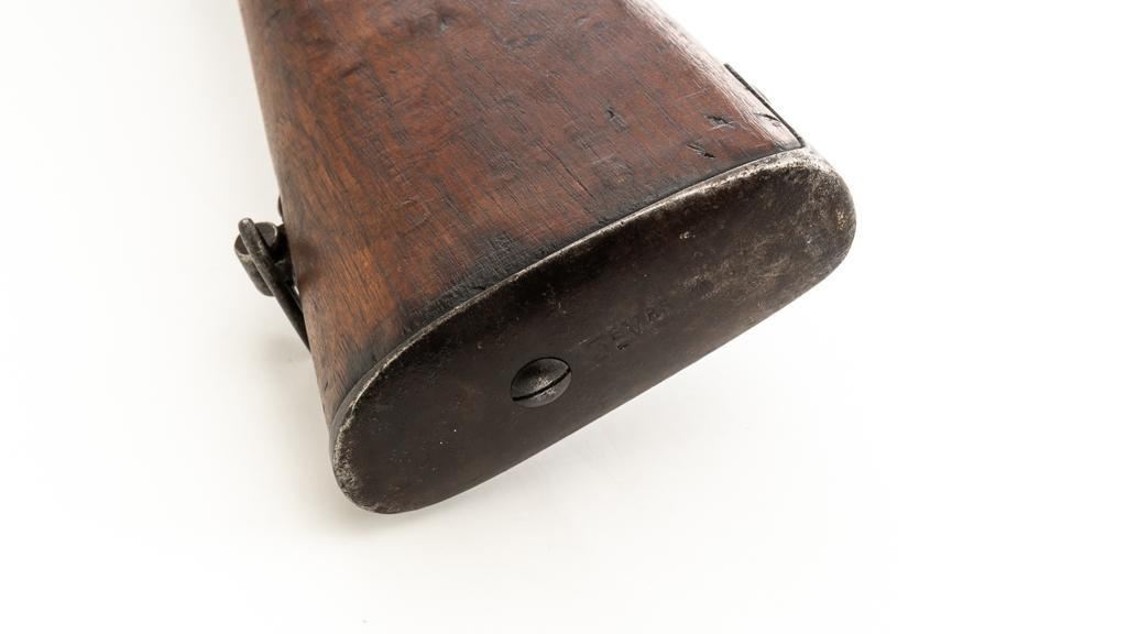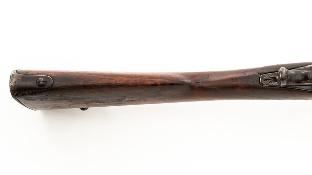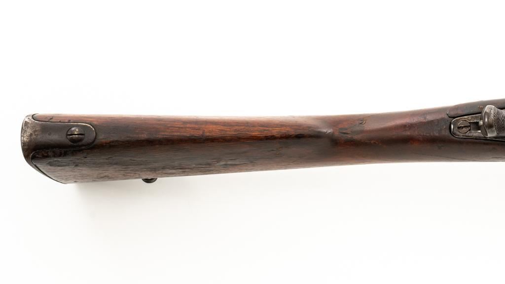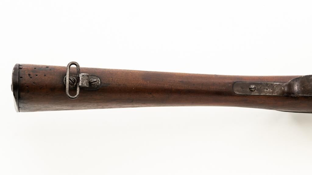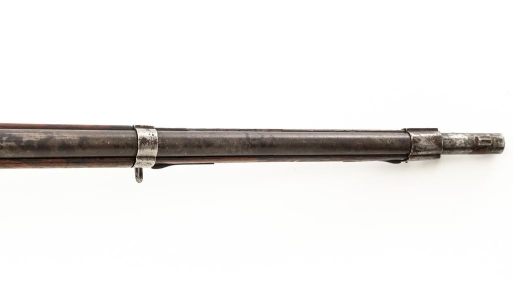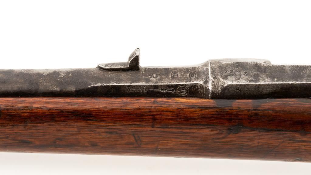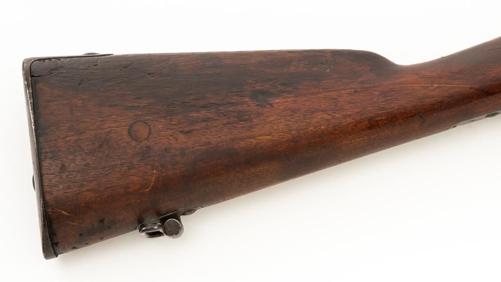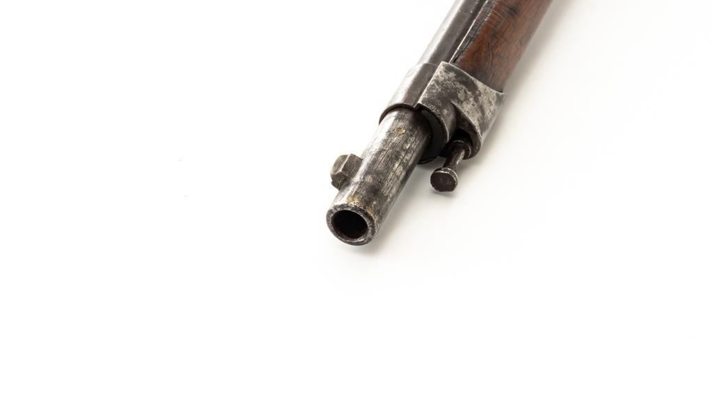 Modified Antique Belgian Made Gras Single Shot Bolt Action Rifle, #D3931, 11x59Rmm cal., 22.25'' barrel, bright finish, hardwood stock, inverted-''V'' front sight, and fixed rear sight with wide ''V''-notch. Includes steel cleaning rod that is in fair condition. Left side of the barrel shank is marked ''AF'', ''Tower'', and ''LEG''; ''M.1867''on the right side. Rifle was modified by removing the bolt head and filing the bolt face. Condition overall is fair, metal is generally dark but does has some cleaned areas on the barrel, receiver, and barrel bands. Stock was broken forward of the wrist and shows evidence of a glued repair on the left side. There are chips and cracks to both sides of the forend. Action functions well. Bore is dark and pitted with worn rifling. Est.: $150-$250. (Antique)