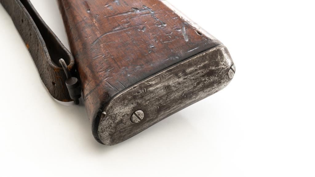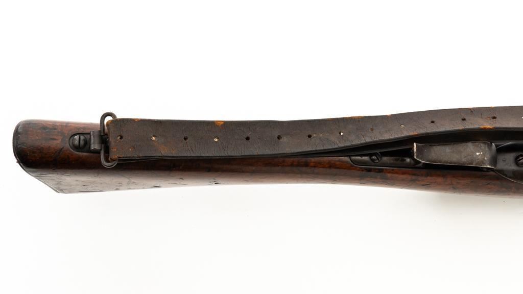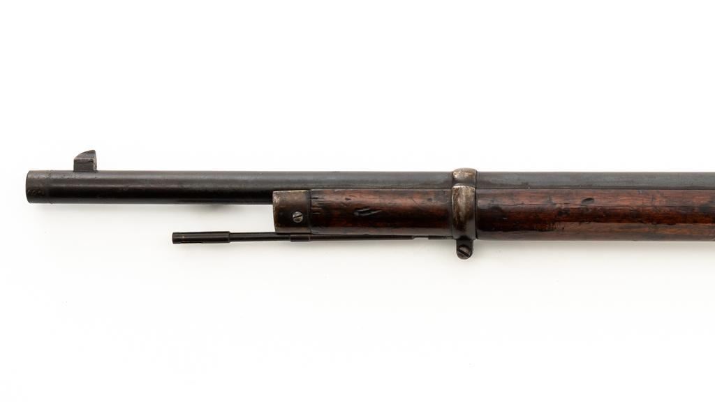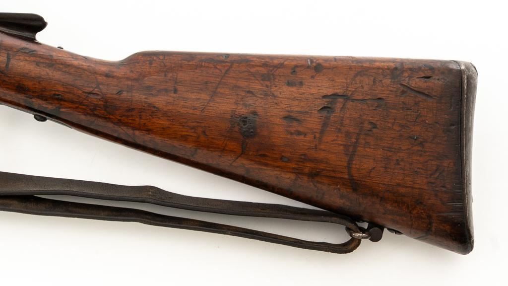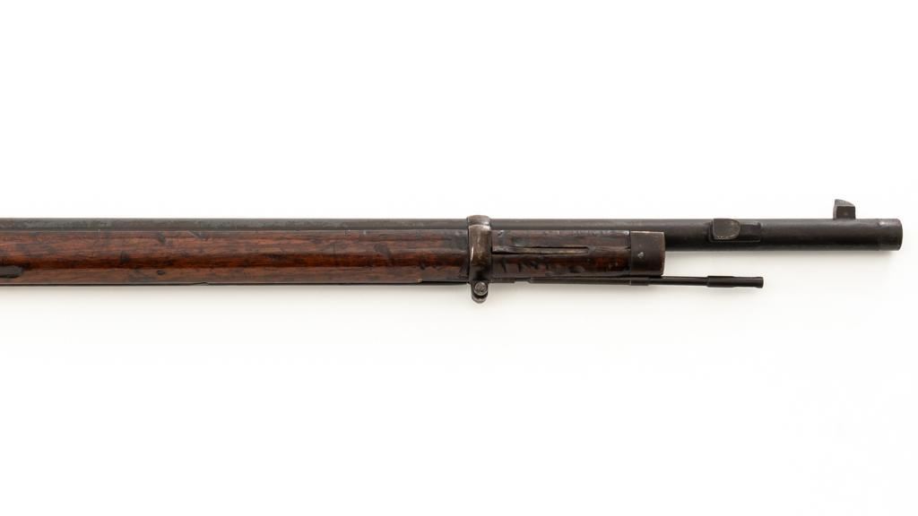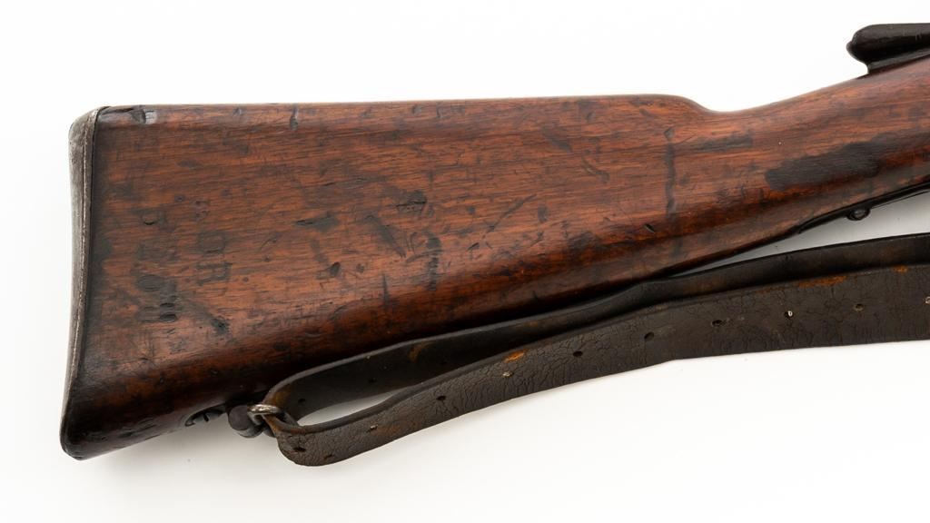 Antique Italian M1870/87 Vetterli Vitali Bolt Action Rifle, #WW5987, 10.4x47Rmm cal., 33.6'' barrel, blued finish, hardwood stock, inverted-''V'' front sight, and adjustable rear sight with ''V''-notch, graduated to 1800 meters. Includes steel cleaning rod and black leather sling. Sling is about good overall, showing age and wear. Rifle is marked ''TORRE ANNUNZIATA'' and import stamped ''MADE IN ITALY'' on the barrel shank; dated ''1883''on the left side. Condition overall is good; metal is dark and partially covered in a flaking varnish. There is wear and brown toning to the barrel bands, magazine, and buttplate. Wood with an added coat of finish, now in good condition, with general wear and darkening. Action operates smoothly. Bore rates fair with visible but worn rifling and would benefit from thorough cleaning. Est.: $300-$500. (Antique)