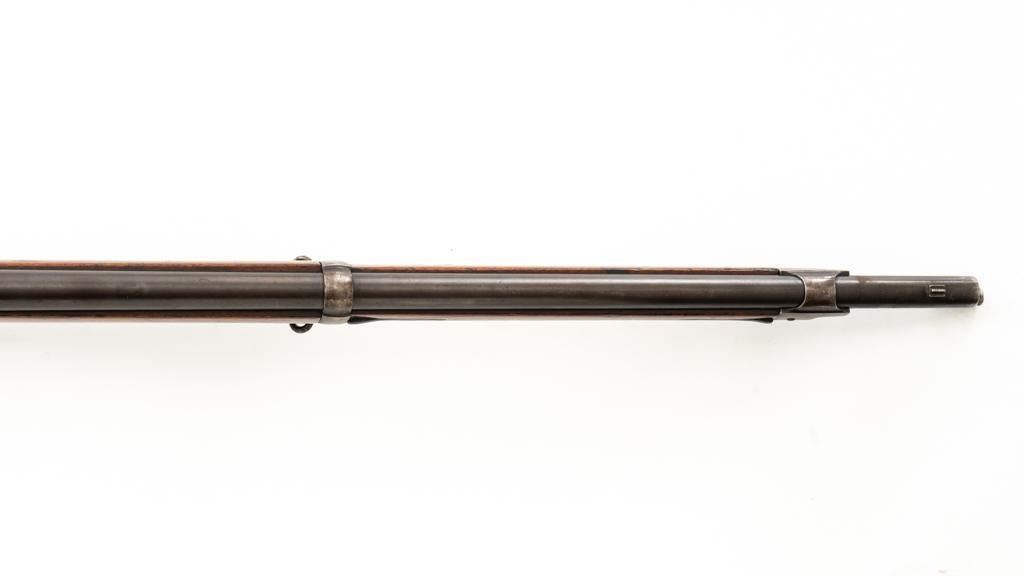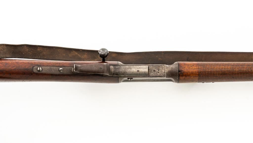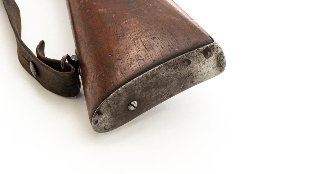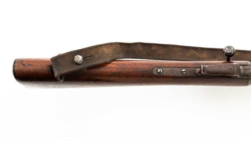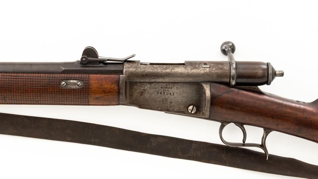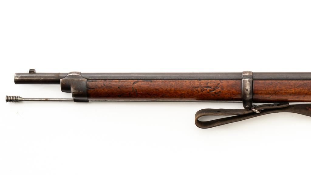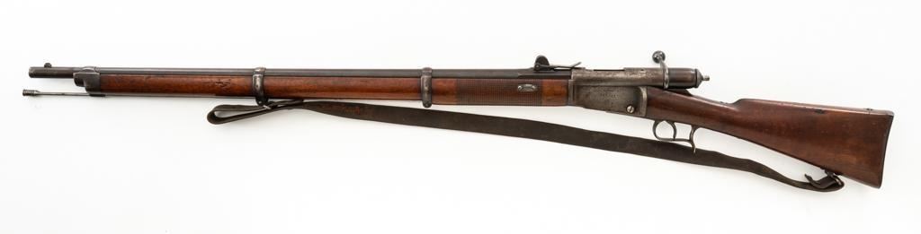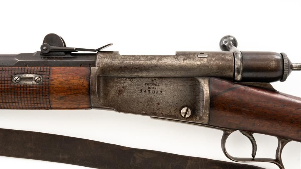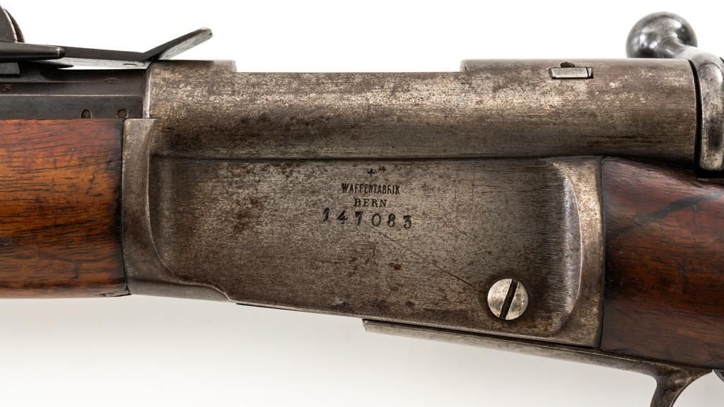 Swiss Model 1869/71 Vetterli Bolt Action Rifle, #147083, .41 Swiss RF cal., 33.1'' barrel, blued finish, hardwood stock with checkered forend, blade front sight, and adjustable leaf rear sight with ''U''-notch, graduated to 1000 meters. Includes a repaired, brown leather sling, now in fair condition. Additionally, there is a steel cleaning rod with broken thread stem. Left side of the receiver is marked ''WAFFENFABRIK/BERN/147083''. There is a faint Swiss Cross over a Shield symbol stamped on right side of the buttstock. Bolt does not match. Condition overall is good, retaining approx. 50% thinning and toning blue, predominantly on the barrel. Wood is good, with general dents and scratches. Action functions smoothly. Bore is fair with pitting and visible rifling. Est:$300-$500. (Antique)
