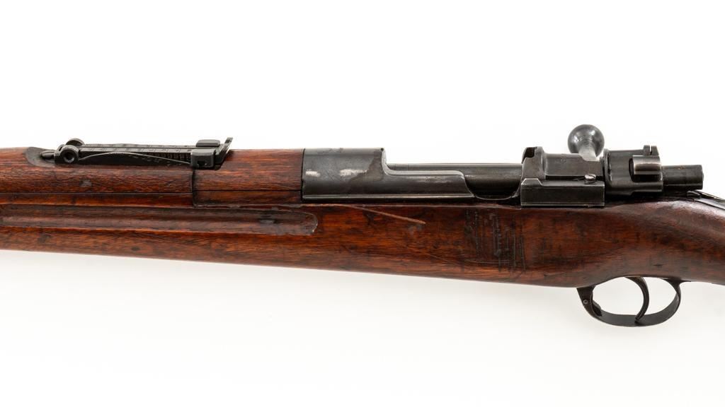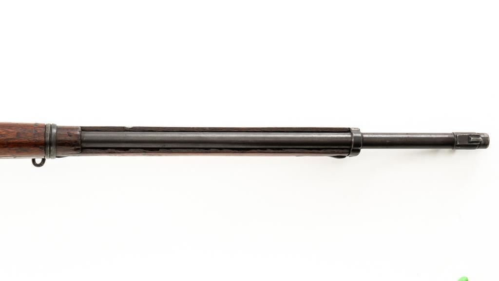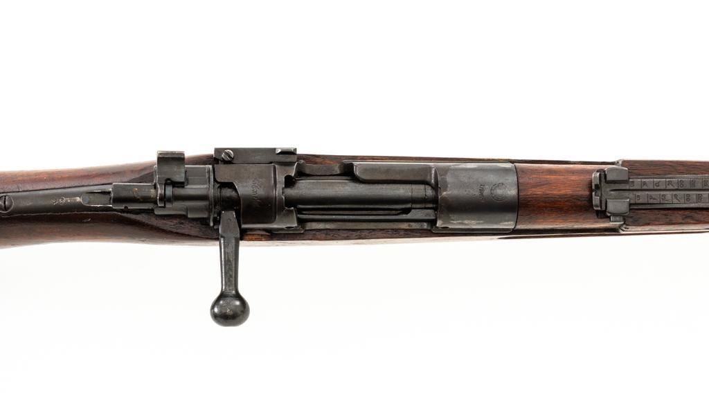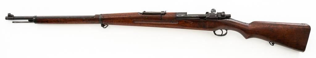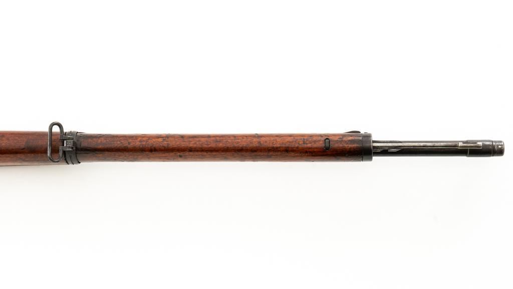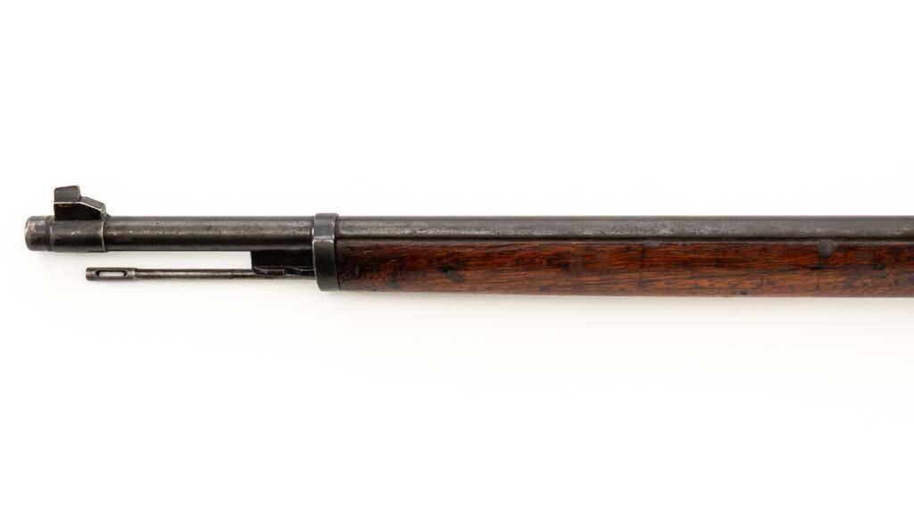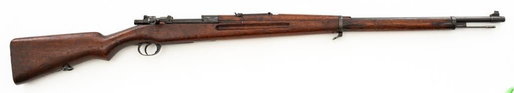 Siamese Type 46/66 Mauser Bolt Action Rifle, #NVSN, 8x52Rmm cal., 29.25'' barrel, blued finish, one-piece hardwood stock and handguard, inverted-''V'' front sight, and adjustable tangent rear sight, with cleaning rod. No dustcover. Marked on top of receiver ring with Chakram symbol over Thai characters representing ''R.S.121''. Thai serial number stamped on the rear receiver bridge. Japanese arsenal markings stamped on left side of the receiver. No visible import marks. Rifle was converted from earlier 8x50Rmm cal. Characters on the rear sight ramp have been partially removed. Metal rates very good overall and retains approx. 80%-85% toning blue finish, with evidence of cleaning to the buttplate. Stock feels secure but is cracked through both sides of the wrist. Otherwise, showing numerous dents and scratches scattered throughout. Action functions well. Bore is bright with very good, defined rifling. Est.: $300-$500. (C&R)