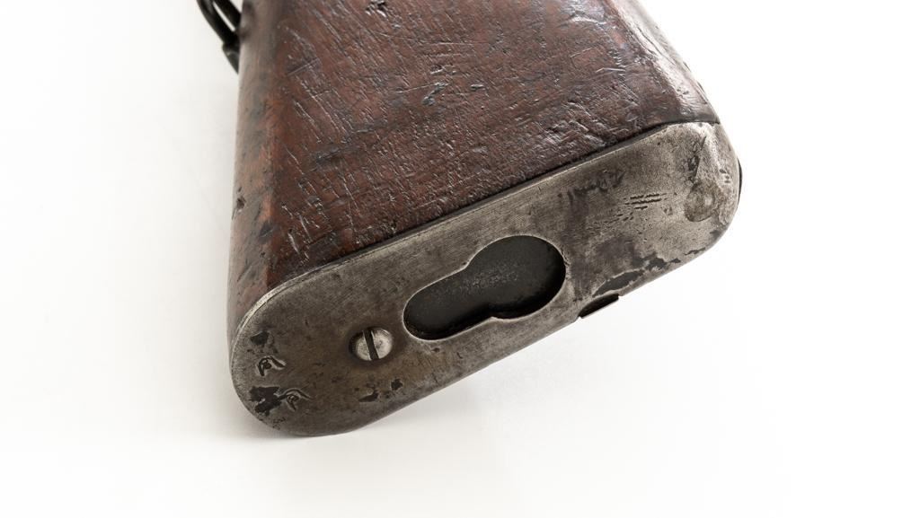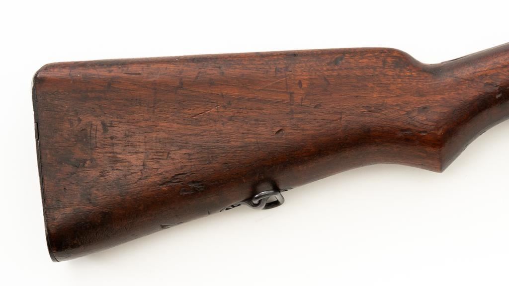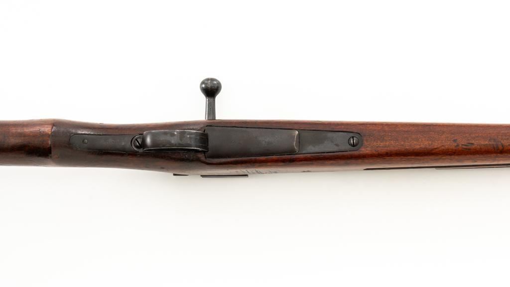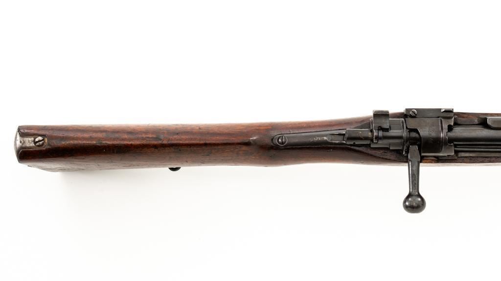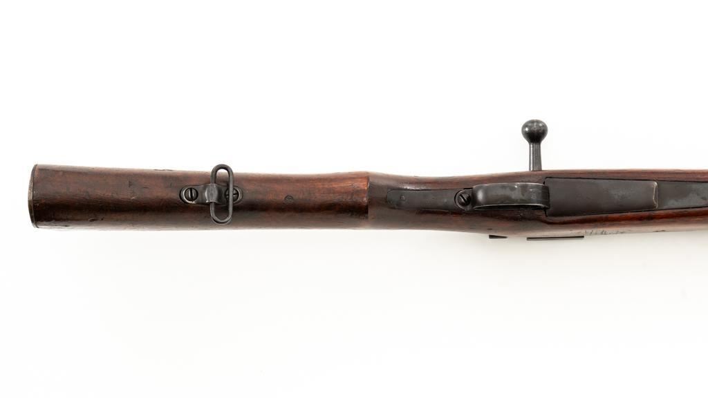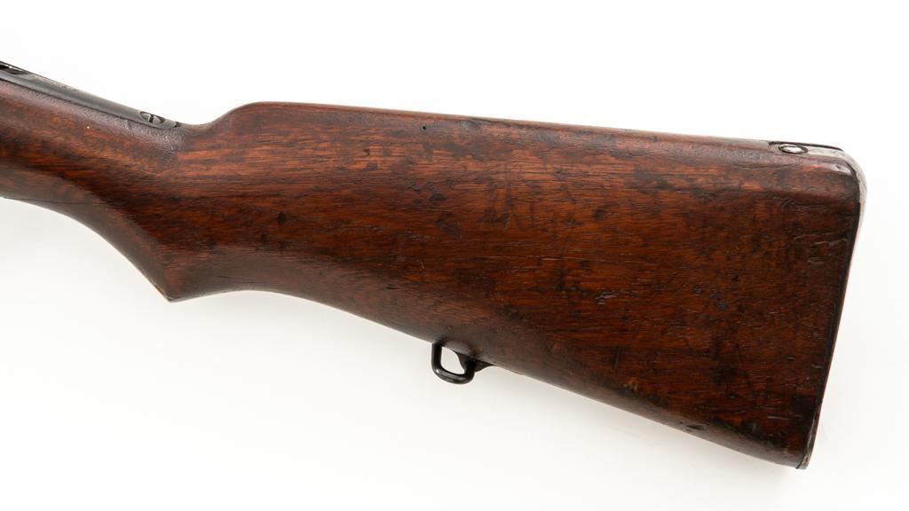 Siamese Type 46/66 Mauser Bolt Action Rifle, #NVSN, 8x52Rmm cal., 29.25'' barrel, blued finish, one-piece hardwood stock and handguard, inverted-''V'' front sight, and adjustable tangent rear sight, with cleaning rod. No dustcover. Marked on top of receiver ring with Chakram symbol over Thai characters representing ''R.S.121''. Thai serial number stamped on the rear receiver bridge. Japanese arsenal markings stamped on left side of the receiver. No visible import marks. Rifle was converted from earlier 8x50Rmm cal. Characters on the rear sight ramp have been partially removed. Metal rates very good overall and retains approx. 80%-85% toning blue finish, with evidence of cleaning to the buttplate. Stock feels secure but is cracked through both sides of the wrist. Otherwise, showing numerous dents and scratches scattered throughout. Action functions well. Bore is bright with very good, defined rifling. Est.: $300-$500. (C&R)