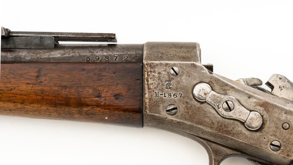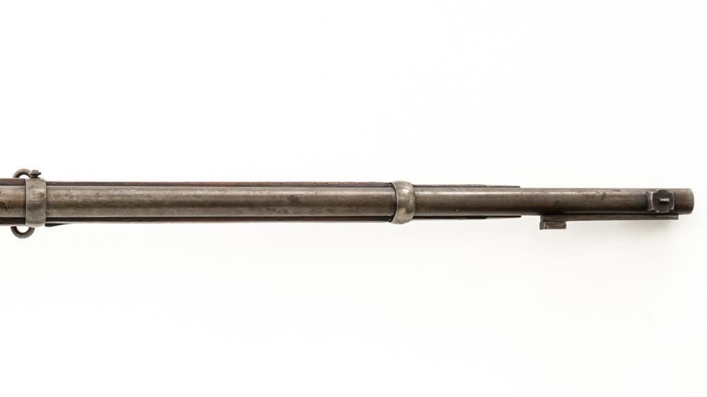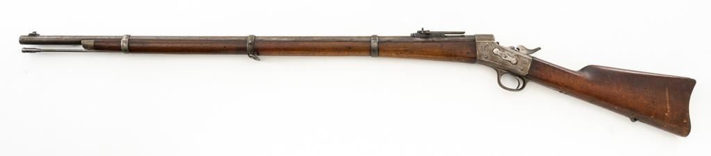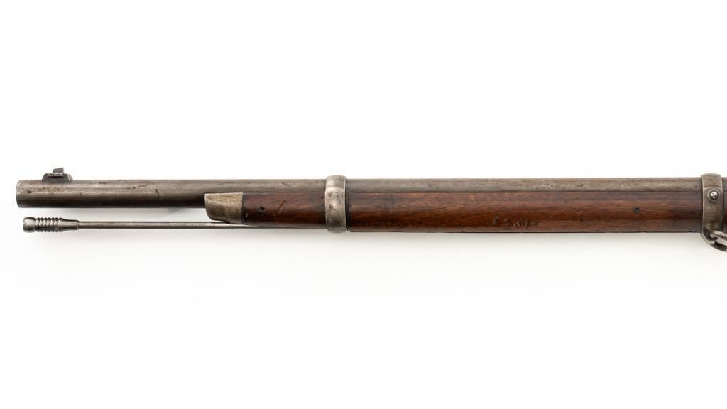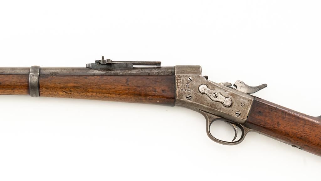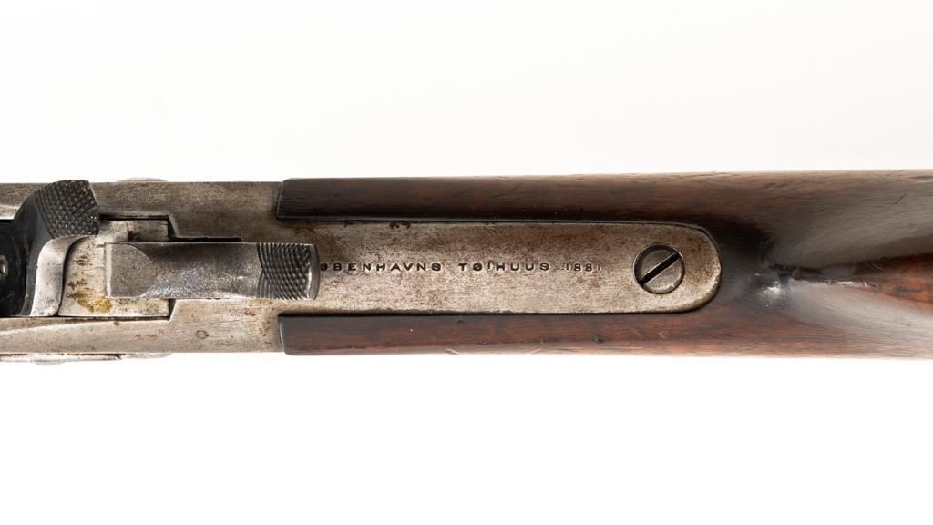 Danish Kjobenhavns Toihuus Model 1867 Rolling Block Single Shot Rifle, #59872, 11.7x51mm cal., 35.5'' barrel with bayonet lug, blue and case hardened finish, straight grip hardwood stock and forend with three barrel bands, inverted-''V'' front sight, and adjustable folding leaf rear sight. Upper tang is marked ''Kjobenhavns Toihuus 1881''. Rifle is in overall good to very good condition, displaying an even brown/gray patina to the metal surfaces. Factory lettering is clear. Wood is very good with scattered moderate dents and scratches, pleasing grain patterns, and considerable rich oil finish remaining. Action functions smoothly. Bore is near excellent with well-defined rifling. Est.: $500-$700. (Antique)