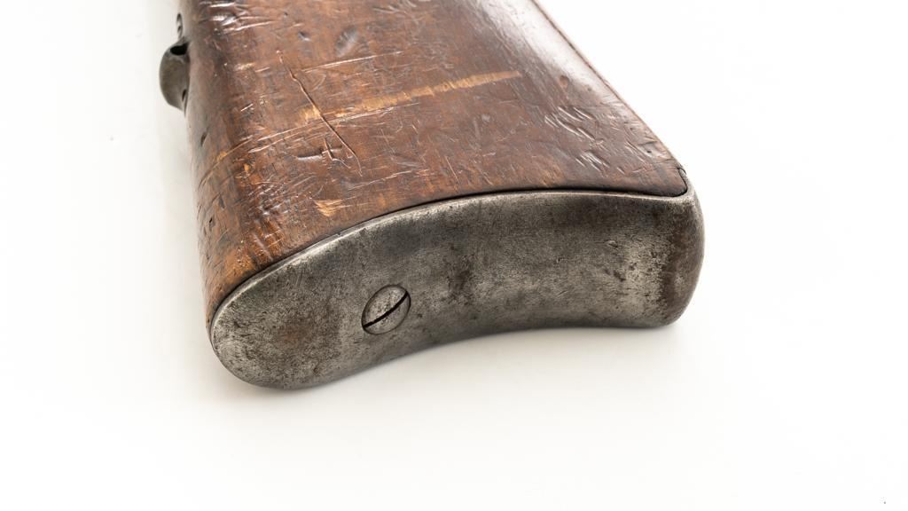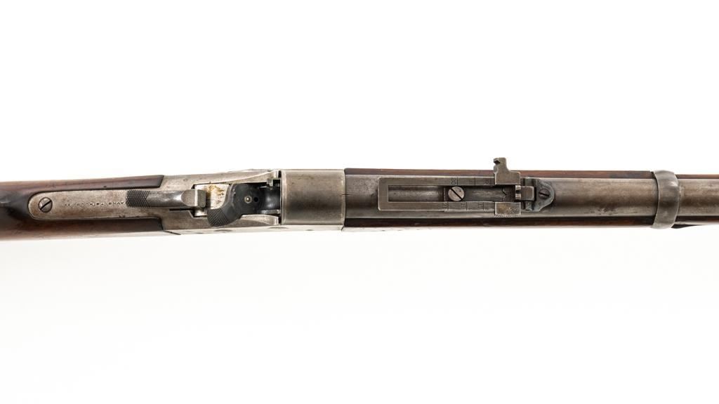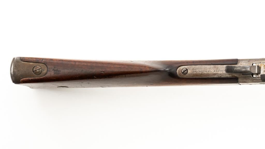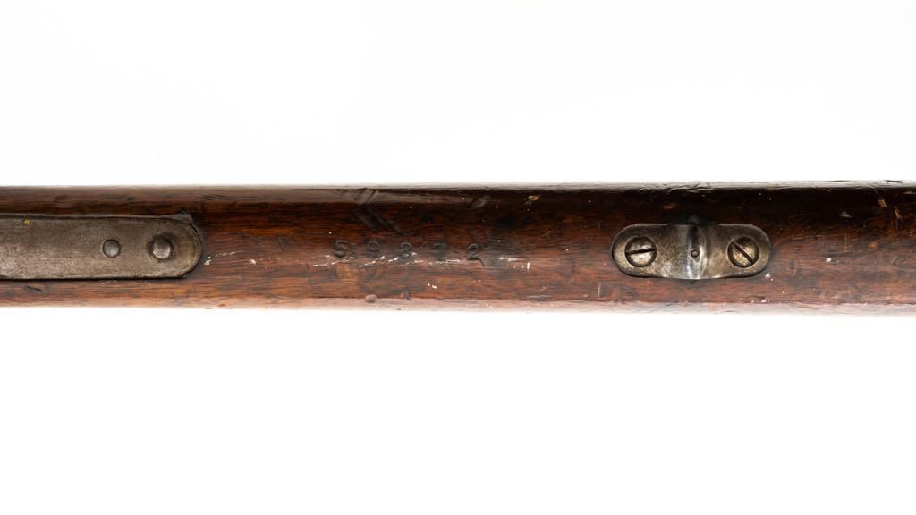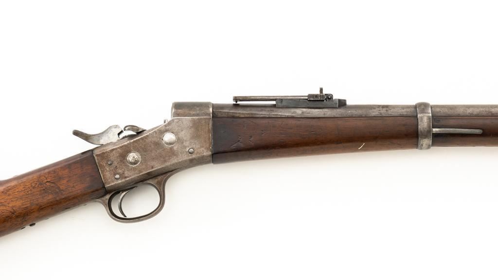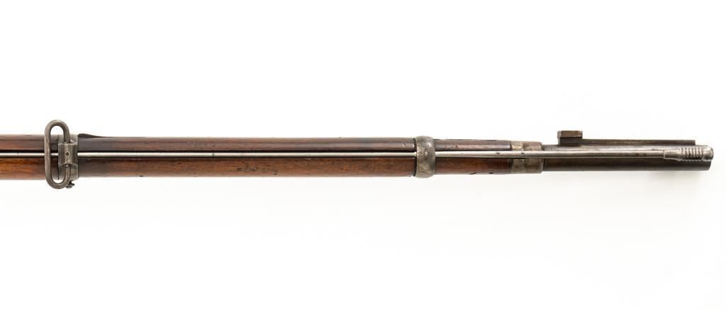 Danish Kjobenhavns Toihuus Model 1867 Rolling Block Single Shot Rifle, #59872, 11.7x51mm cal., 35.5'' barrel with bayonet lug, blue and case hardened finish, straight grip hardwood stock and forend with three barrel bands, inverted-''V'' front sight, and adjustable folding leaf rear sight. Upper tang is marked ''Kjobenhavns Toihuus 1881''. Rifle is in overall good to very good condition, displaying an even brown/gray patina to the metal surfaces. Factory lettering is clear. Wood is very good with scattered moderate dents and scratches, pleasing grain patterns, and considerable rich oil finish remaining. Action functions smoothly. Bore is near excellent with well-defined rifling. Est.: $500-$700. (Antique)
