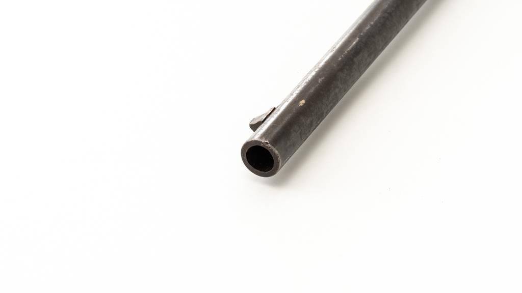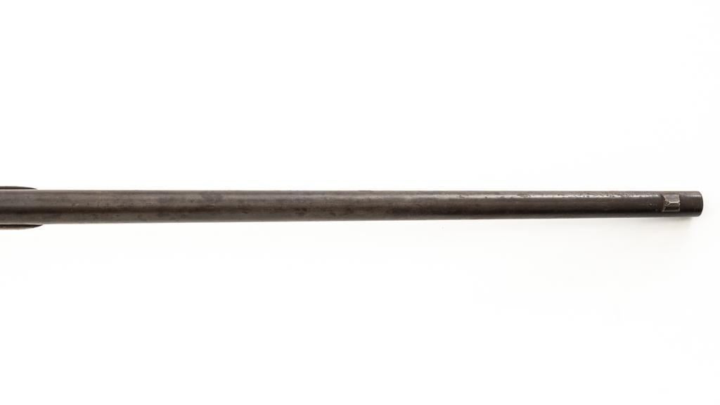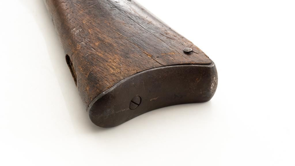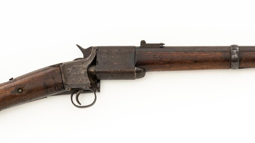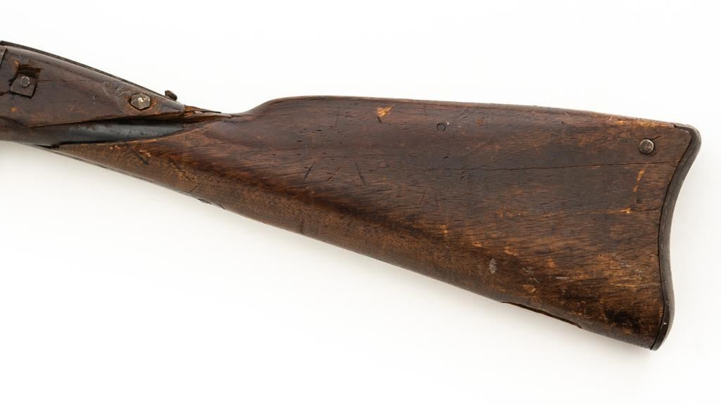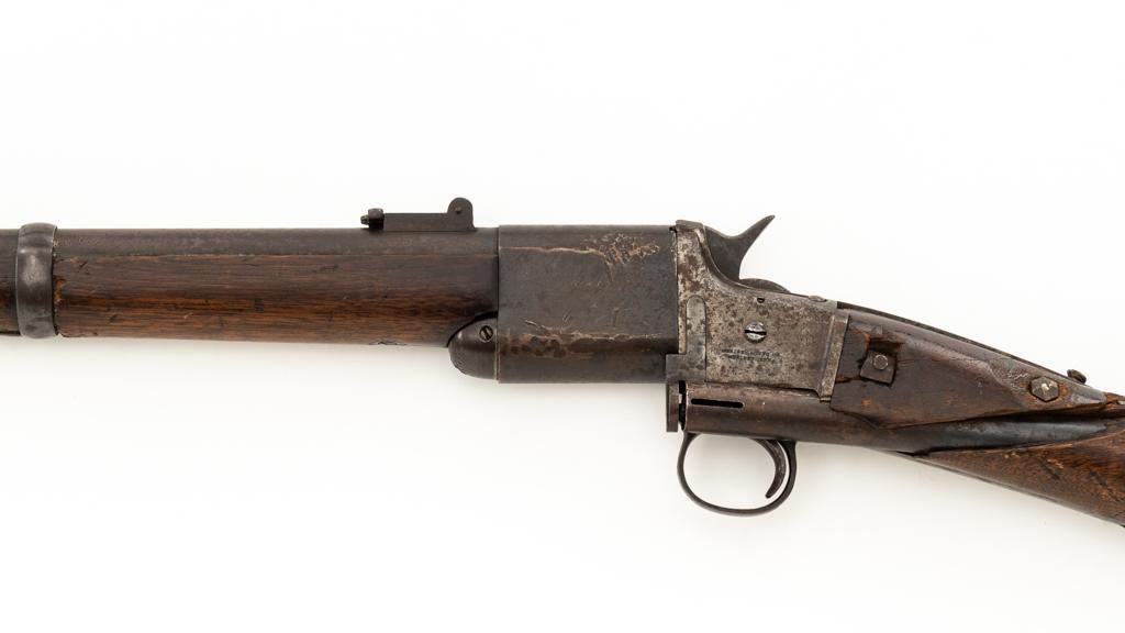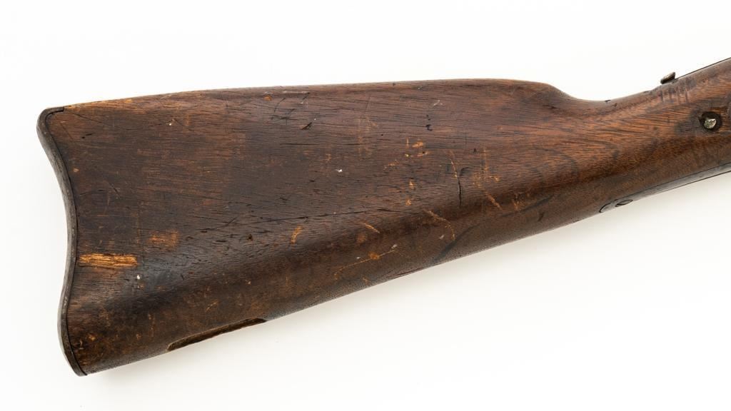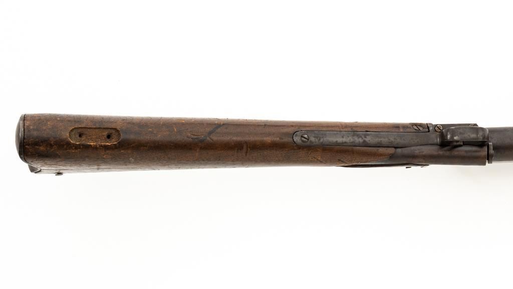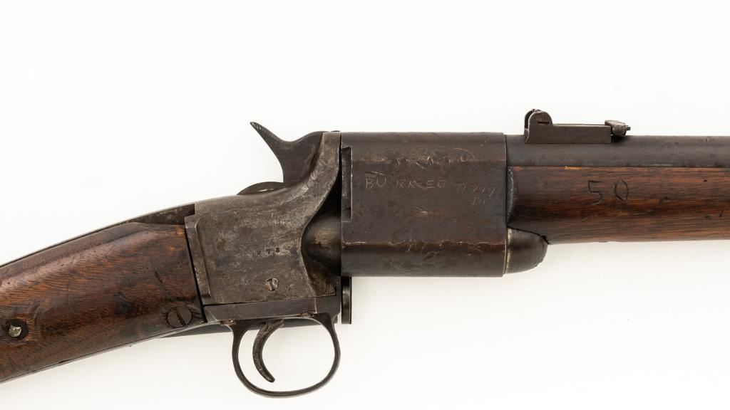 Triplett & Scott Repeating Rifle Made by Meriden Mfg. Co., #978, .50 RF cal., 30'' barrel, originally with blue and case hardened finish; hardwood buttstock and forend. Approx. 5,000 were manufactured circa 1864-1865. Condition is fair overall, showing much age and wear. Metal is uncleaned. Buttstock was crudely repaired at the wrist many years ago. It also has two old losses and a vertical crack along the top of the buttstock. Sling swivel/base are missing. Forend is overall good, with ''50'' carved into the rear right side. Markings are good. Action is not working. Bore is fair to good with defined rifling and scattered light erosion. Est.: $800-$1,000. (Antique)