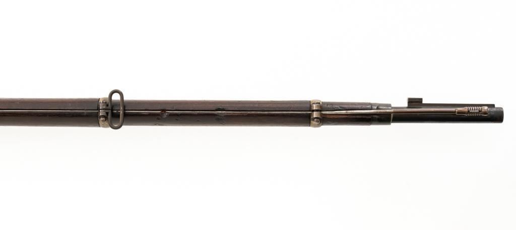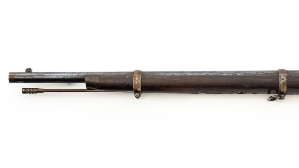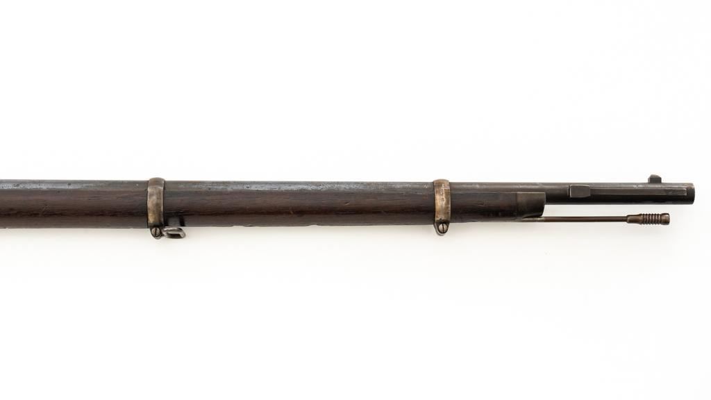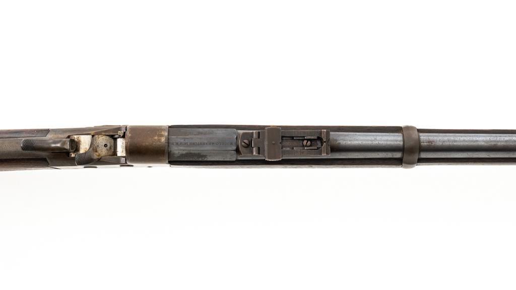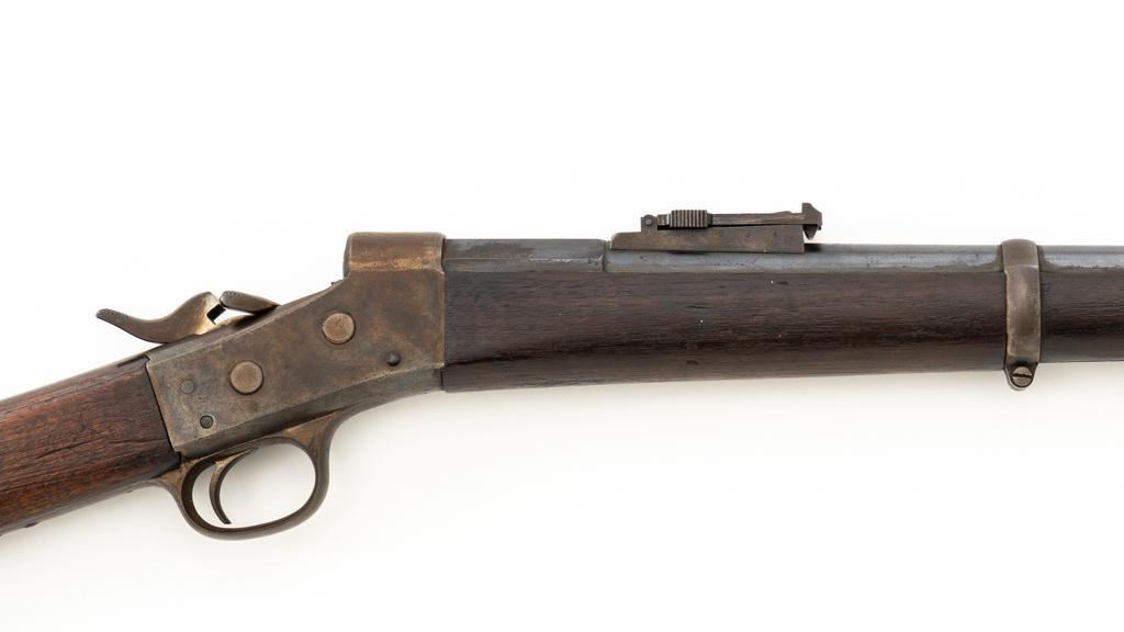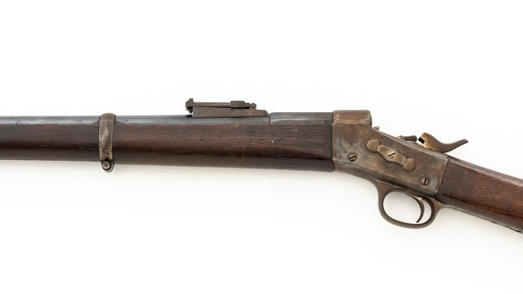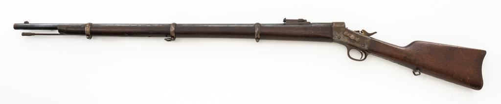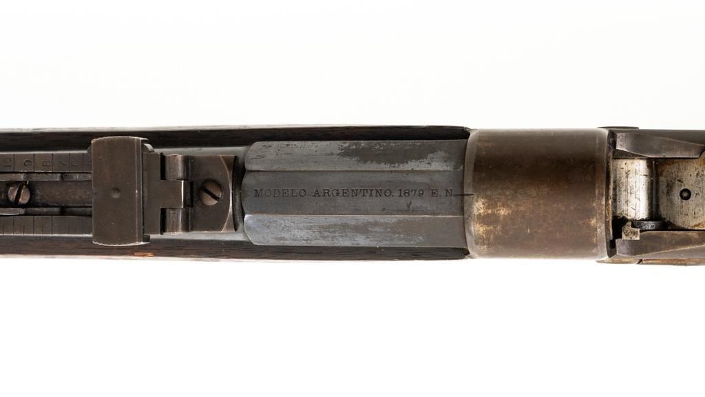 Argentine Model 1879 Remington Rolling Block Single Shot Rifle, #NVSN, .43 Spanish cal., 36'' barrel with bayonet lug, blued with case hardened receiver, straight grip walnut stock and forend with three barrel bands, fixed inverted-''V'' front sight, and adjustable rear sights, with ramrod. Marked on the top barrel flat near the breech ''MODELO ARGENTINO . 1879 E.N.'' Rifle is in overall very good to fine condition, displaying most of its blue finish, with mild frosting and patina to the barrel. Case colors show general muting and toning and are strongest on the sides. Factory lettering is legible. Buttstock and forend are very good+, with pleasing hardwood grain patterns, scattered mostly moderate dents and scratches, including a few more noticeable impressions along the ramrod channel. Additionally, there are three ''kill notches'' on bottom of the wrist. Action is crisp. Bore is fine with well-defined rifling. Est.: $500-$700. (Antique)