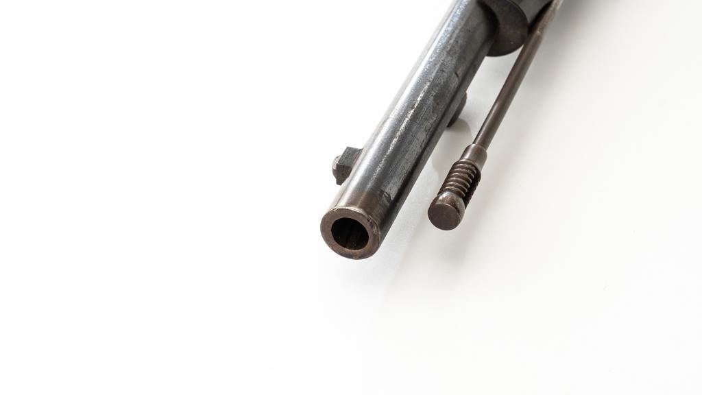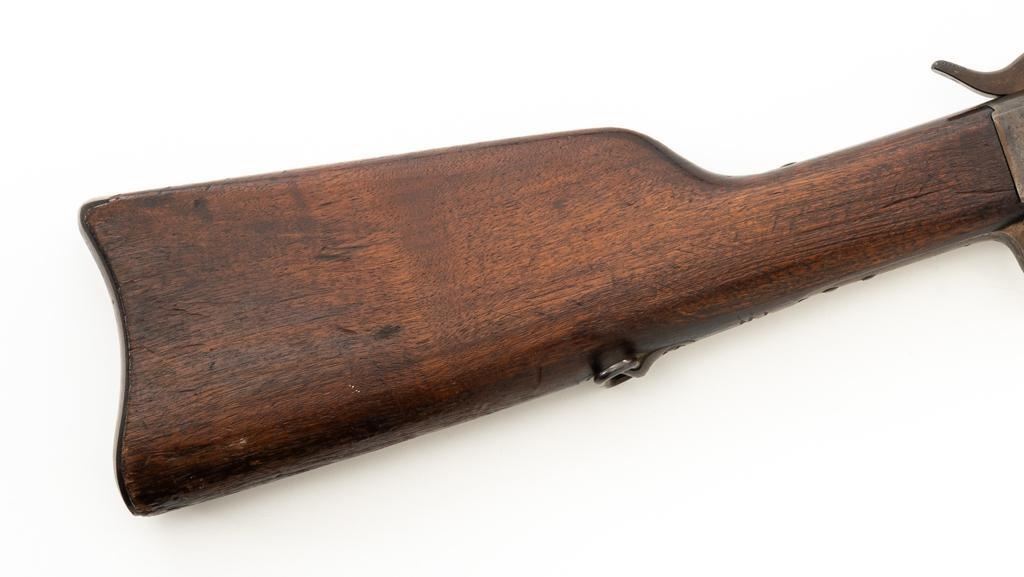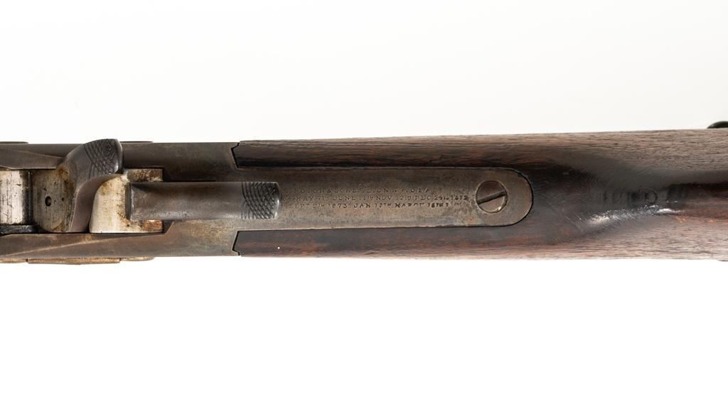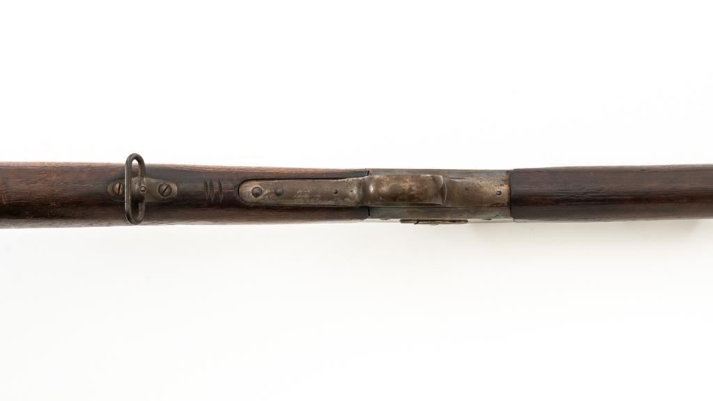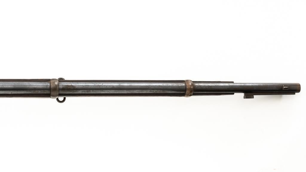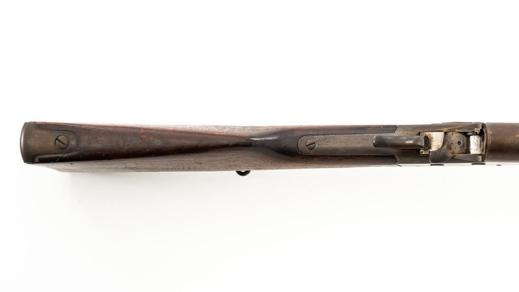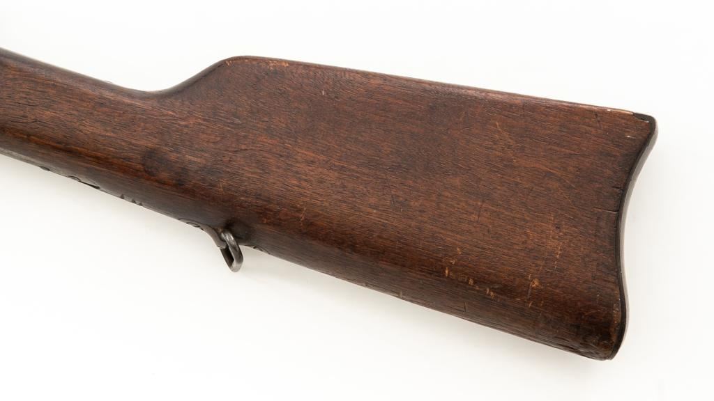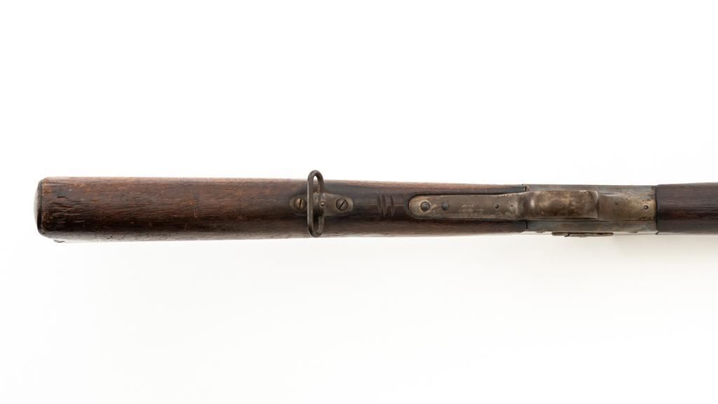 Argentine Model 1879 Remington Rolling Block Single Shot Rifle, #NVSN, .43 Spanish cal., 36'' barrel with bayonet lug, blued with case hardened receiver, straight grip walnut stock and forend with three barrel bands, fixed inverted-''V'' front sight, and adjustable rear sights, with ramrod. Marked on the top barrel flat near the breech ''MODELO ARGENTINO . 1879 E.N.'' Rifle is in overall very good to fine condition, displaying most of its blue finish, with mild frosting and patina to the barrel. Case colors show general muting and toning and are strongest on the sides. Factory lettering is legible. Buttstock and forend are very good+, with pleasing hardwood grain patterns, scattered mostly moderate dents and scratches, including a few more noticeable impressions along the ramrod channel. Additionally, there are three ''kill notches'' on bottom of the wrist. Action is crisp. Bore is fine with well-defined rifling. Est.: $500-$700. (Antique)