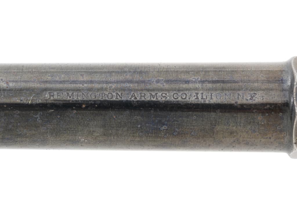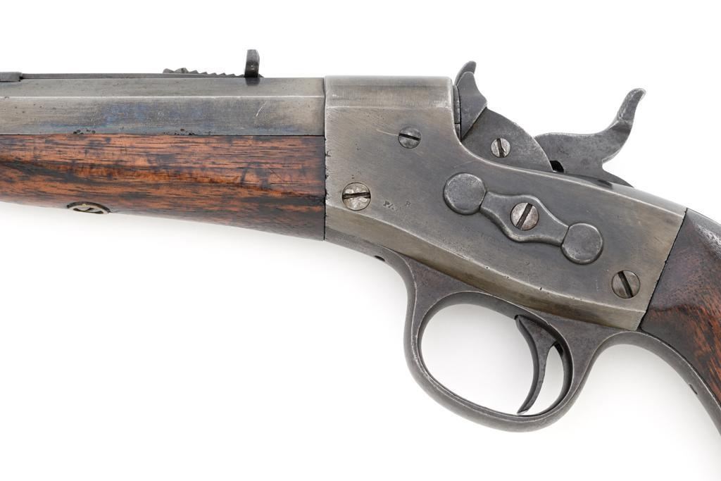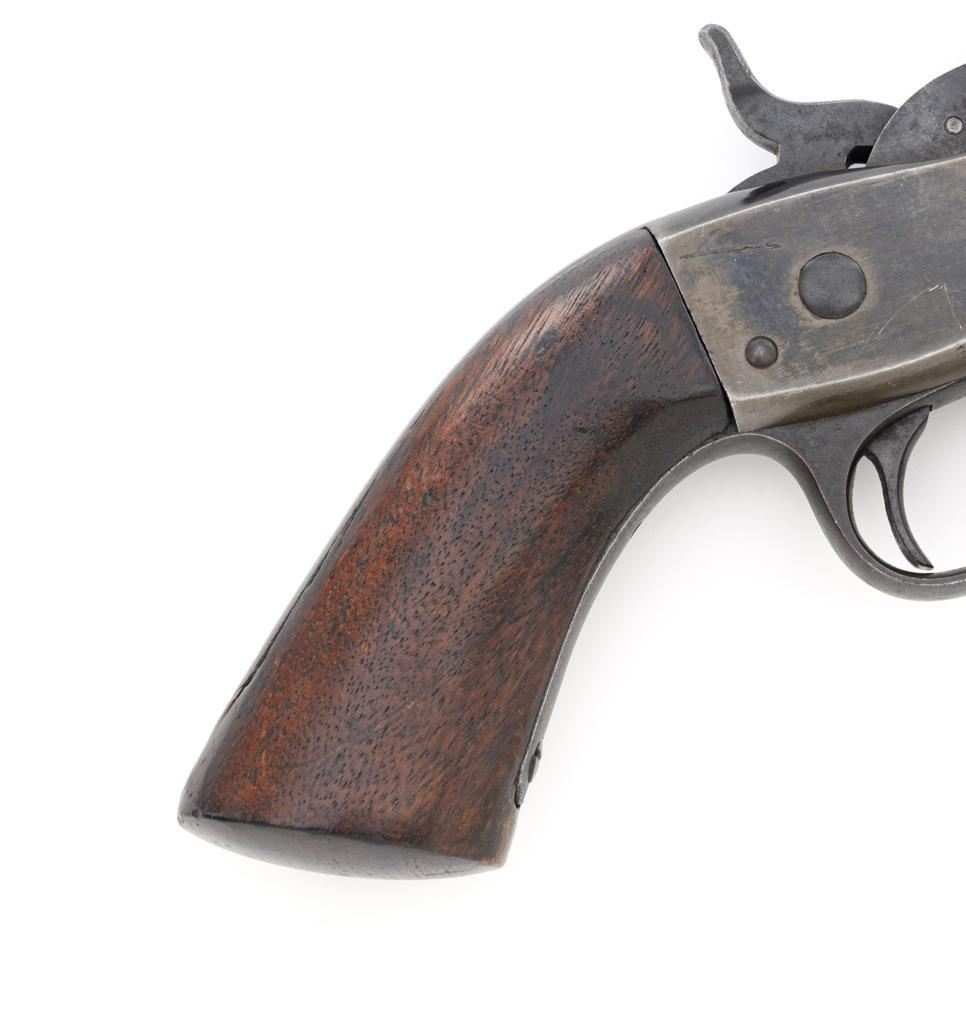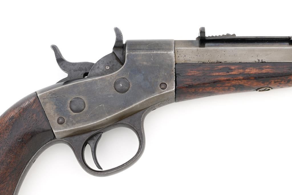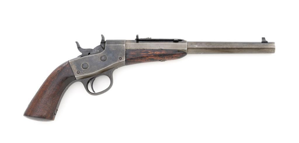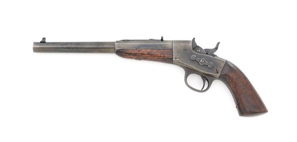 Remington Model 1891 Target Single Shot Rolling Block Pistol, #13, .22 cal., 10'' half-round/half-octagon barrel, blued finish, smooth hardwood grip and forend, dovetailed blade front sight, and semi-buckhorn rear sight. Top of the barrel is marked ''REMINGTON ARMS CO. ILLION, N.Y.'' Portion of the markings on left side of the frame are barely legible. The overall condition is good, retaining approx. 60% reblued finish; balance with straw colored hues. New finish was applied over areas of pinprick pitting. Wood shows general age and handling wear; especially the forend which has been revarnished and has old age cracks on the left side. Barrel address is clearly visible. Action functions well. Bore is very good, no visible erosion or frosting; rifling is clearly defined. Est.: $500-$800. (Antique) (Michael Streitbeck Collection)