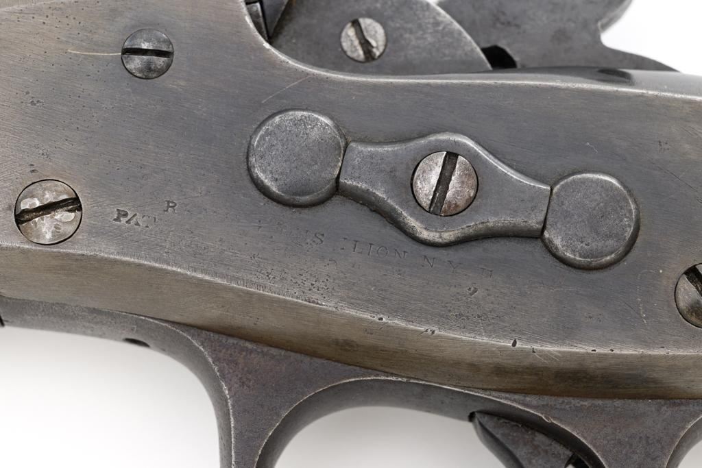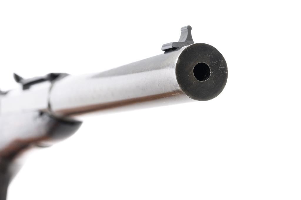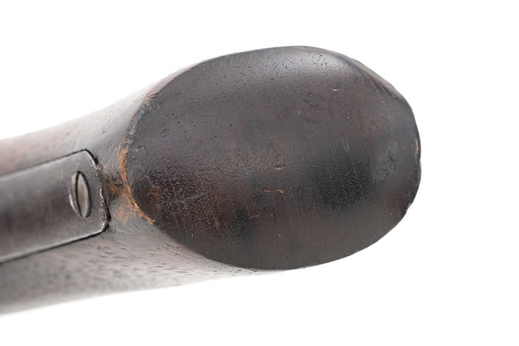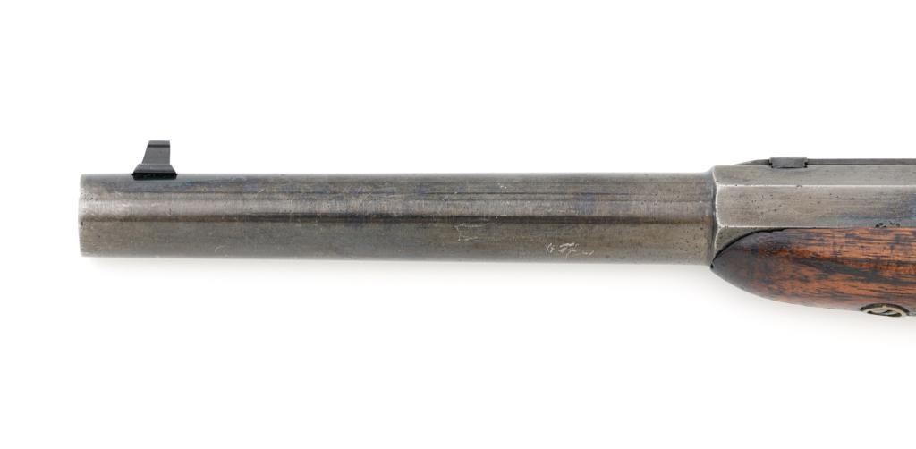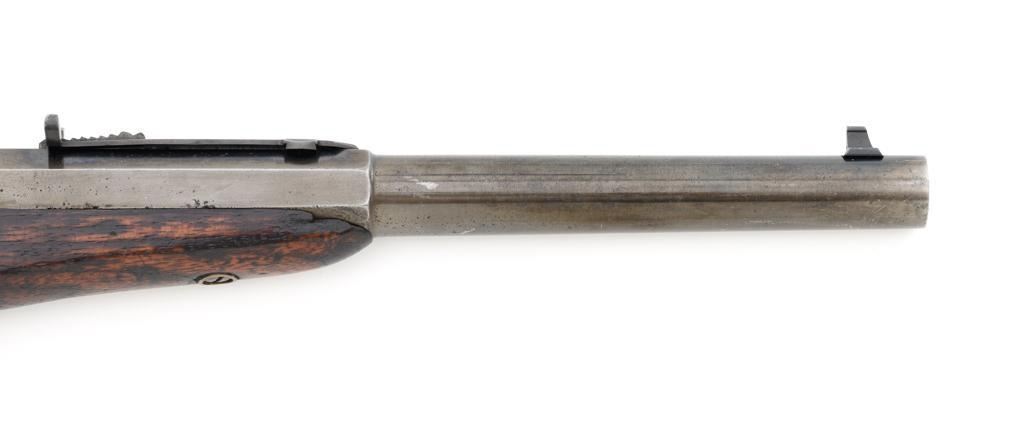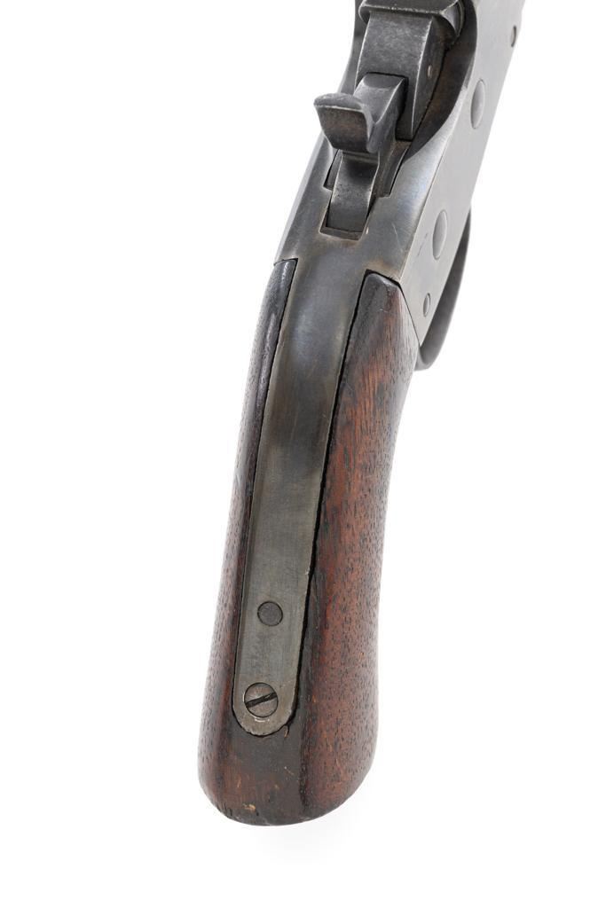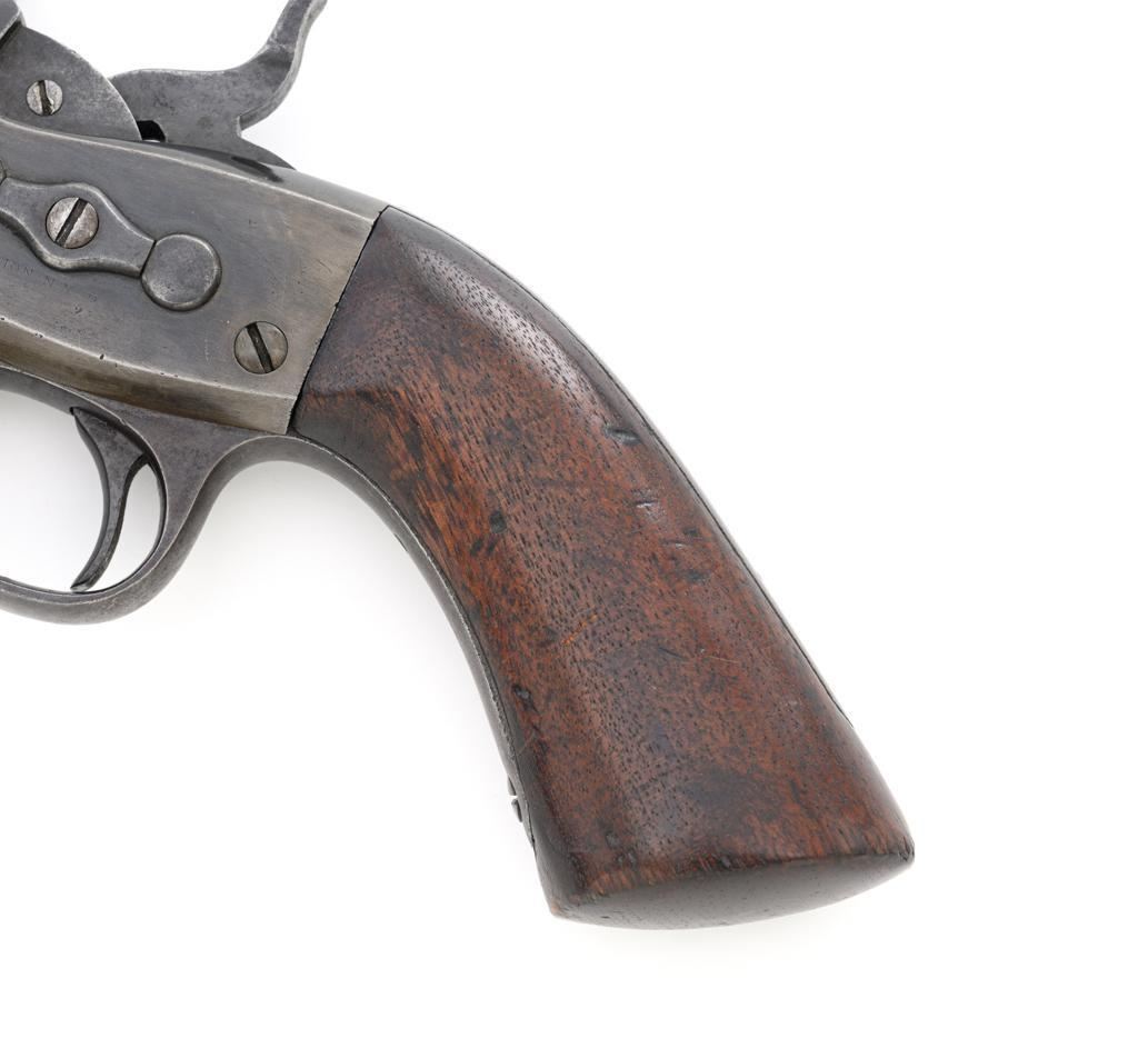Remington Model 1891 Target Single Shot Rolling Block Pistol, #13, .22 cal., 10'' half-round/half-octagon barrel, blued finish, smooth hardwood grip and forend, dovetailed blade front sight, and semi-buckhorn rear sight. Top of the barrel is marked ''REMINGTON ARMS CO. ILLION, N.Y.'' Portion of the markings on left side of the frame are barely legible. The overall condition is good, retaining approx. 60% reblued finish; balance with straw colored hues. New finish was applied over areas of pinprick pitting. Wood shows general age and handling wear; especially the forend which has been revarnished and has old age cracks on the left side. Barrel address is clearly visible. Action functions well. Bore is very good, no visible erosion or frosting; rifling is clearly defined. Est.: $500-$800. (Antique) (Michael Streitbeck Collection)
