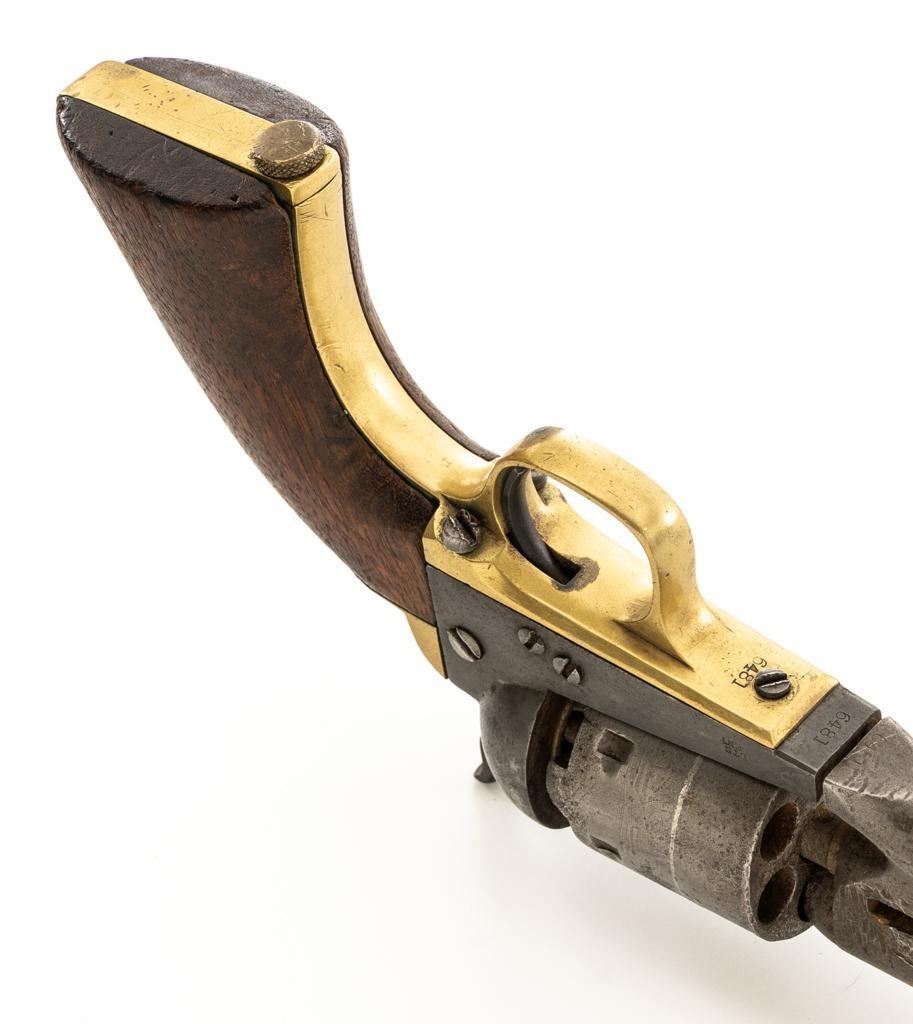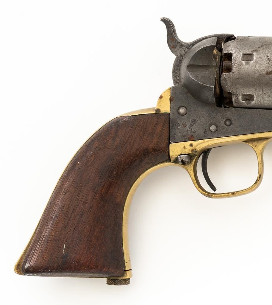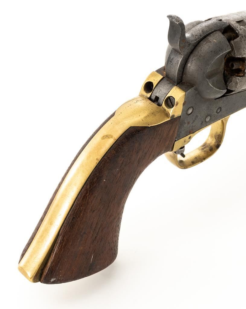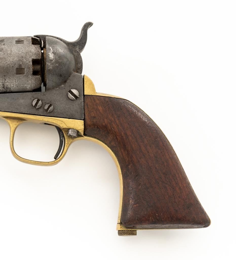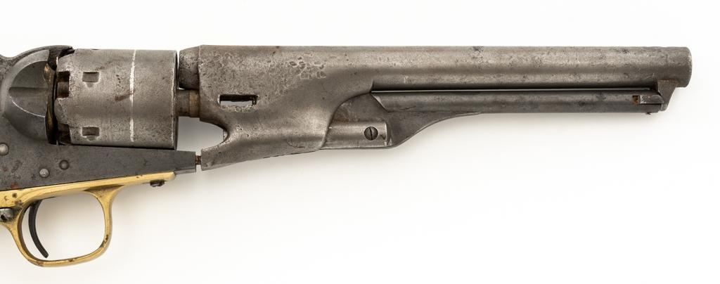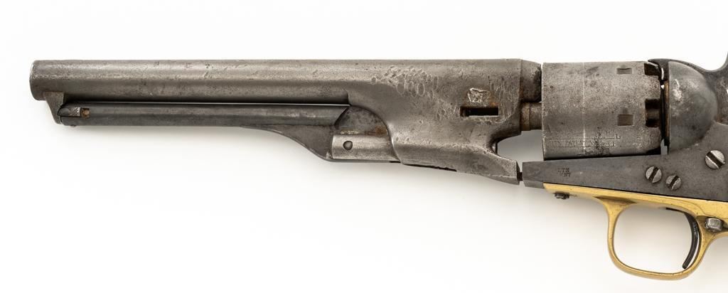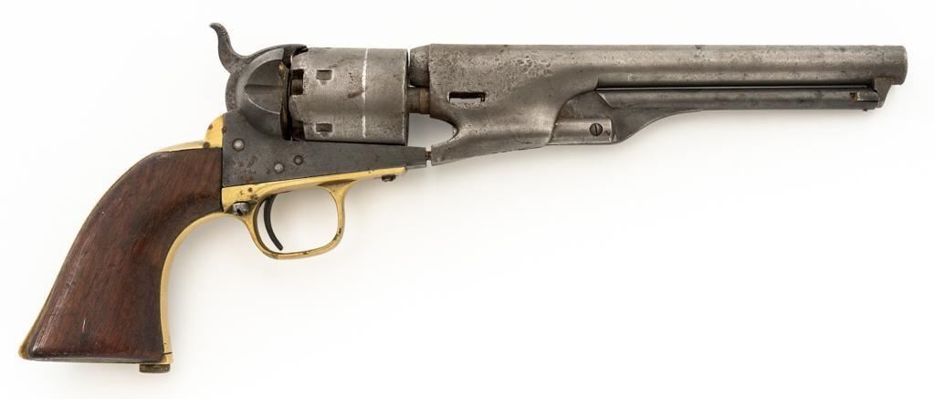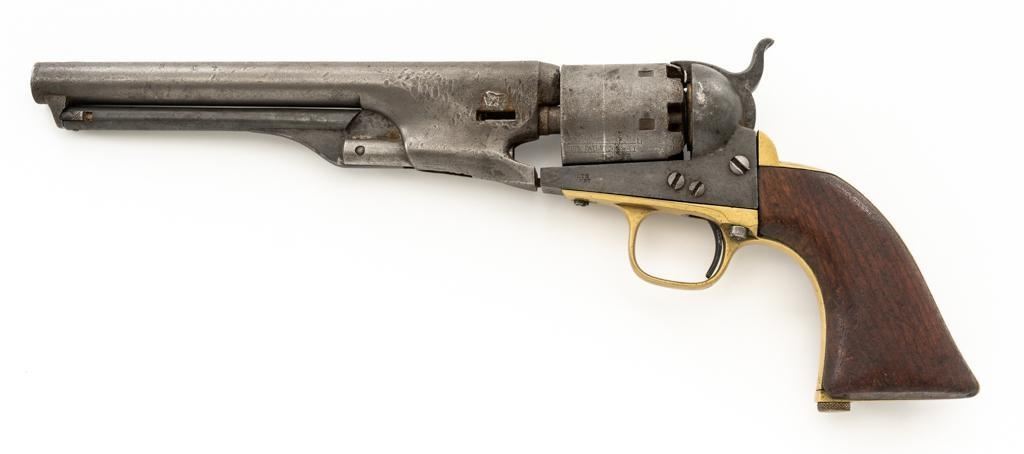 Colt Model 1861 Navy Percussion Revolver, #6481, .36 cal., 7.5'' round barrel, no finish, brass trigger guard/backstrap, smooth walnut grips, missing front blade sight, with ''V''-notched rear sight located on the hammer. The barrel address is correct for this Model. Mfg'd 1862. The overall condition of this revolver is fair, with an even gray patina, scattered old nicks and mars. Grips are good, showing moderate age and wear, with pleasing grain patterns, and thin piece missing from back edge on the right side. Both sides show shrinkage, leaving the edge of the frame visible. The action is not working and may be missing parts. Barrel wedge is missing, wedge screw is damaged, plus the trigger guard screws and base backstrap screw are replacements. Bore is fair with visible rifling, and scattered light to moderate erosion. Est.: $400-$700. (Antique)
