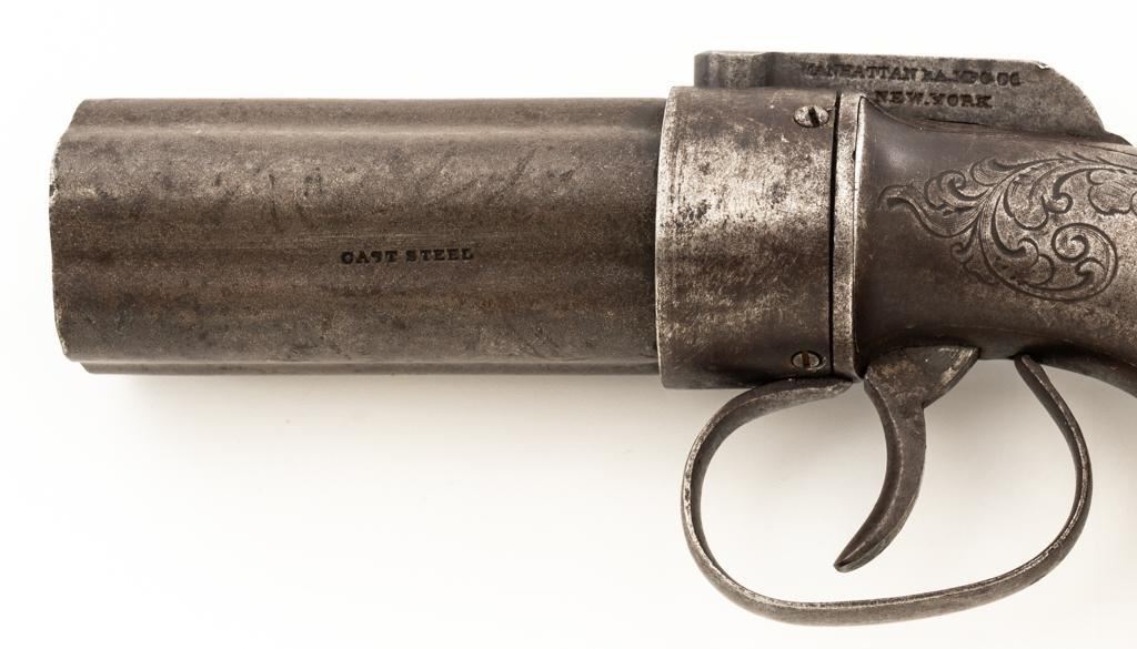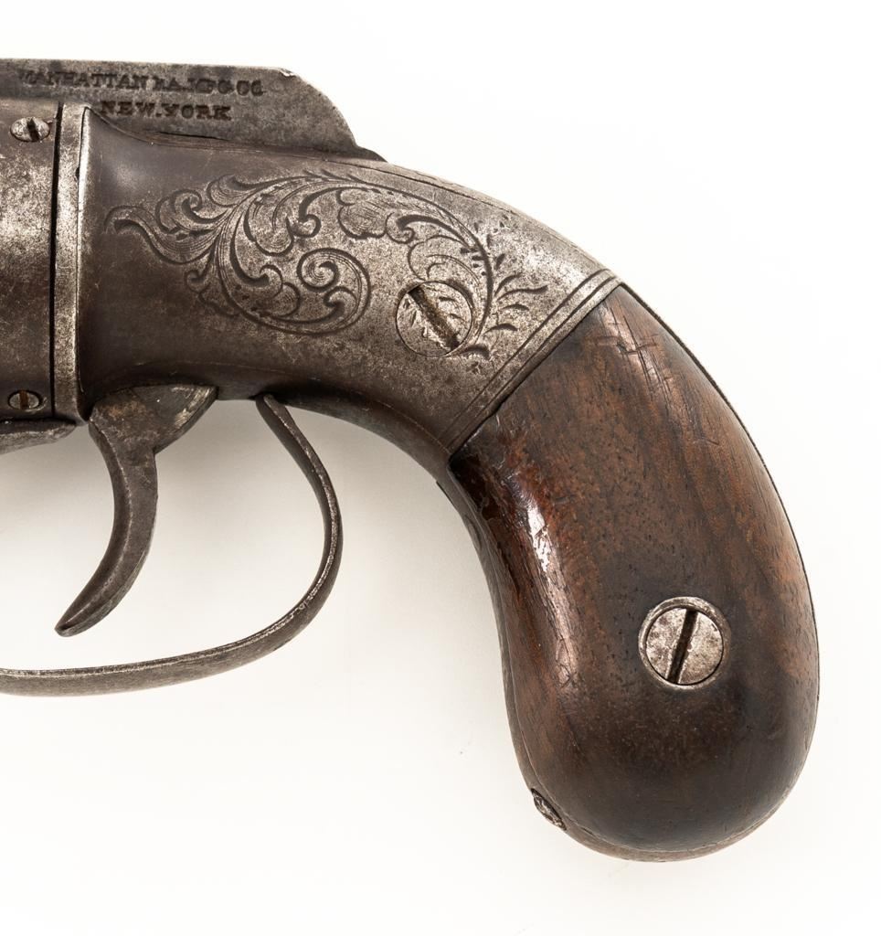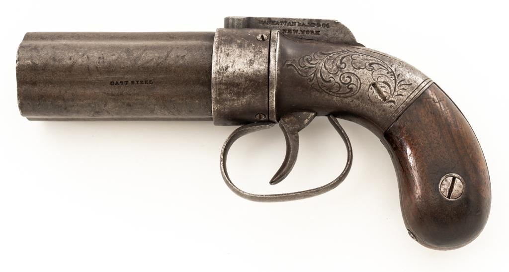 Manhattan Five-Shot Percussion Bar Hammer Pepperbox Pistol, #349, .28 cal., 3'' barrel assembly, originally blued, smooth two-piece hardwood bag shaped grips, no front or rear sights. Barrel is marked ''CAST STEEL''. Left side of the hammer is marked in two-lines ''MANHATTAN F.A. MFG. CO./NEW YORK''. Sides and back of the frame with simple, yet tasteful scroll engraving. Mfg'd circa mid-late 1850's. Condition is good as un-cleaned, displaying a silver/brown patina throughout. Factory lettering and engraving are clear. Grips are near fine, showing moderate age and wear. Action functions well. Bores are worn. Est.: $200-$300. (Antique)
