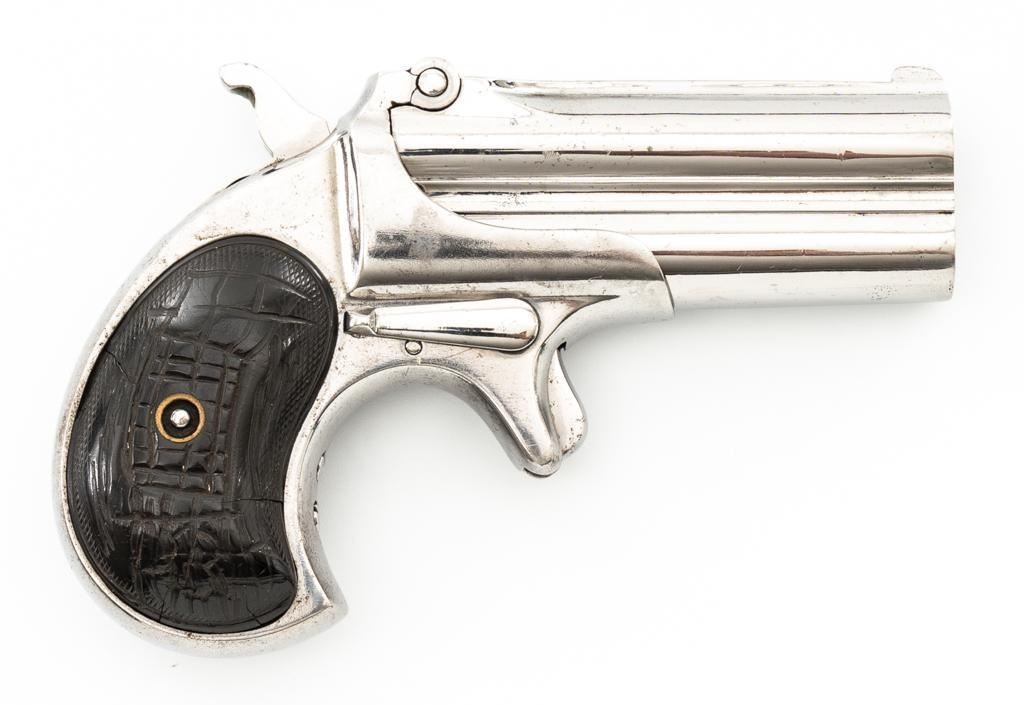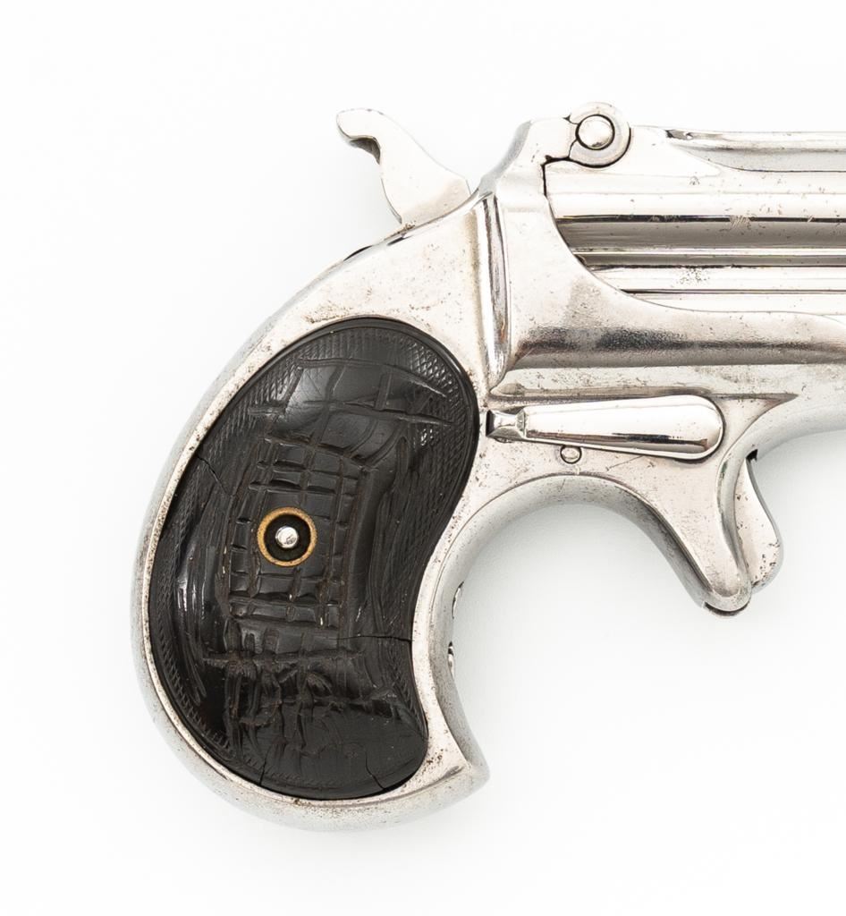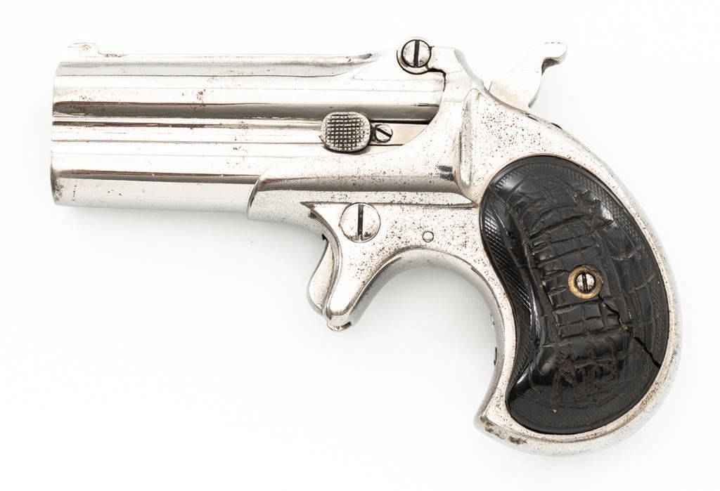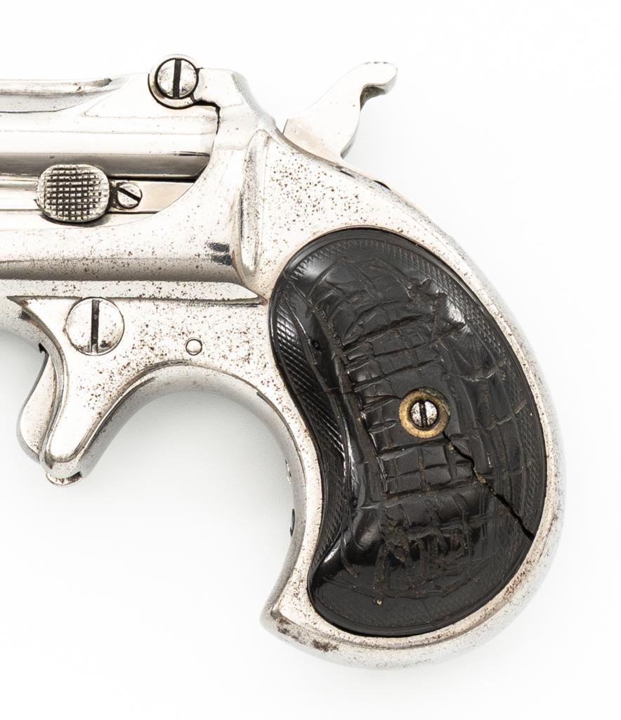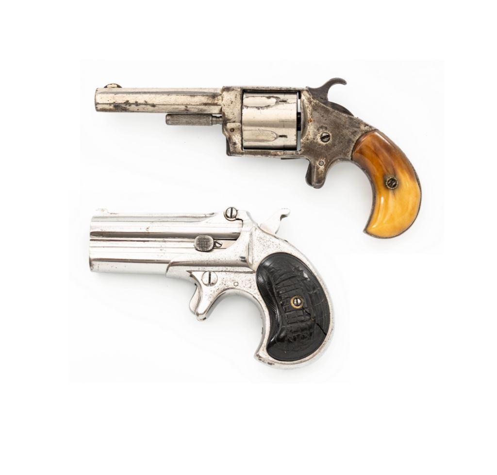 Lot of Two (2) Remington Derringer & Ranger No. 3 Revolver: 1.) Ranger No. 3 Spur Trigger Five-Shot Revolver, #NVSN, .32 cal., 3.25'' octagon barrel, nickel finish, two piece horn grips. Condition is fair to near good, displays approx. 70% flaking nickel finish, with spots of rust patina to the bare metal. Grips are good, with an old loss to the back of the right grip panel at the securing pin. Marking on the top strap is good. Action is not working and in need of repair. Bore/rifling are rough. 2.) Remington Model 95 Double Derringer, #2549, .41 RF cal., 3'' barrels, re-nickeled finish, two-piece hand carved hard rubber grips. In good condition, displaying approx. 98% of its re-nickeled finish, showing general light scratching and handling marks. Grips are fair, with a 1'' fissure to the rear bottom area of the left panel, crude hand checkering. Markings are good. Action is strong. Bore is fair with visible rifling. Est.: $250-$400/lot. (Both C&R/PPT)