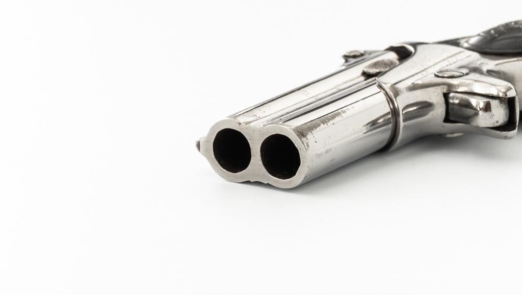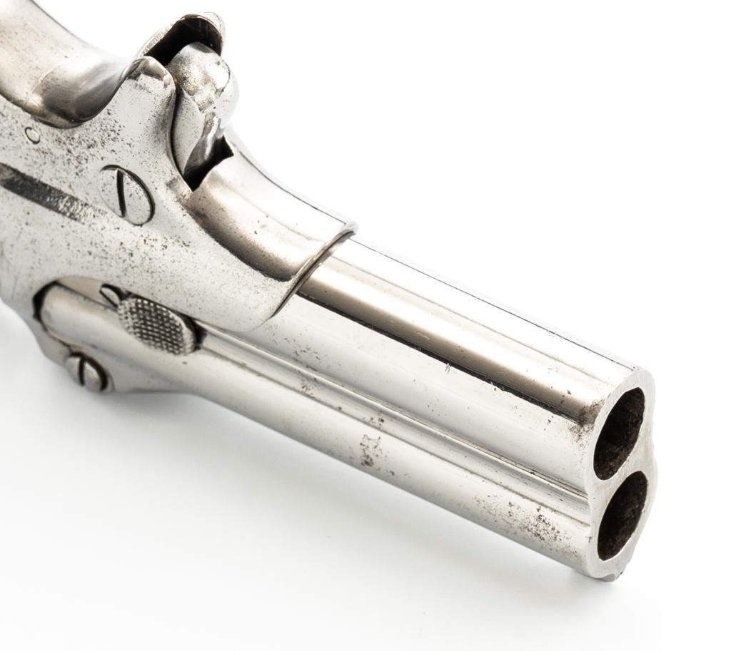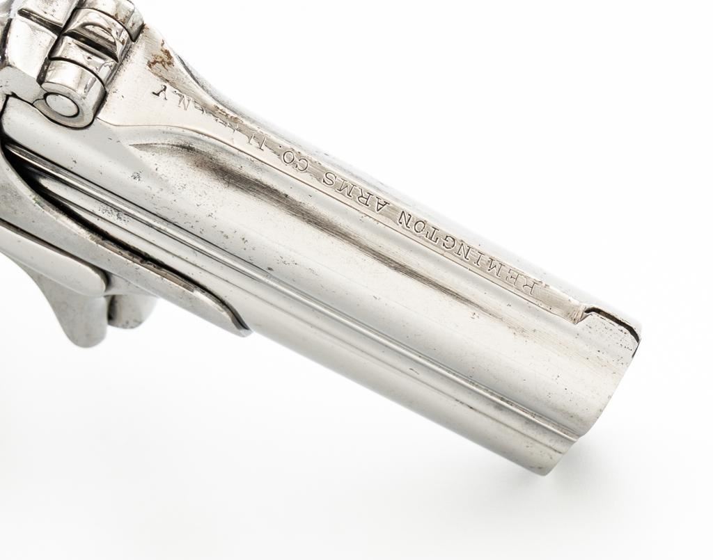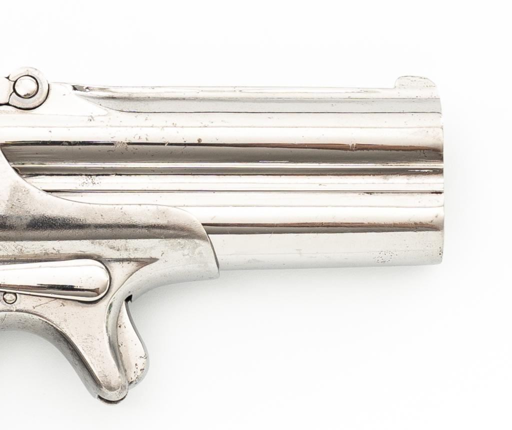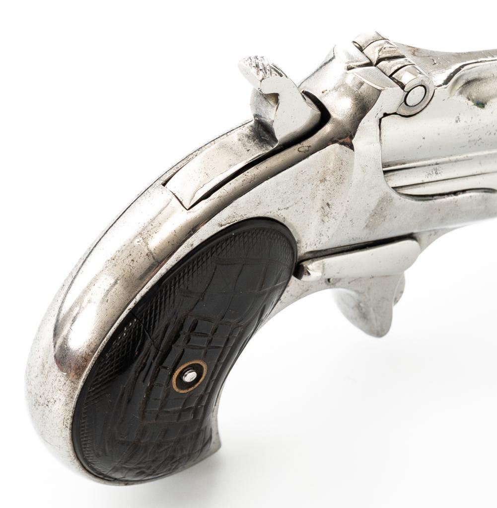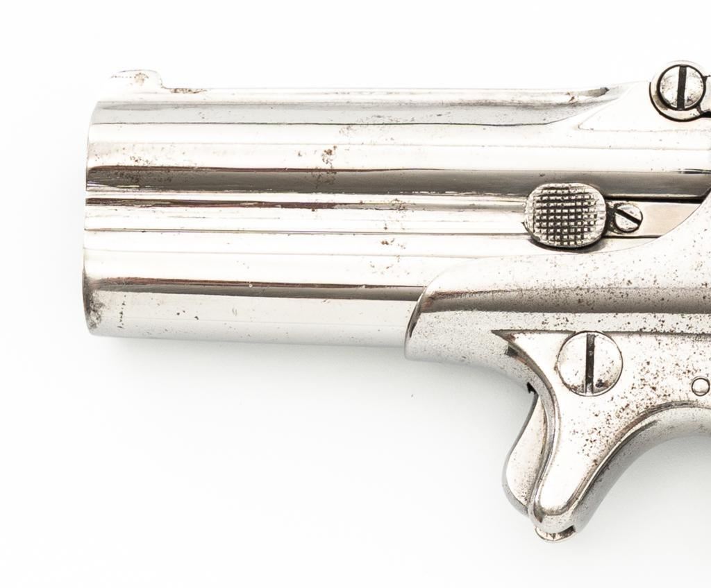 Lot of Two (2) Remington Derringer & Ranger No. 3 Revolver: 1.) Ranger No. 3 Spur Trigger Five-Shot Revolver, #NVSN, .32 cal., 3.25'' octagon barrel, nickel finish, two piece horn grips. Condition is fair to near good, displays approx. 70% flaking nickel finish, with spots of rust patina to the bare metal. Grips are good, with an old loss to the back of the right grip panel at the securing pin. Marking on the top strap is good. Action is not working and in need of repair. Bore/rifling are rough. 2.) Remington Model 95 Double Derringer, #2549, .41 RF cal., 3'' barrels, re-nickeled finish, two-piece hand carved hard rubber grips. In good condition, displaying approx. 98% of its re-nickeled finish, showing general light scratching and handling marks. Grips are fair, with a 1'' fissure to the rear bottom area of the left panel, crude hand checkering. Markings are good. Action is strong. Bore is fair with visible rifling. Est.: $250-$400/lot. (Both C&R/PPT)