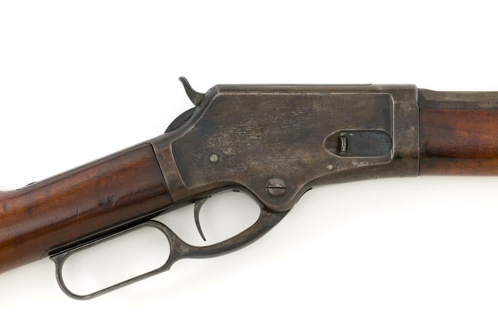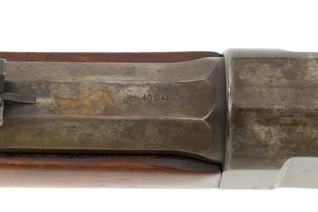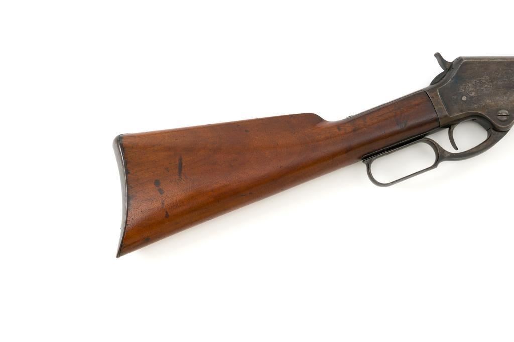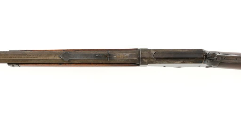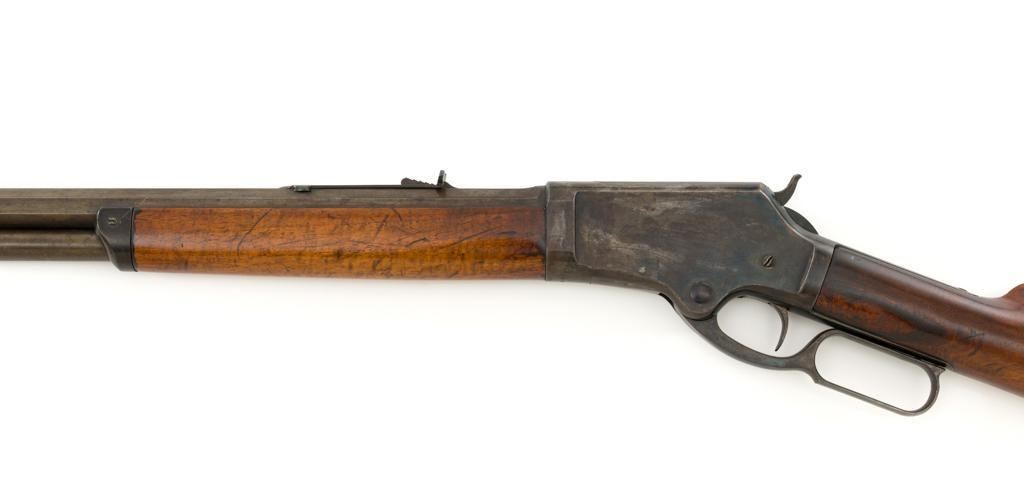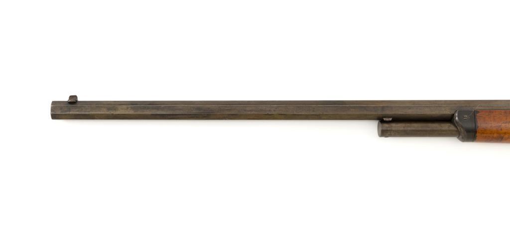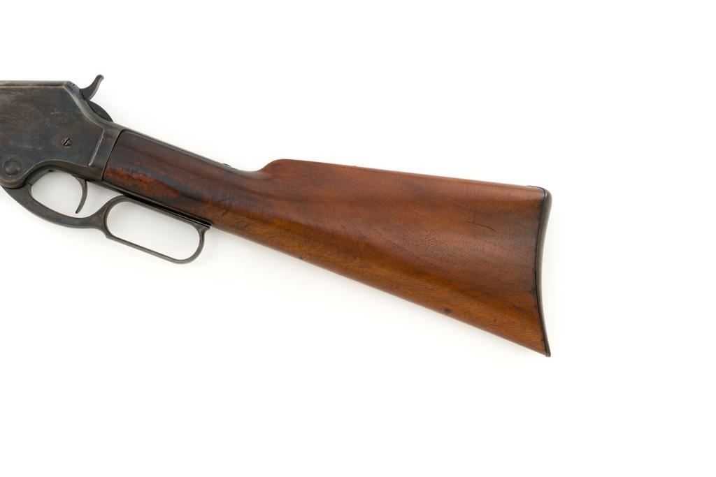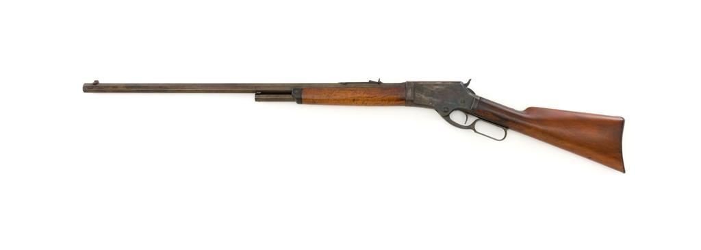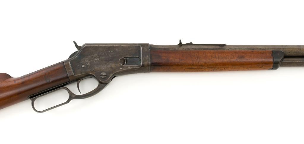 Marlin Model 1881 Lever Action Rifle, #9064, .40-60 cal., 28'' octagon barrel, half-magazine, blued finish; case hardened hammer, lever, and buttplate. Varnished straight grip walnut stock and forend. Sights include a dovetailed blade front and semi-buck rear with elevator. Mfg'd circa 1881. Only approx. 20,000 were manufactured. Rifle is in good condition, retaining approx. 30% thinning and toning blue; balance is gray with areas of dark patina. There is an area of moderate cleaned pitting on the right side of the frame, which has had old added blue applied. Wood with an added coat of varnish applied over general moderate marks from age and wear. Factory markings are clear. Action functions well. Bore is very good with defined rifling. Est.: $1,400-$1,800. (Antique)