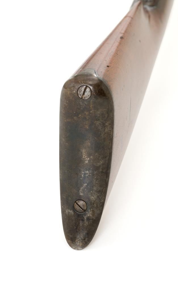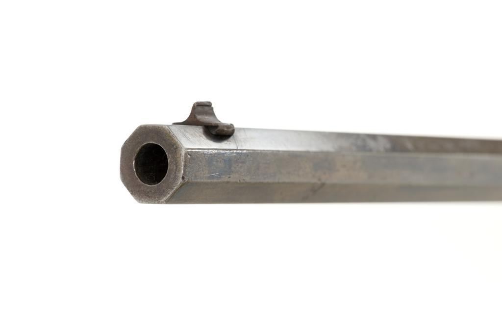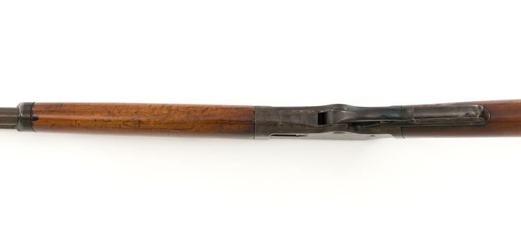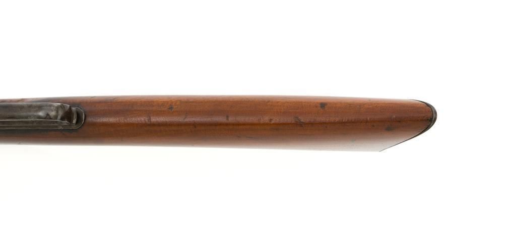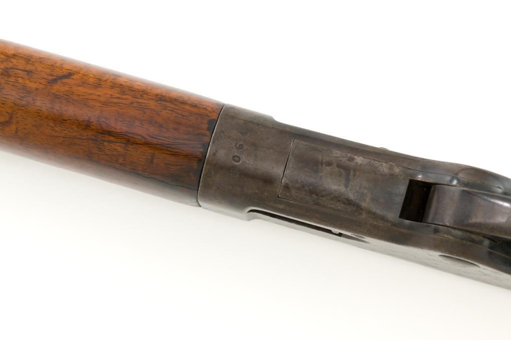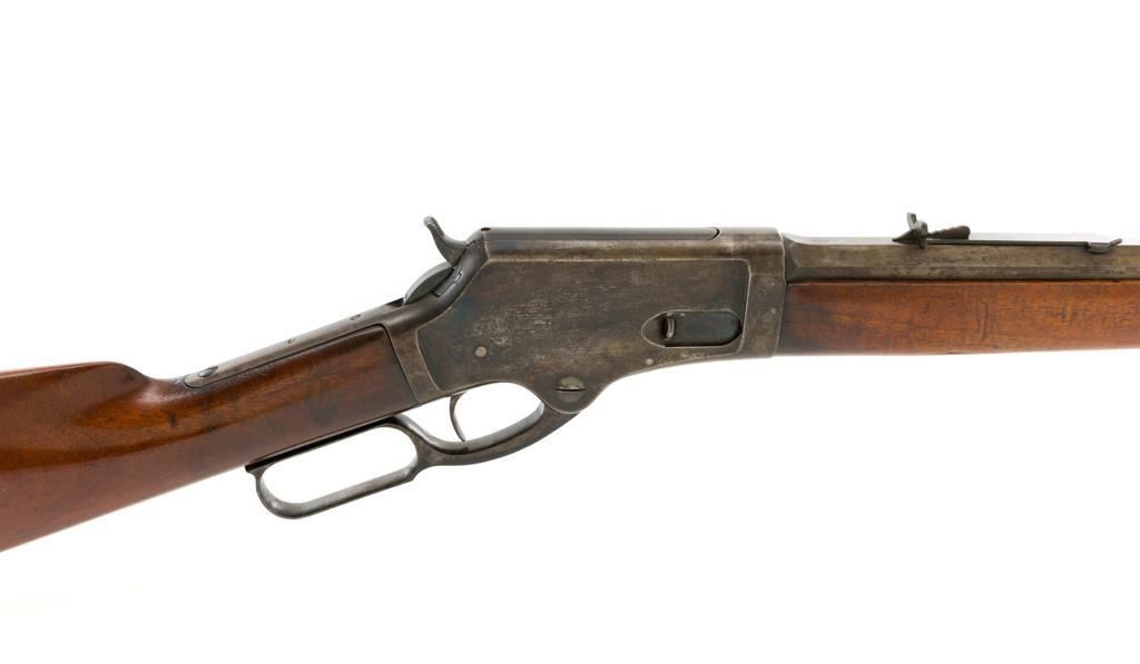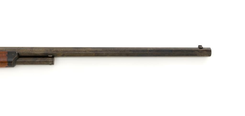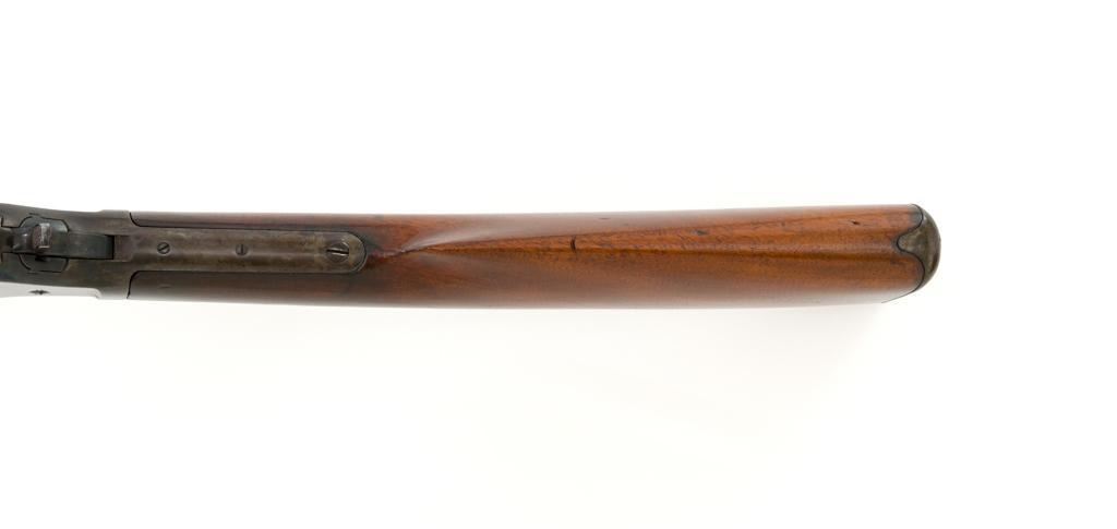 Marlin Model 1881 Lever Action Rifle, #9064, .40-60 cal., 28'' octagon barrel, half-magazine, blued finish; case hardened hammer, lever, and buttplate. Varnished straight grip walnut stock and forend. Sights include a dovetailed blade front and semi-buck rear with elevator. Mfg'd circa 1881. Only approx. 20,000 were manufactured. Rifle is in good condition, retaining approx. 30% thinning and toning blue; balance is gray with areas of dark patina. There is an area of moderate cleaned pitting on the right side of the frame, which has had old added blue applied. Wood with an added coat of varnish applied over general moderate marks from age and wear. Factory markings are clear. Action functions well. Bore is very good with defined rifling. Est.: $1,400-$1,800. (Antique)