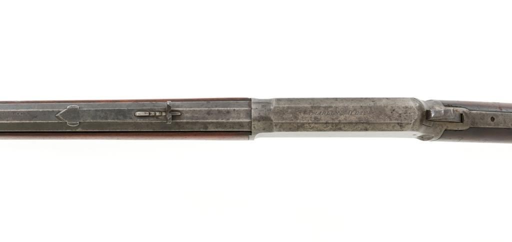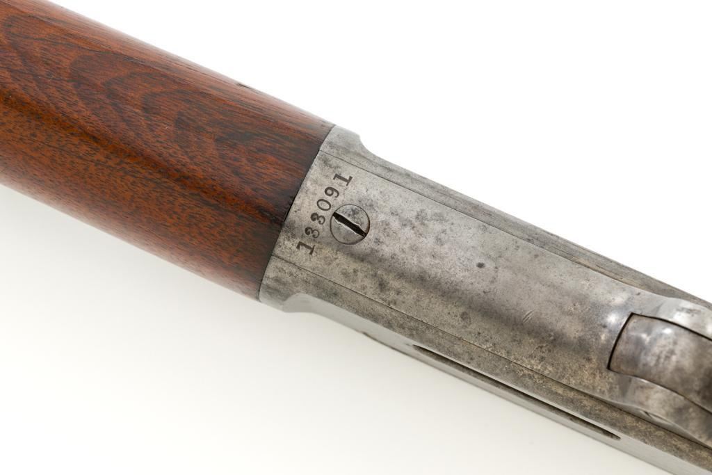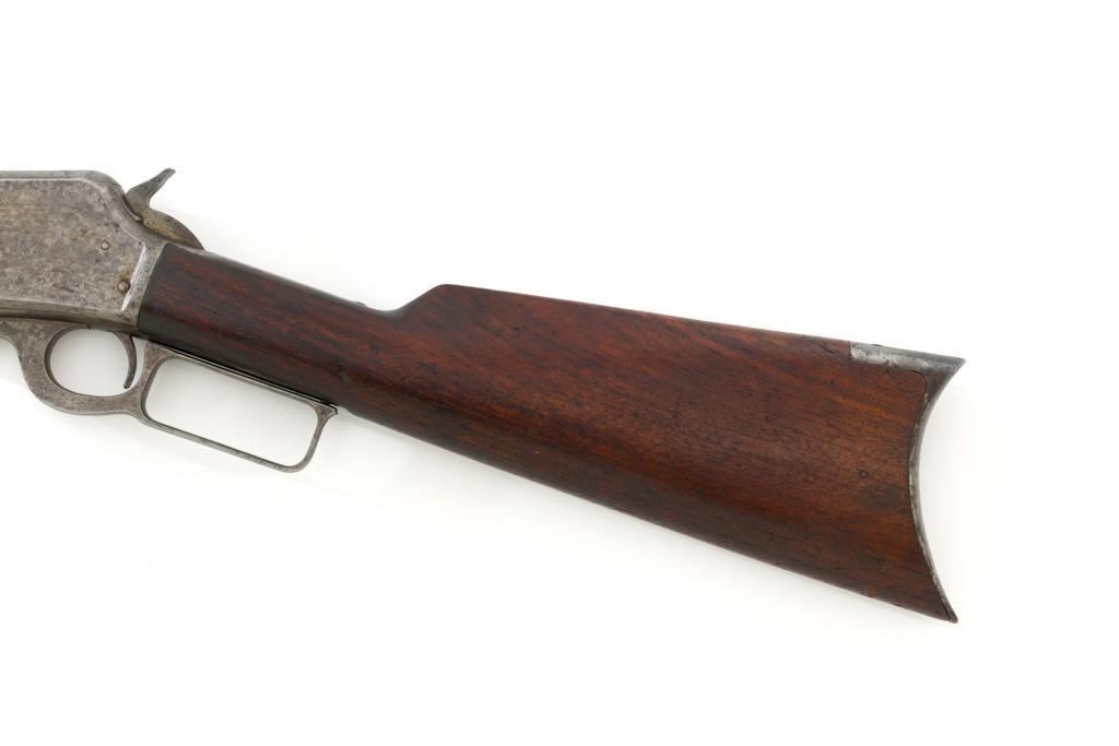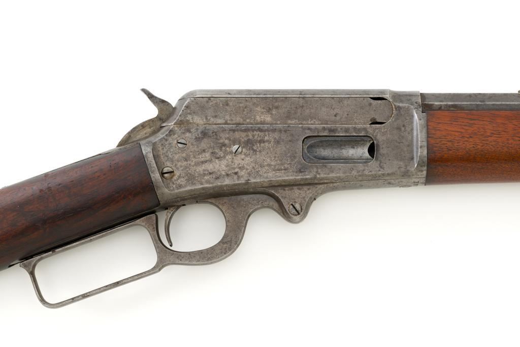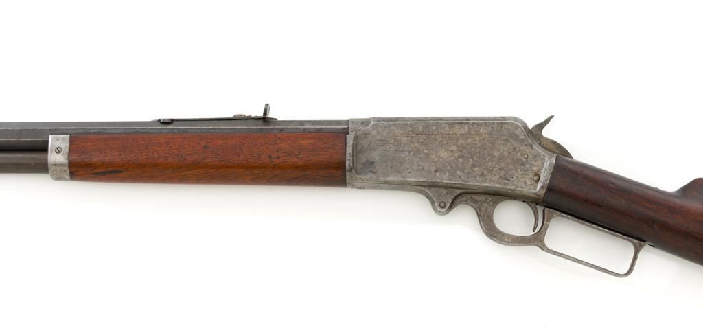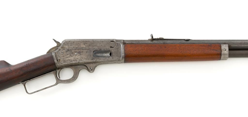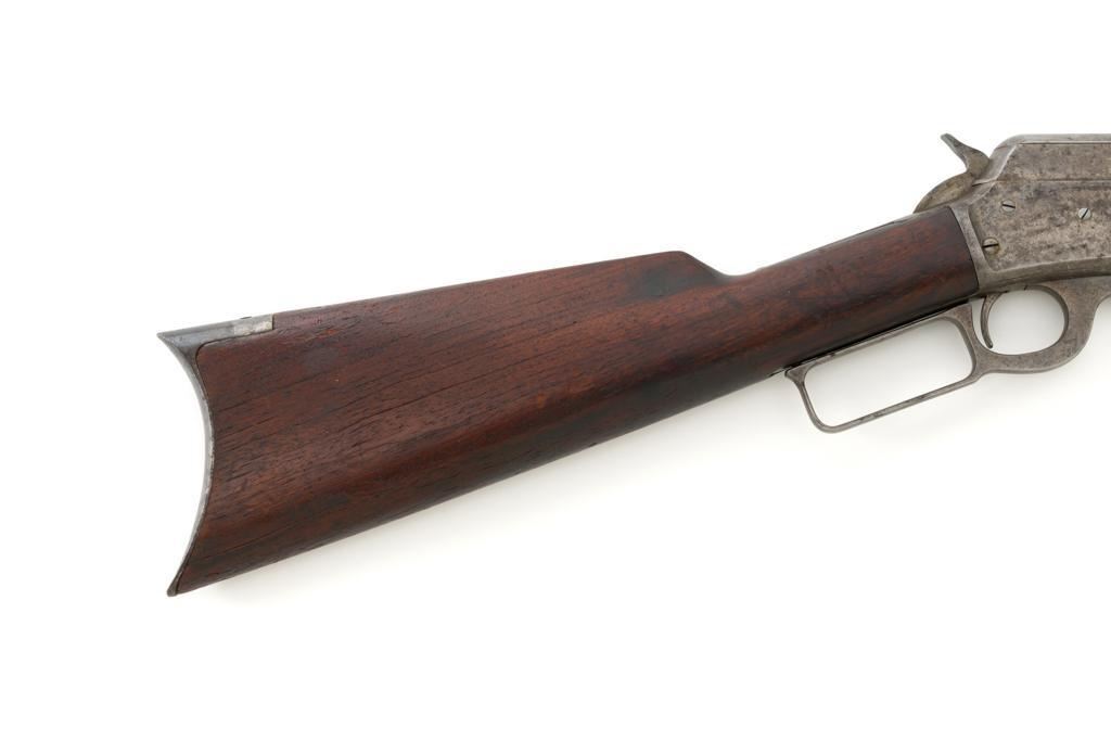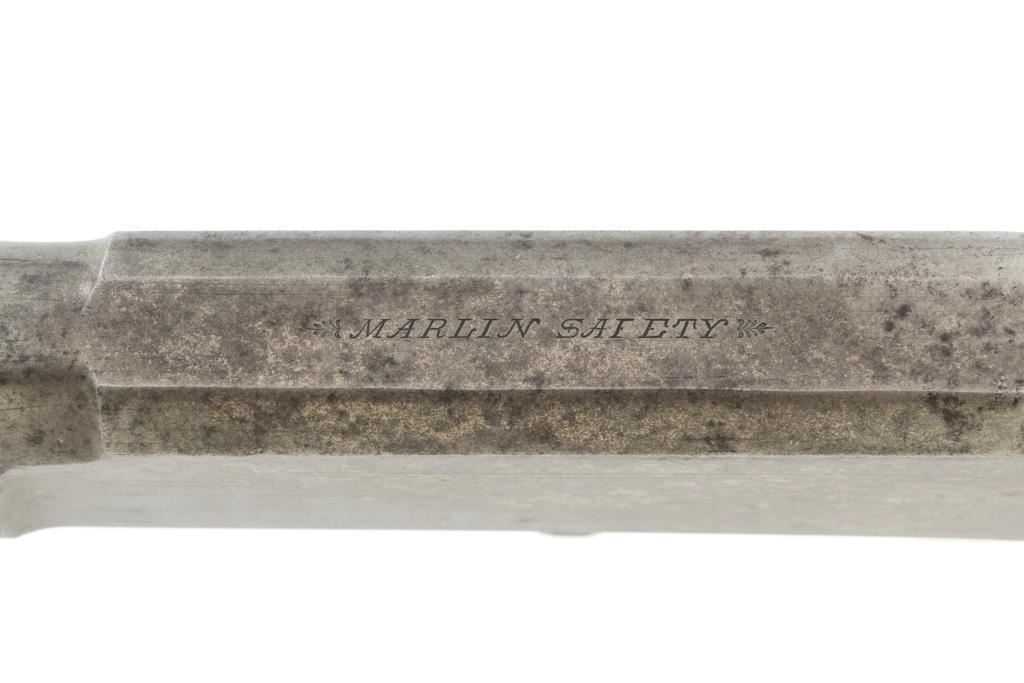 Marlin Model 1895 Lever Action Rifle, #133091, .40-65 WCF cal., octagonal barrel has been shortened to 23'' and has 3/4-length magazine tube, metal with a blue and color case hardened finish, smooth walnut straight grip stock and forend, ends with a smooth crescent buttplate, providing a 13'' LOP. Sights include a dovetailed ivory bead blade front and buckhorn rear. Mfg'd 1896. Rifle is in very good overall condition, retaining approx. 30%-40% thinning finish on the barrel, with sharp edges, and areas of moderate erosion. Magazine tube has drifted to dull gray. Receiver, lever, and hammer display silvered color case hardened finish, with brighter colors in the protected areas. Top of the receiver is marked ''MARLIN SAFETY''. Tang is drilled and tapped with one screw missing. Stock is in good condition with scattered indentations, and an old coat of added varnish. Buttplate shows silvered color case hardened finish with moderate surface erosion. Action is crisp and functions well. Bore is fair with visible rifling, but has moderate erosion scattered throughout. Est.: $900-$1,200. (Antique)