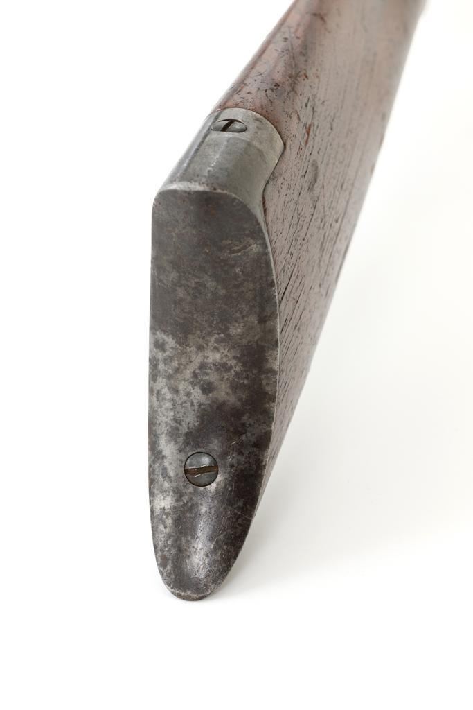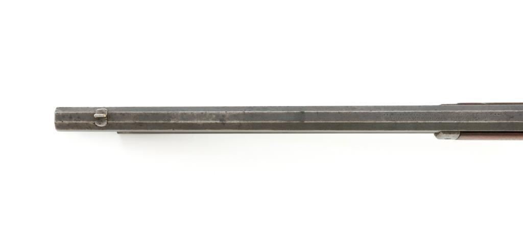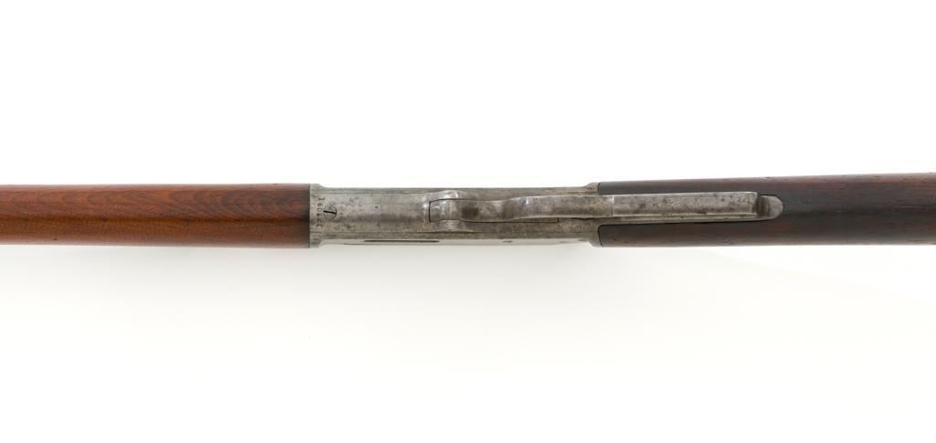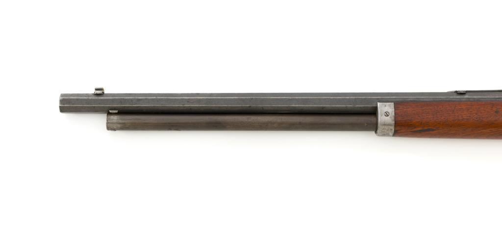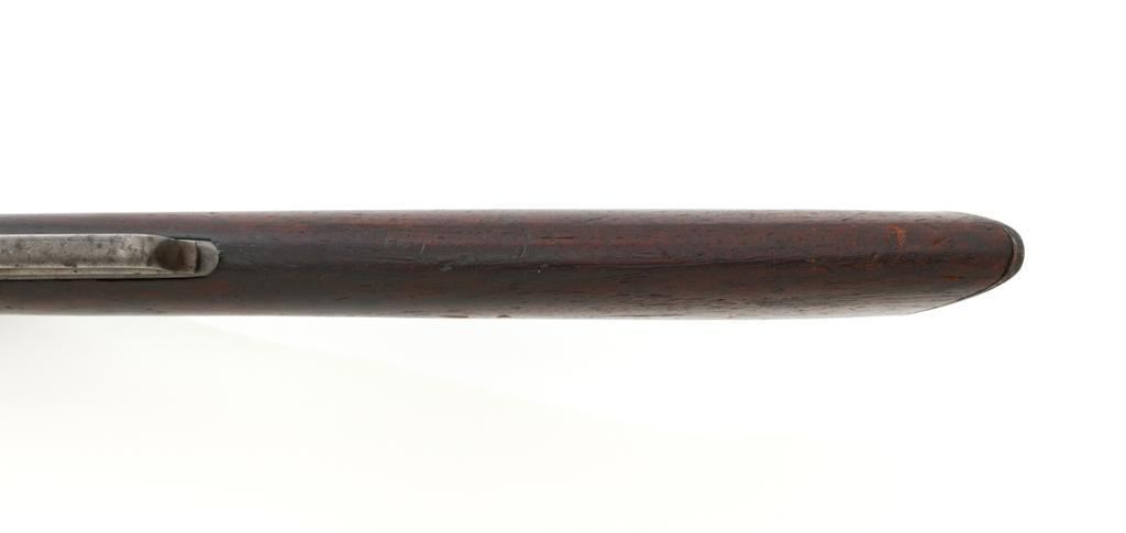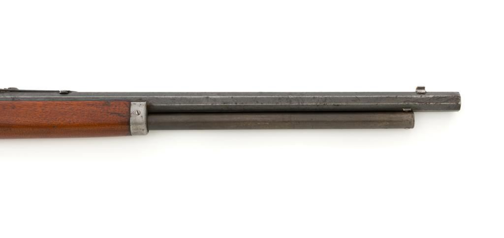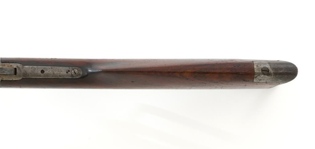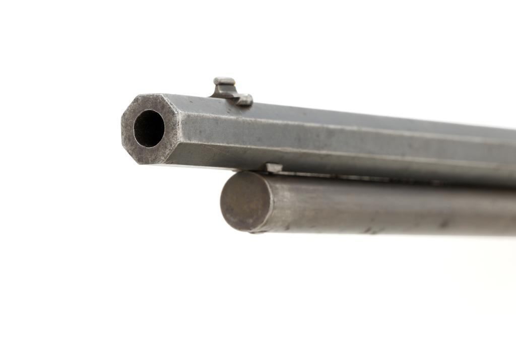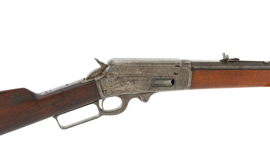 Marlin Model 1895 Lever Action Rifle, #133091, .40-65 WCF cal., octagonal barrel has been shortened to 23'' and has 3/4-length magazine tube, metal with a blue and color case hardened finish, smooth walnut straight grip stock and forend, ends with a smooth crescent buttplate, providing a 13'' LOP. Sights include a dovetailed ivory bead blade front and buckhorn rear. Mfg'd 1896. Rifle is in very good overall condition, retaining approx. 30%-40% thinning finish on the barrel, with sharp edges, and areas of moderate erosion. Magazine tube has drifted to dull gray. Receiver, lever, and hammer display silvered color case hardened finish, with brighter colors in the protected areas. Top of the receiver is marked ''MARLIN SAFETY''. Tang is drilled and tapped with one screw missing. Stock is in good condition with scattered indentations, and an old coat of added varnish. Buttplate shows silvered color case hardened finish with moderate surface erosion. Action is crisp and functions well. Bore is fair with visible rifling, but has moderate erosion scattered throughout. Est.: $900-$1,200. (Antique)