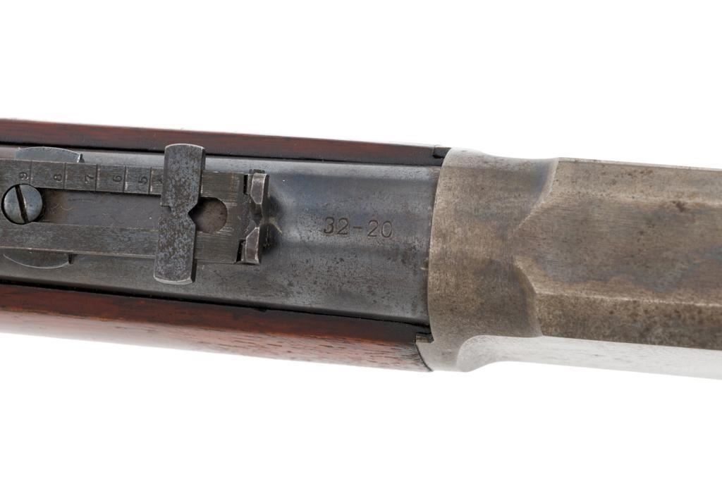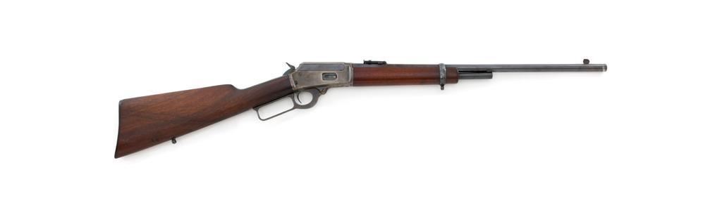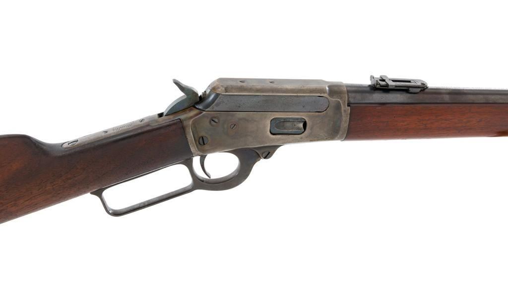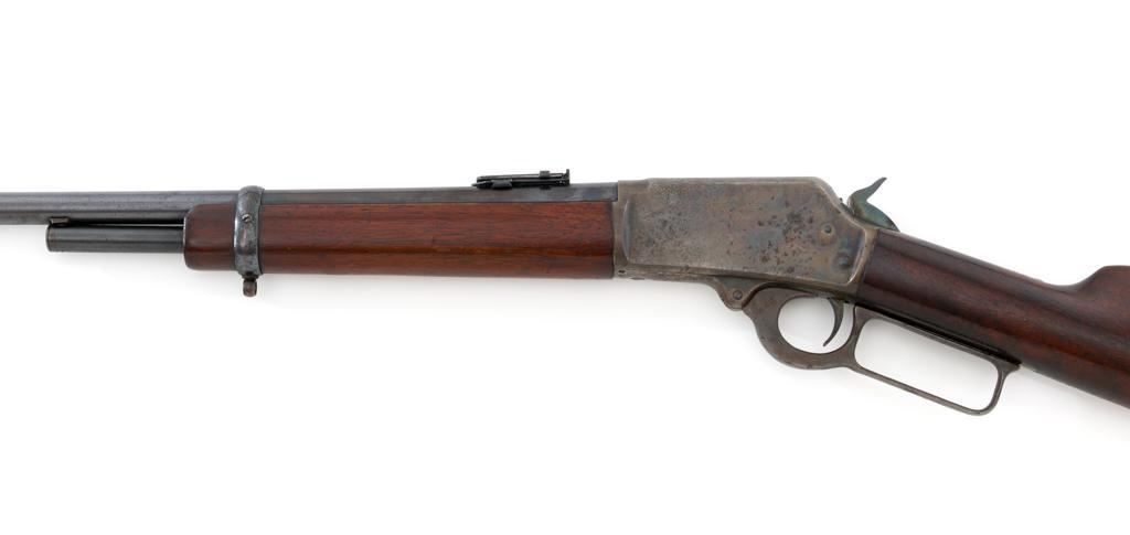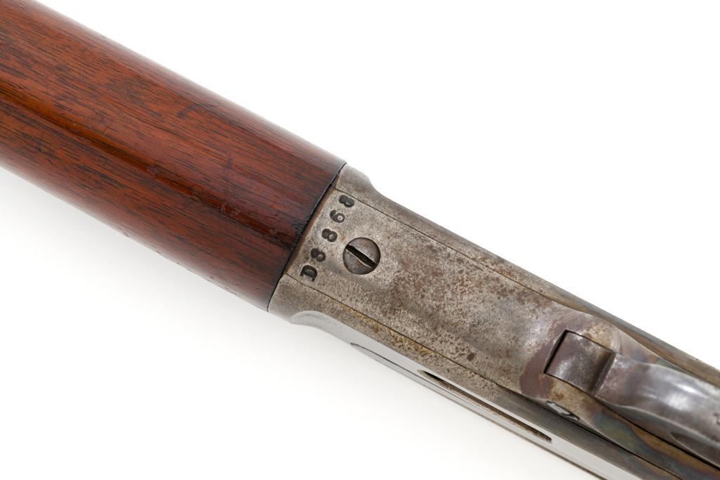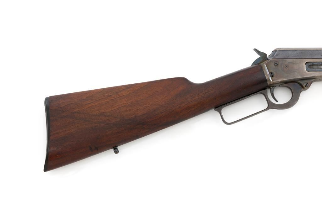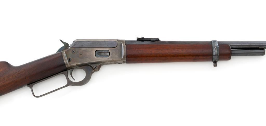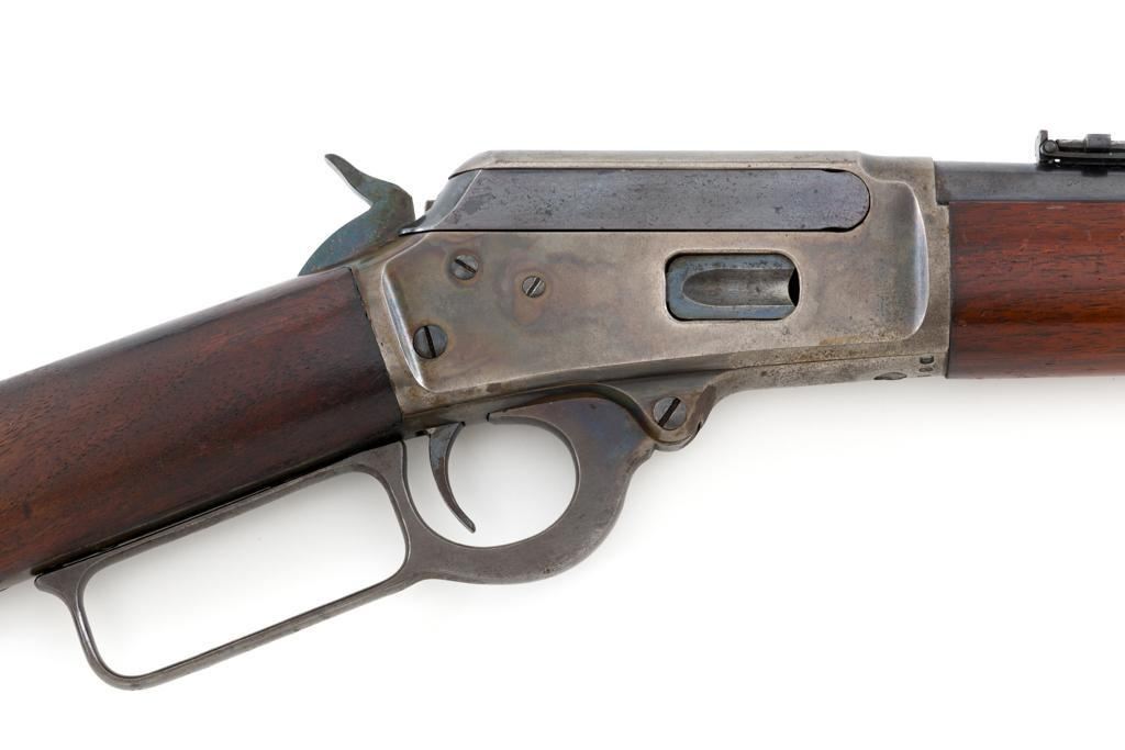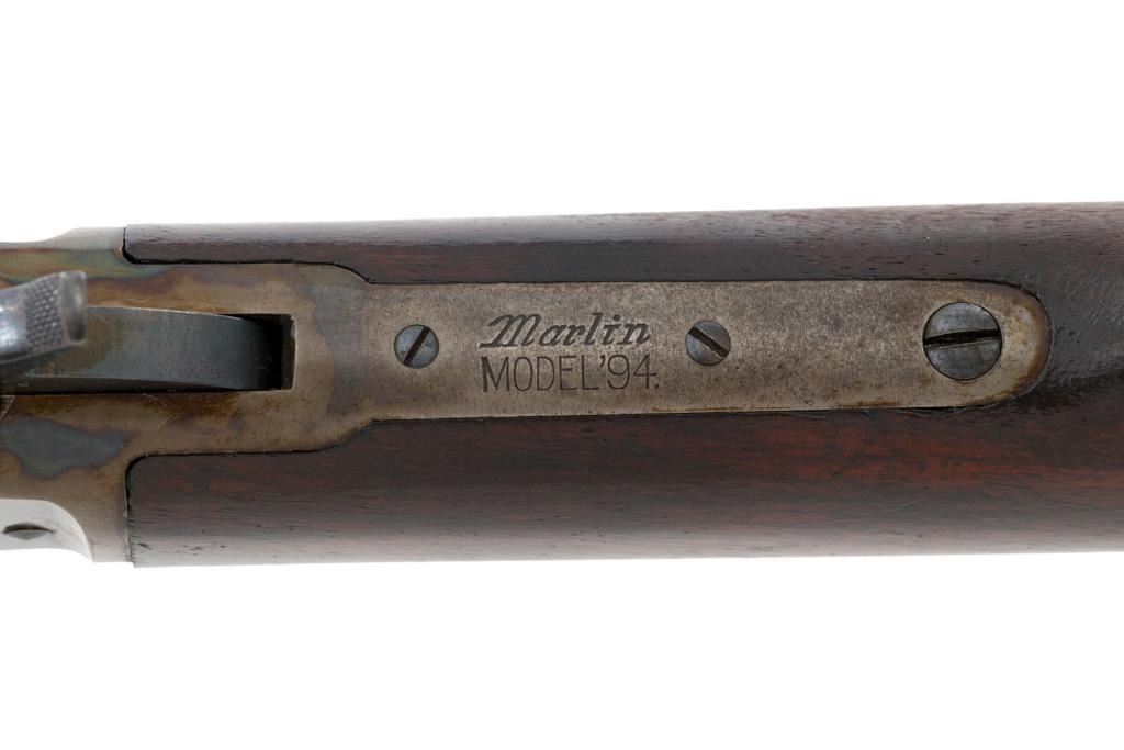 Marlin Model 1894 Lever Action Carbine, #D8868, .32-20 cal., 20'' round barrel with 1/2 magazine tube, blue and case hardened finish, straight grip walnut stock and forend, checkered hard rubber Marlin buttplate, pinned blade front sight, and folding carbine ladder rear sight. Mfg'd 1947. Rifle is in overall very good condition, displaying approx. 90% blue, showing mild frosting on the barrel, and spot of moderate oxidation near the muzzle. Case colors show muting and toning, but still a considerable amount remain, and are stronger on the left side. Receiver and lever with intermittent mild frosting and light erosion, particularly on the left side. Factory markings are crisp. Wood is good as revarnished, with almost all the finish having been removed from right side of the buttstock; spots of flaking to finish on the forend. The most noticeable blemish is an impression to the lower right edge of the buttstock. Action is crisp and functions smoothly. Bore rates near excellent and is bright throughout with defined rifling. Est.: $600-$800. (C&R/PPT)