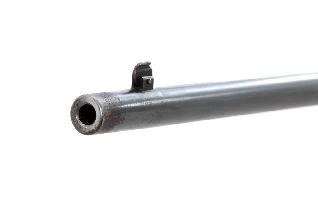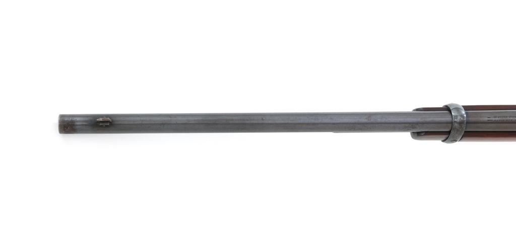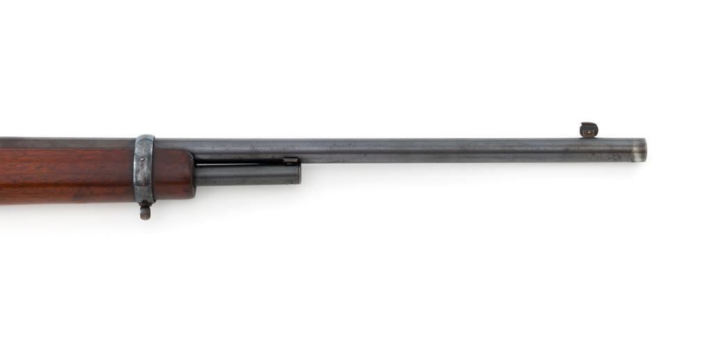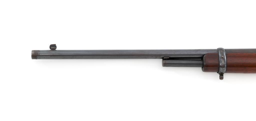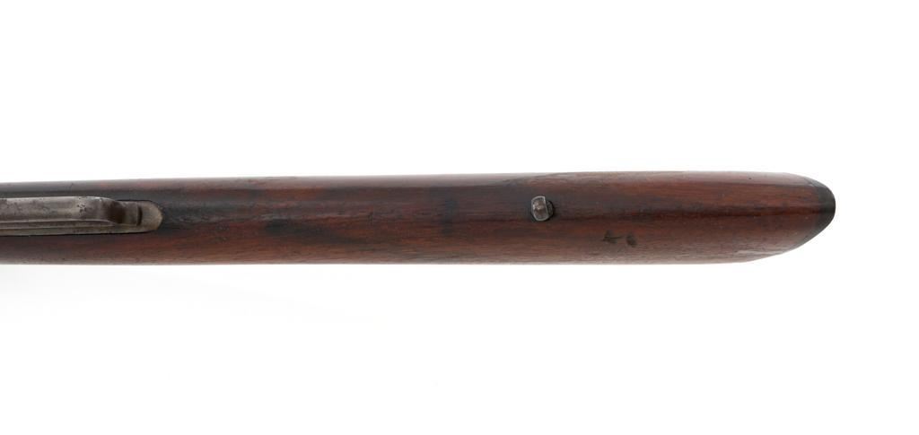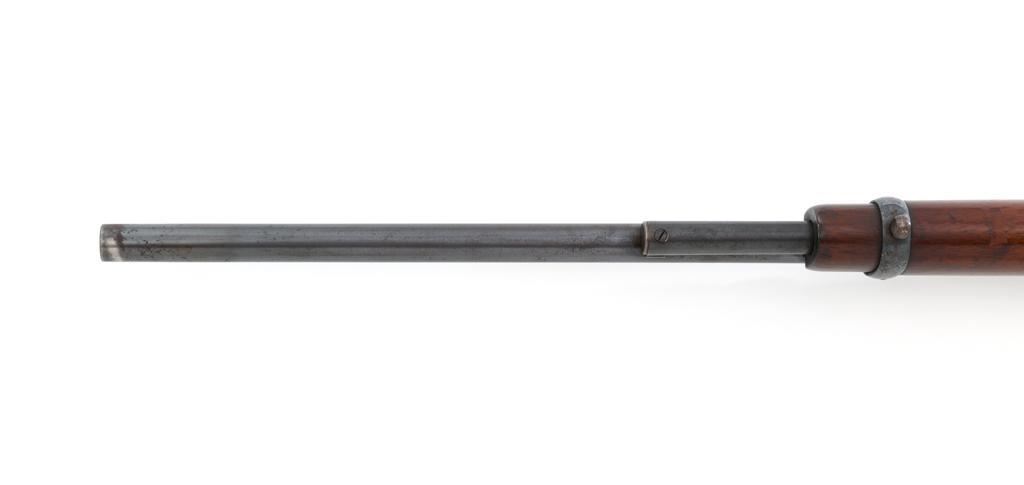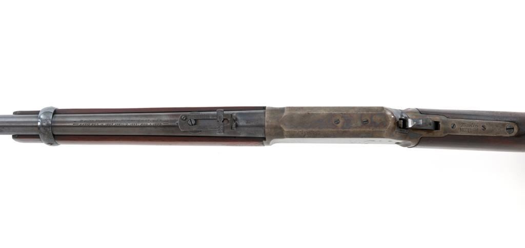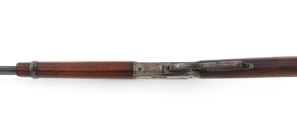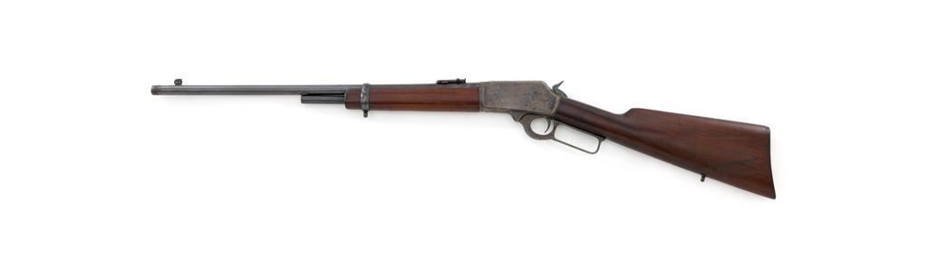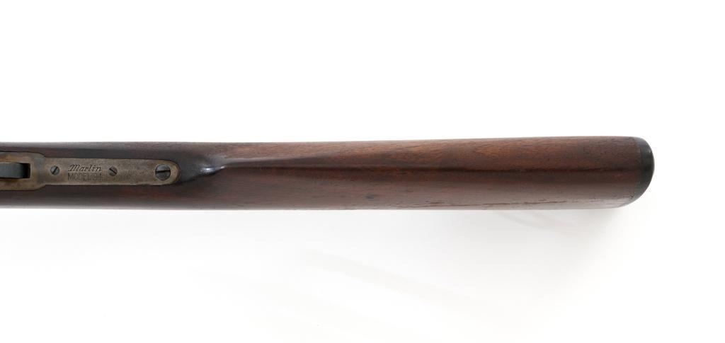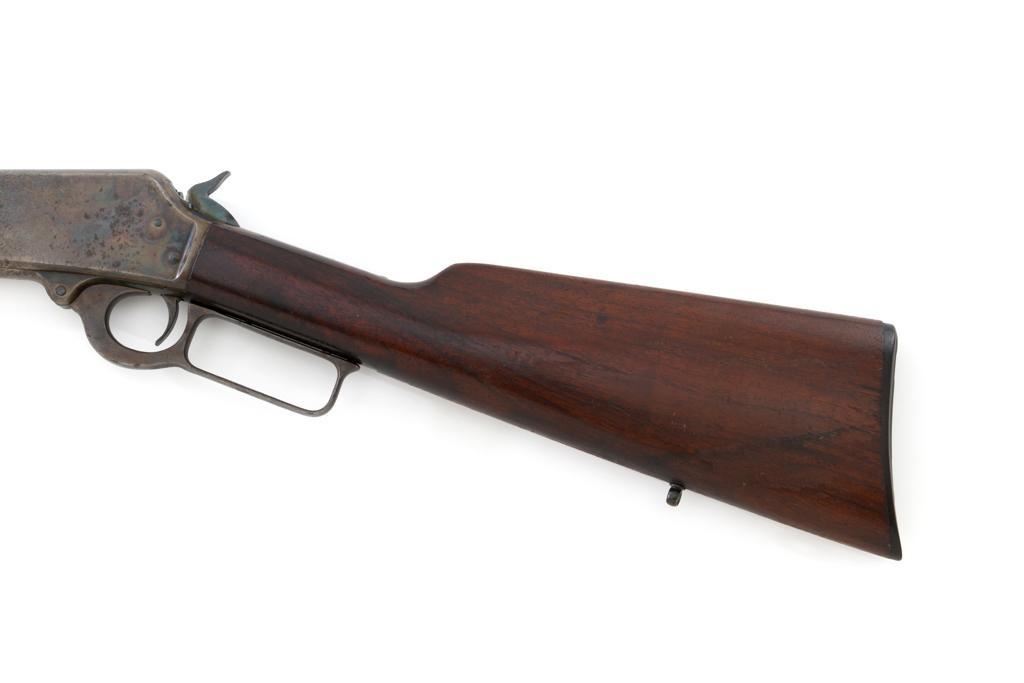 Marlin Model 1894 Lever Action Carbine, #D8868, .32-20 cal., 20'' round barrel with 1/2 magazine tube, blue and case hardened finish, straight grip walnut stock and forend, checkered hard rubber Marlin buttplate, pinned blade front sight, and folding carbine ladder rear sight. Mfg'd 1947. Rifle is in overall very good condition, displaying approx. 90% blue, showing mild frosting on the barrel, and spot of moderate oxidation near the muzzle. Case colors show muting and toning, but still a considerable amount remain, and are stronger on the left side. Receiver and lever with intermittent mild frosting and light erosion, particularly on the left side. Factory markings are crisp. Wood is good as revarnished, with almost all the finish having been removed from right side of the buttstock; spots of flaking to finish on the forend. The most noticeable blemish is an impression to the lower right edge of the buttstock. Action is crisp and functions smoothly. Bore rates near excellent and is bright throughout with defined rifling. Est.: $600-$800. (C&R/PPT)