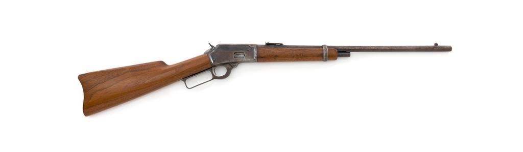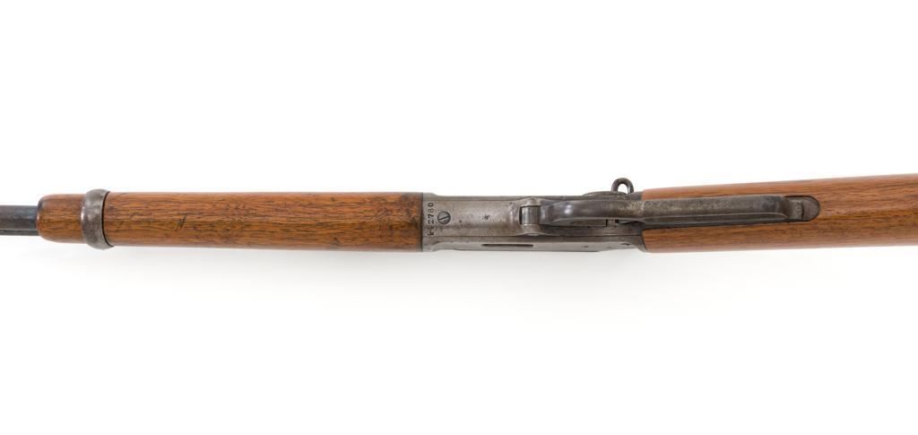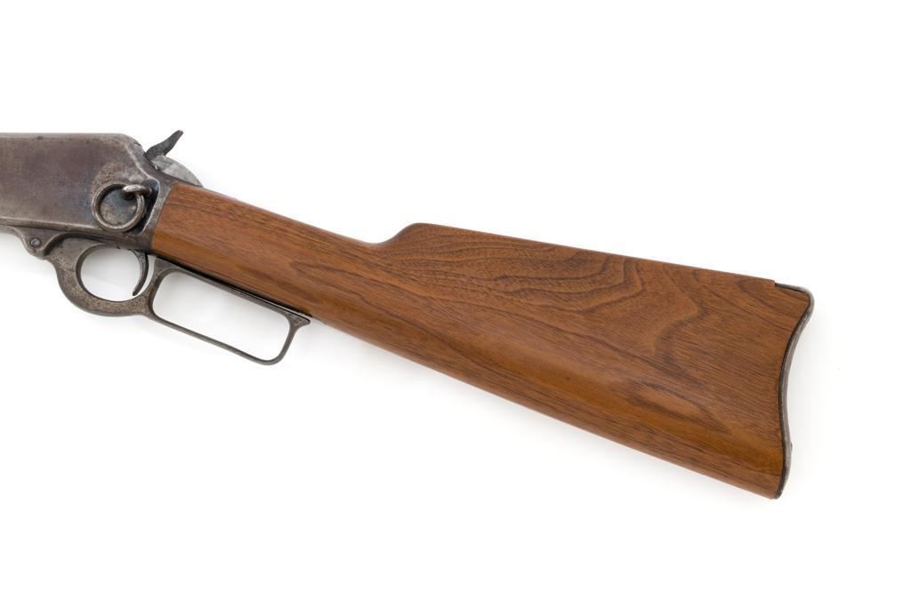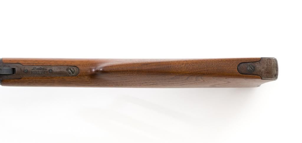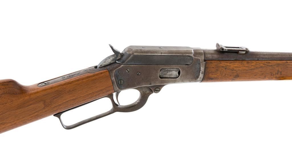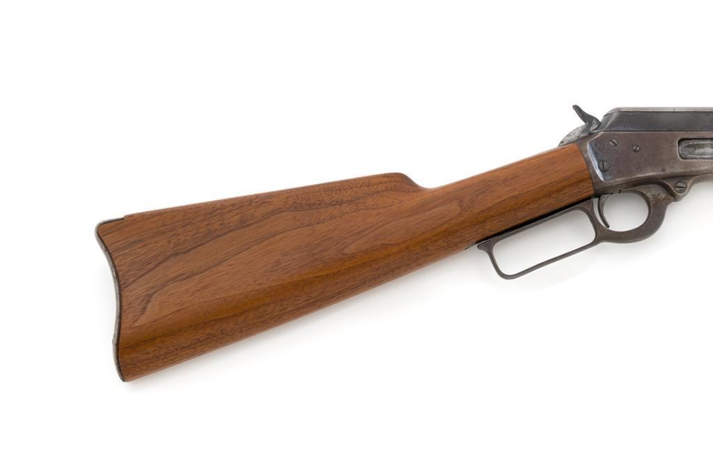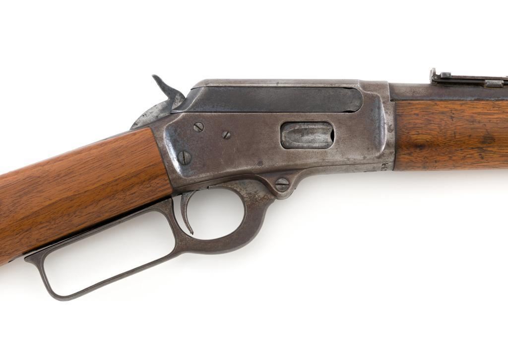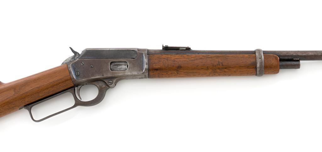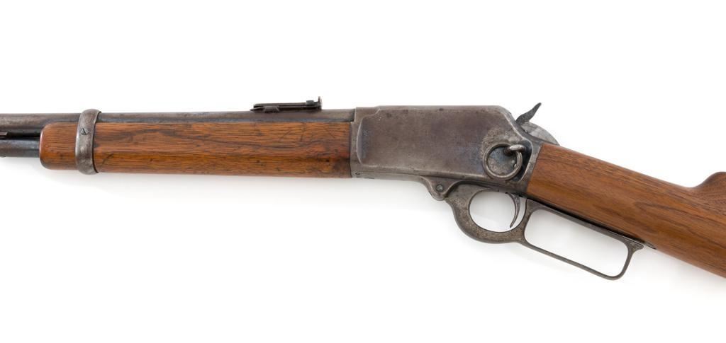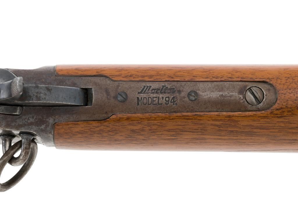Marlin Model 1894 Lever Action Saddle Ring Carbine, #442780, .25-20 cal., 20'' round barrel with half magazine, blued with case hardened lever, saddle ring, straight grip walnut stock and forend, fixed blade front sight, and folding carbine ladder rear sight. Mfg'd circa 1930. Carbine is in overall good condition as un-cleaned, displaying traces of thinning and toning factory blue in the protected areas, with the balance gone to a gray/brown patina, with scattered light to moderate pinprick pitting confined to the barrel in front of the band. Lever has toned to silver. Factory markings are clear. Forend has been sanded and refinished over old moderate dents and scratches. Buttstock has been replaced and appears near new. Action is crisp and functions smoothly. Bore is fair with considerable frosting throughout; rifling is visible but soft. Est.: $400-$600. (C&R/PPT)
