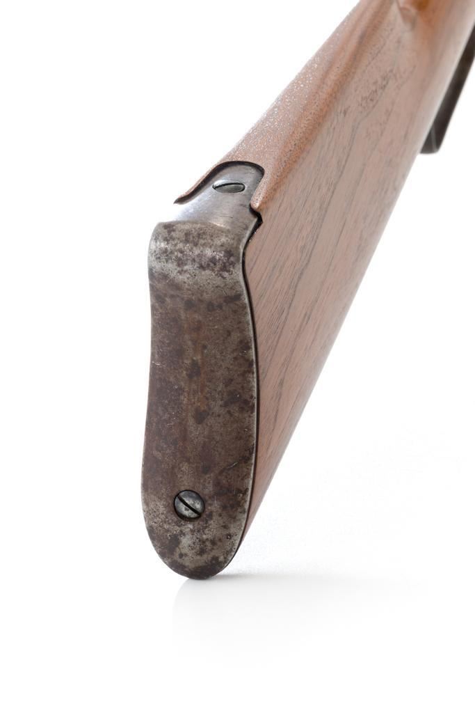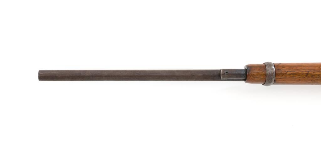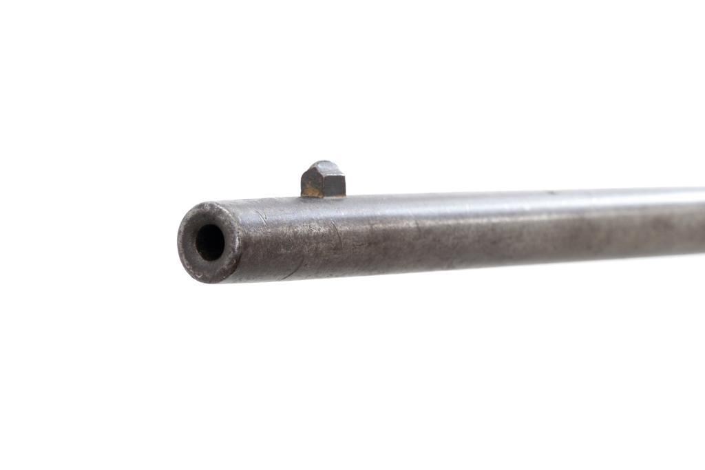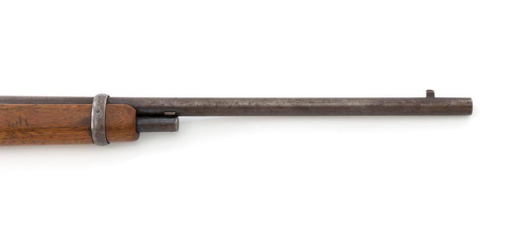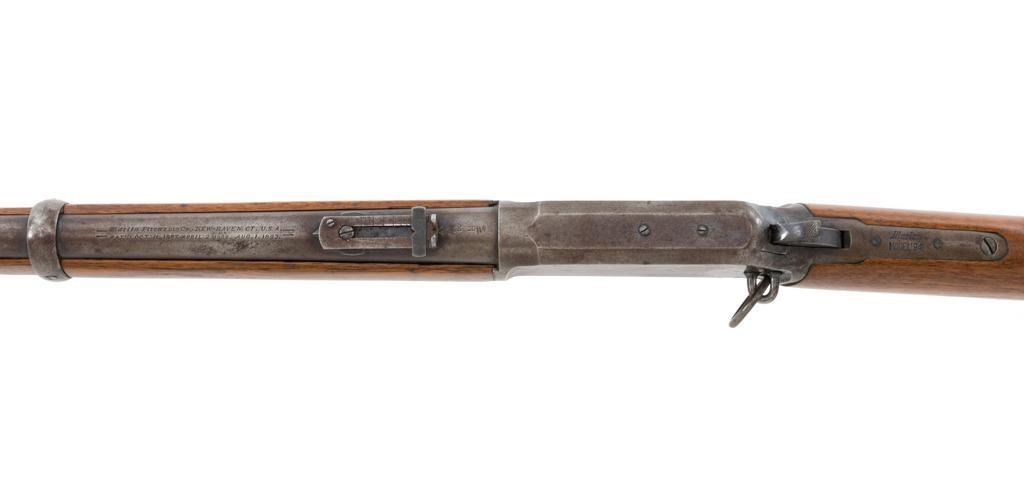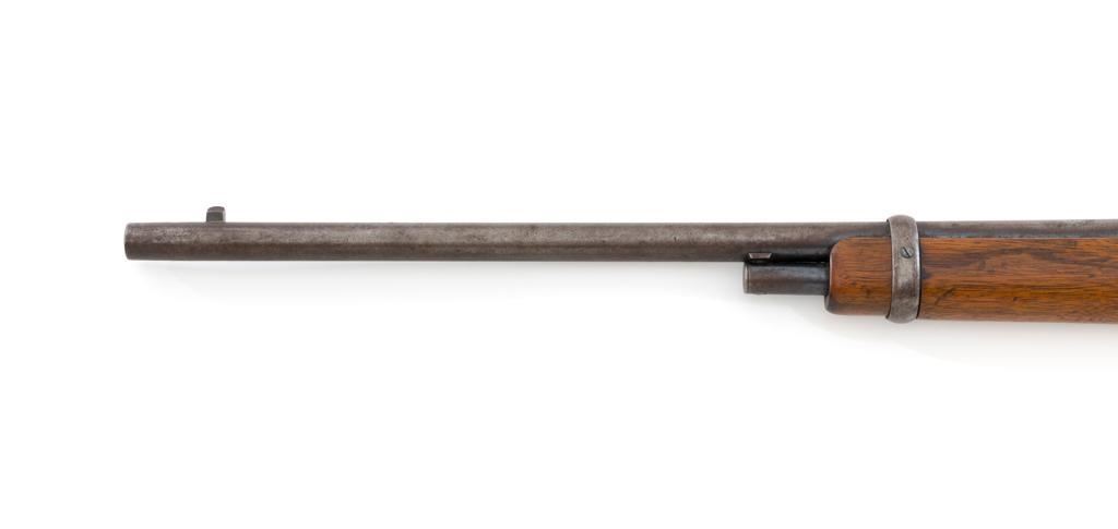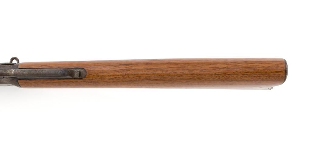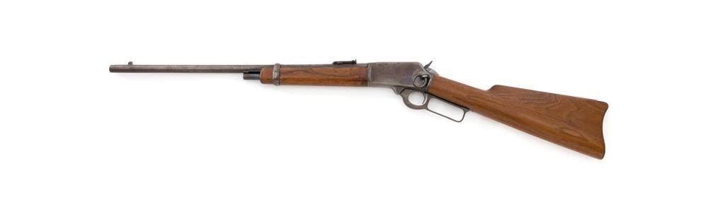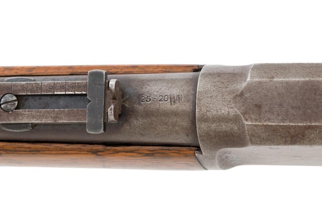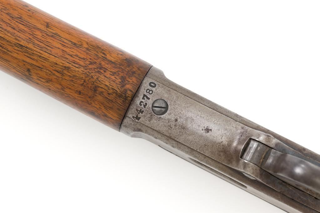 Marlin Model 1894 Lever Action Saddle Ring Carbine, #442780, .25-20 cal., 20'' round barrel with half magazine, blued with case hardened lever, saddle ring, straight grip walnut stock and forend, fixed blade front sight, and folding carbine ladder rear sight. Mfg'd circa 1930. Carbine is in overall good condition as un-cleaned, displaying traces of thinning and toning factory blue in the protected areas, with the balance gone to a gray/brown patina, with scattered light to moderate pinprick pitting confined to the barrel in front of the band. Lever has toned to silver. Factory markings are clear. Forend has been sanded and refinished over old moderate dents and scratches. Buttstock has been replaced and appears near new. Action is crisp and functions smoothly. Bore is fair with considerable frosting throughout; rifling is visible but soft. Est.: $400-$600. (C&R/PPT)