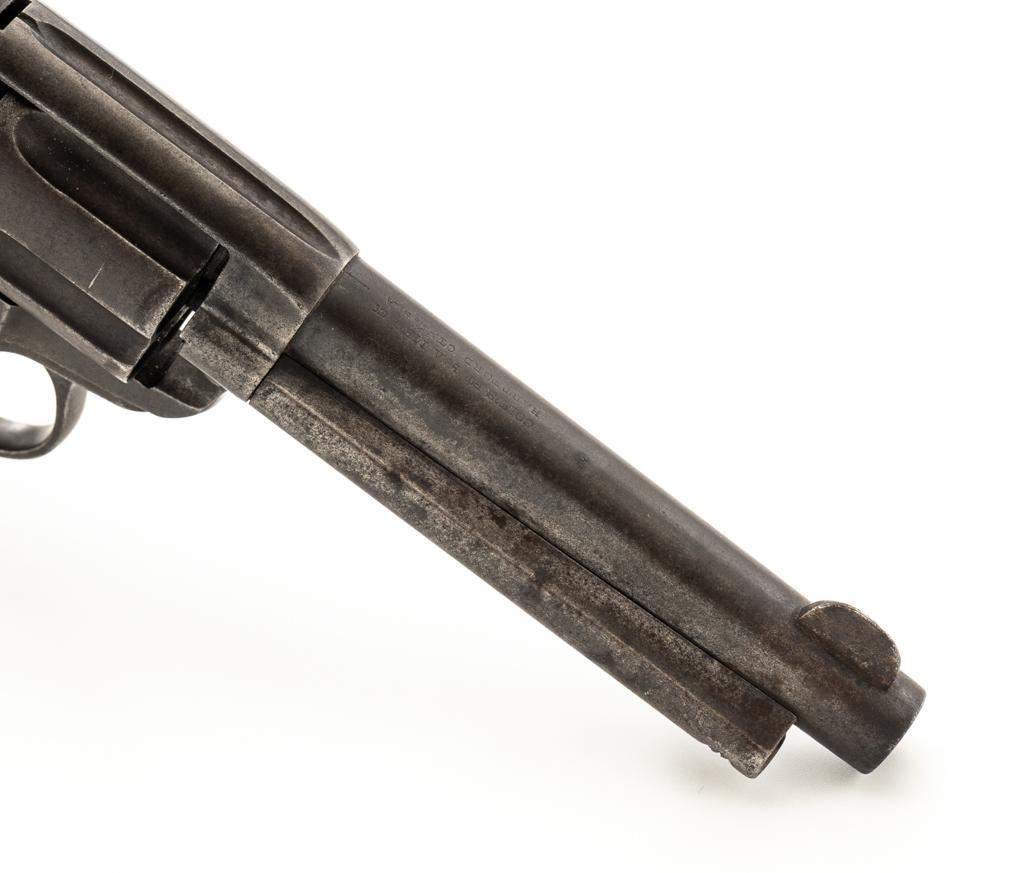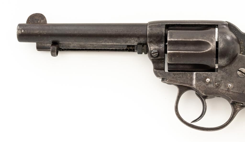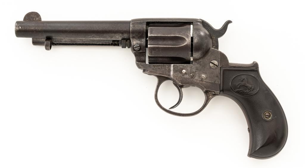 Colt Model 1877 Thunderer Double Action Revolver #91623, .41 cal., 4.5'' barrel, no finish, factory checkered two-piece hard rubber Colt grips, blade front and fixed ''V''-notch rear sight. Matching numbers on the frame, trigger guard, and backstrap. Assembly number ''147'' is stamped inside of the loading gate. Top of the barrel with two-line address; left side is marked ''COLT D.A. 41''. Lower left side of the frame with three-line patent dates and ''(Rampant Colt)''. Mfg'd 1893. Revolver is in good condition, with an even dark brown patina throughout. Grips are worn but still good overall. Action is a little weak but functions smoothly. Bore is fair with visible rifling and scattered moderate erosion. Est.: $400-$600. (Antique)