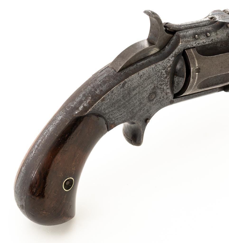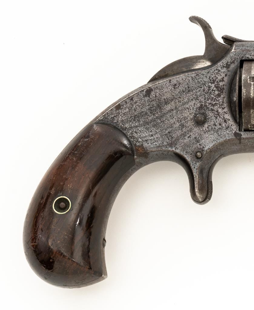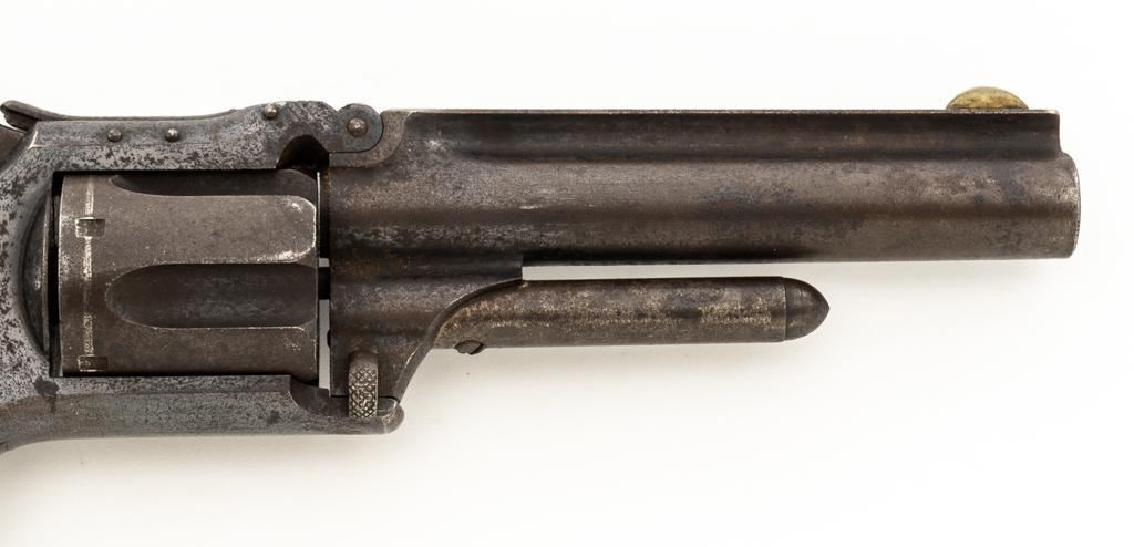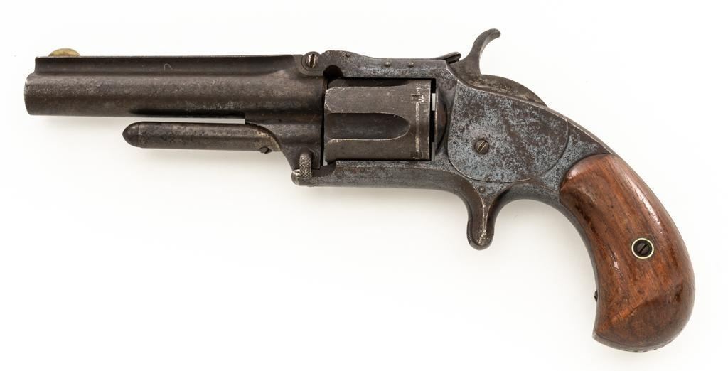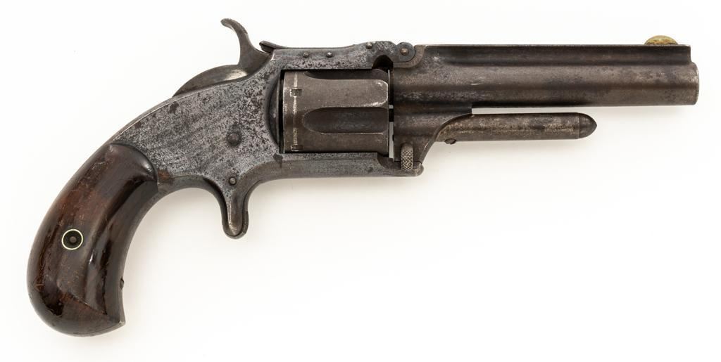 Smith & Wesson Model 1-1/2 Tip-Up Spur Trigger Revolver, #8255, .32 cal., 3.5'' round barrel, fluted cylinder, un-cleaned blued finish, two-piece rosewood grips, brass blade front sight, and notched rear sight. Barrel address is partially obscured by pitting and not completely legible. Mfg'd circa 1868. Overall condition is good+, displaying approx. 40% blue, with the balance gone to an un-cleaned dark patina, with scattered erosion confined primarily to the left side of the gun. Grips are near fine, with much of their rich oil finish remaining. Action functions well. Bore is fair, with visible rifling and scattered moderate erosion. Est.: $300-$400. (Antique)