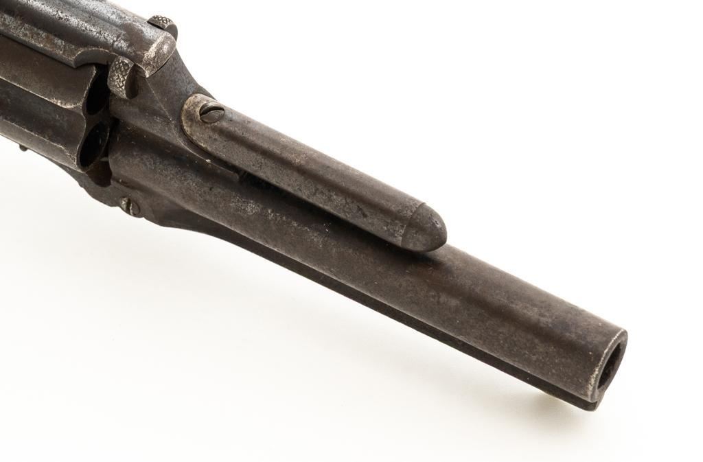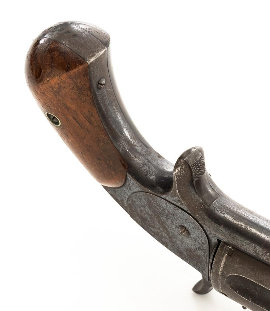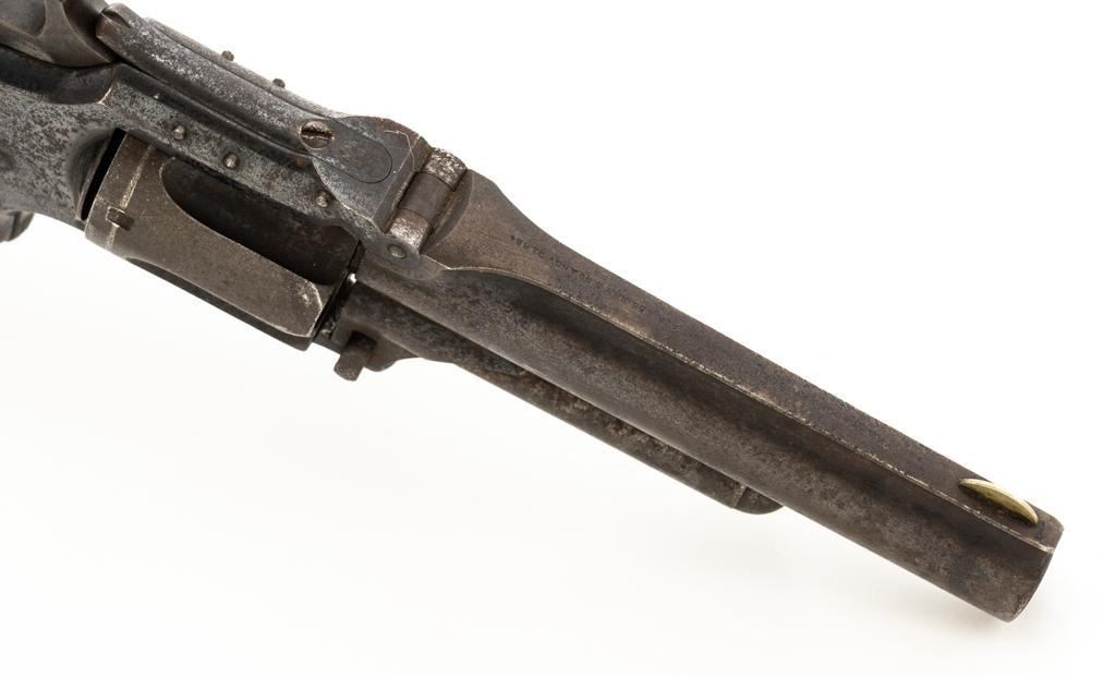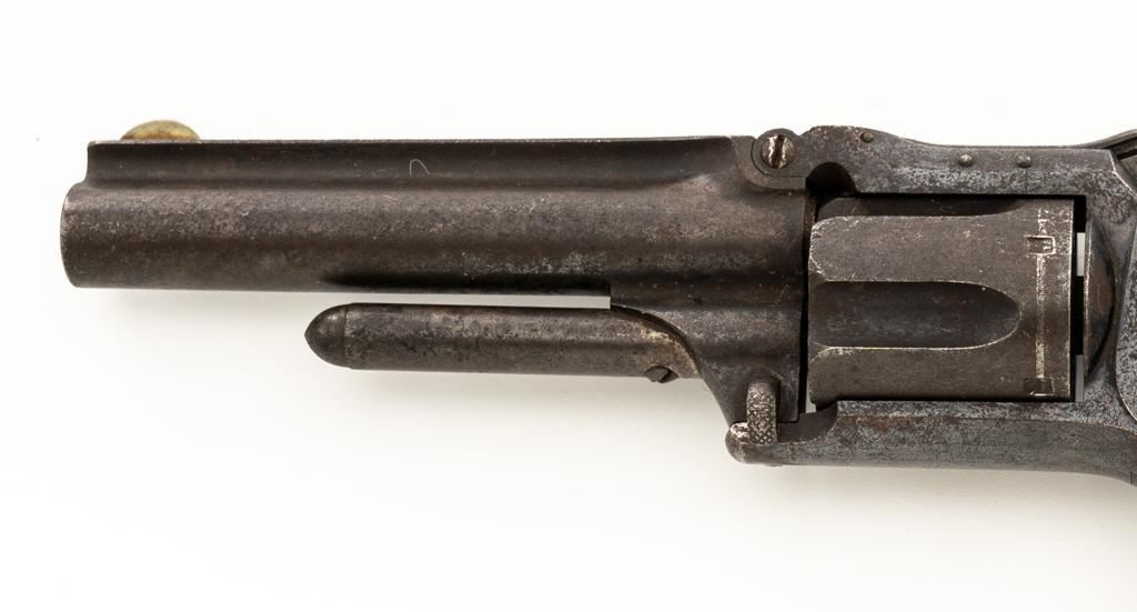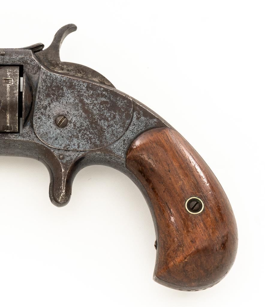 Smith & Wesson Model 1-1/2 Tip-Up Spur Trigger Revolver, #8255, .32 cal., 3.5'' round barrel, fluted cylinder, un-cleaned blued finish, two-piece rosewood grips, brass blade front sight, and notched rear sight. Barrel address is partially obscured by pitting and not completely legible. Mfg'd circa 1868. Overall condition is good+, displaying approx. 40% blue, with the balance gone to an un-cleaned dark patina, with scattered erosion confined primarily to the left side of the gun. Grips are near fine, with much of their rich oil finish remaining. Action functions well. Bore is fair, with visible rifling and scattered moderate erosion. Est.: $300-$400. (Antique)