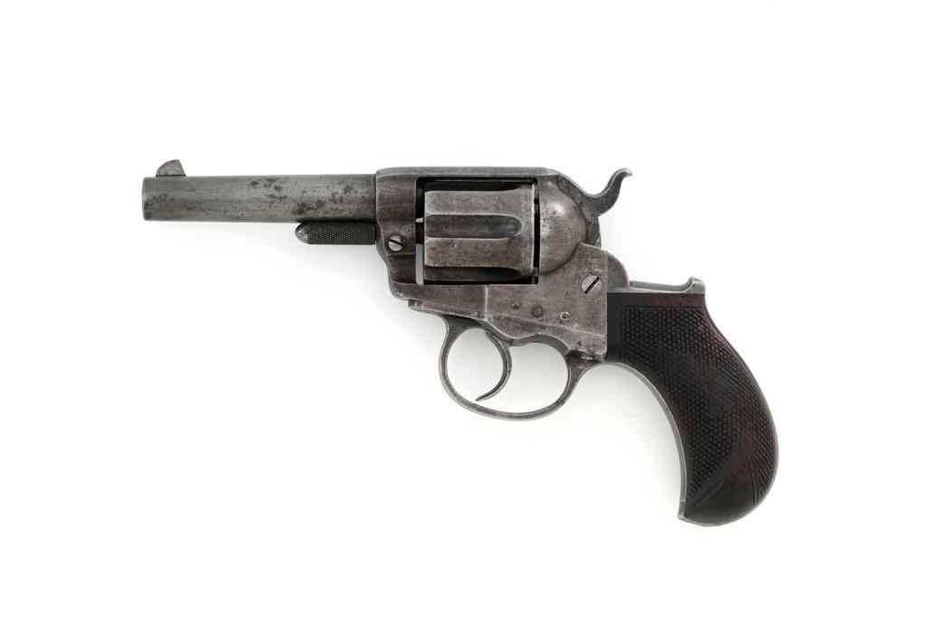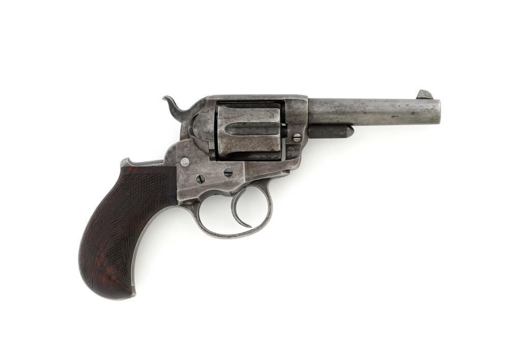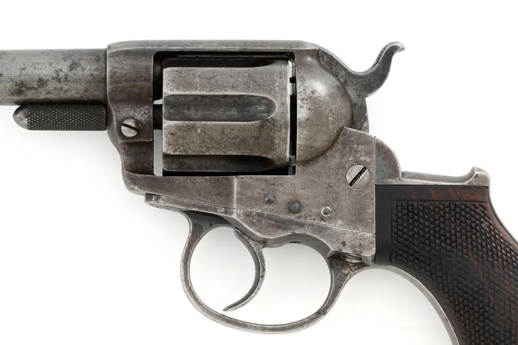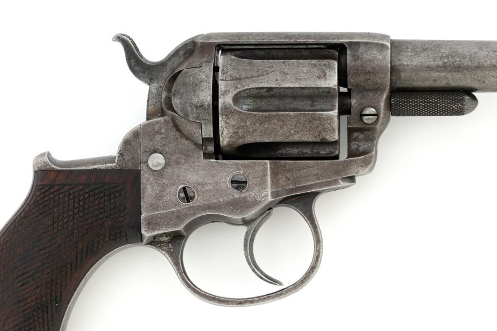 Colt Model 1877 Lightning Double Action Revolver, #466, .38 Colt cal., 3.5'' ejector less barrel, blue and case hardened finish, checkered hardwood grips, blade front and fixed ''V''-notch rear sight. Matching numbers on the frame, barrel assembly, trigger guard, and backstrap. Assembly number ''182'' is stamped inside the loading gate. Barrel with two-line address. Lower left side of the frame with patent dates that are only partially visible. Mfg'd 1877. Revolver is in good condition, retaining approx. 10% blue; balance with combination gray/brown patina. Grips are near fine. Action functions well. Bore is good with scattered light erosion. Est.: $400-$600. (Antique)