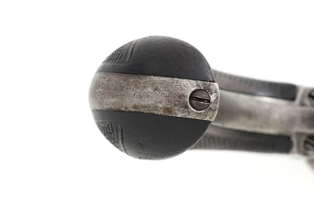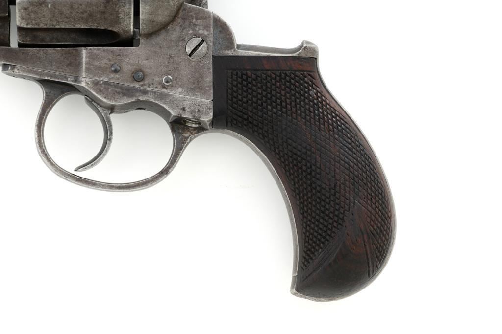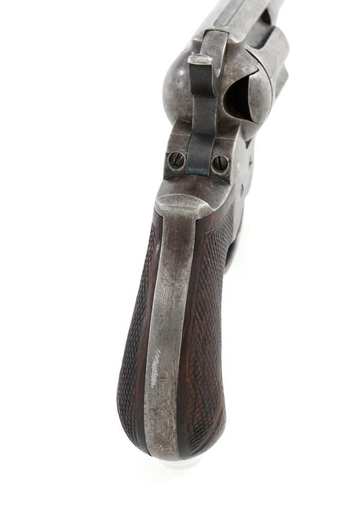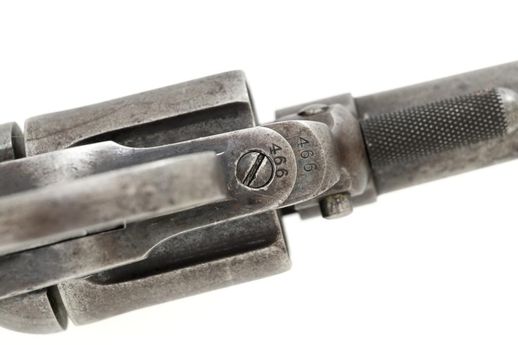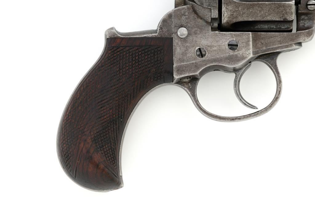 Colt Model 1877 Lightning Double Action Revolver, #466, .38 Colt cal., 3.5'' ejector less barrel, blue and case hardened finish, checkered hardwood grips, blade front and fixed ''V''-notch rear sight. Matching numbers on the frame, barrel assembly, trigger guard, and backstrap. Assembly number ''182'' is stamped inside the loading gate. Barrel with two-line address. Lower left side of the frame with patent dates that are only partially visible. Mfg'd 1877. Revolver is in good condition, retaining approx. 10% blue; balance with combination gray/brown patina. Grips are near fine. Action functions well. Bore is good with scattered light erosion. Est.: $400-$600. (Antique)