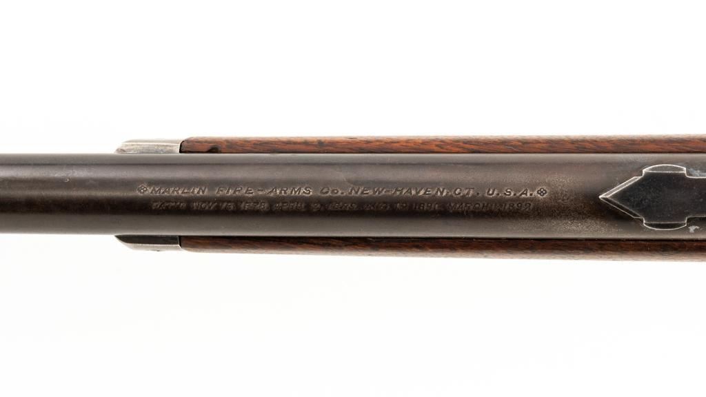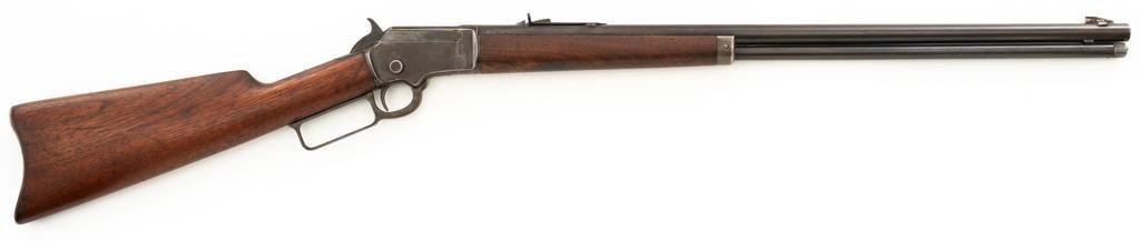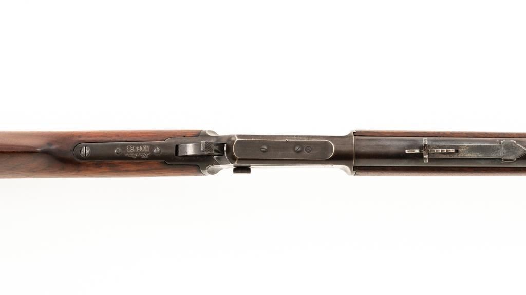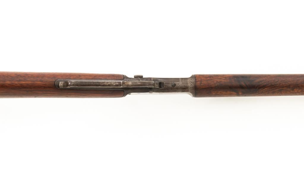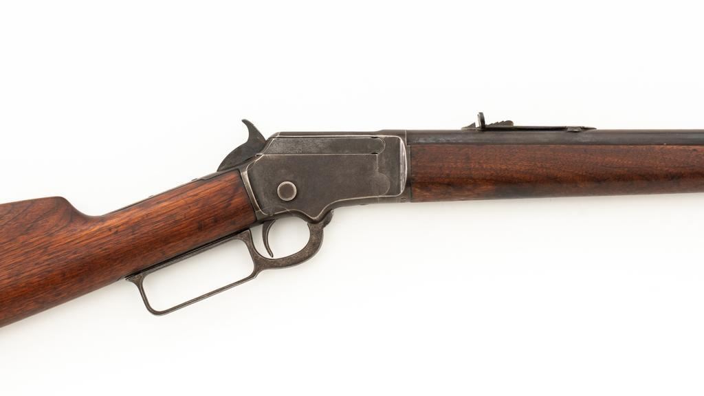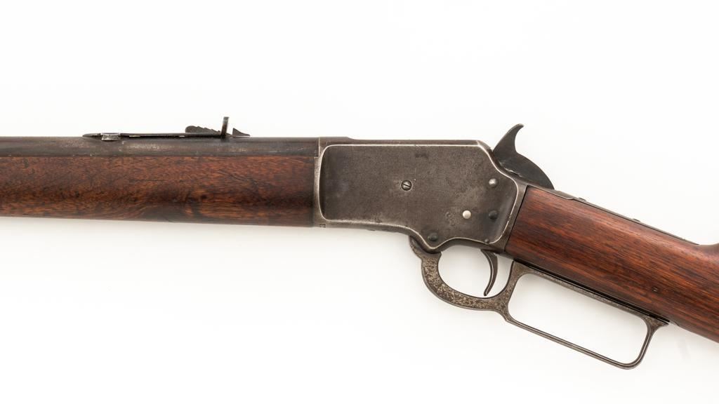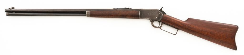 Marlin Model 92 Lever Action Takedown Rifle, #416621, .32 cal., 24'' round barrel, blued finish, case hardened lever and hammer, straight grip walnut stock and forend, crescent steel buttplate, dovetailed Rocky Mountain type front sight, and ''V''-notch rear sight with elevator. Mfg'd circa 1914. Rifle is in good condition, displaying a mixture of thinning and toning blue finish and brown patina across the barrel and magazine tube. Receiver has a dark mottled appearance. Sides of the lever with some silvered case colors; otherwise, dark. Wood is fine, showing expected moderate dents and scratches due to age and use. Markings are clear. Action is crisp and functions smoothly. Bore with scattered spots of moderate erosion and clearly defined rifling. Est.: $500-$700. (C&R/PPT)
