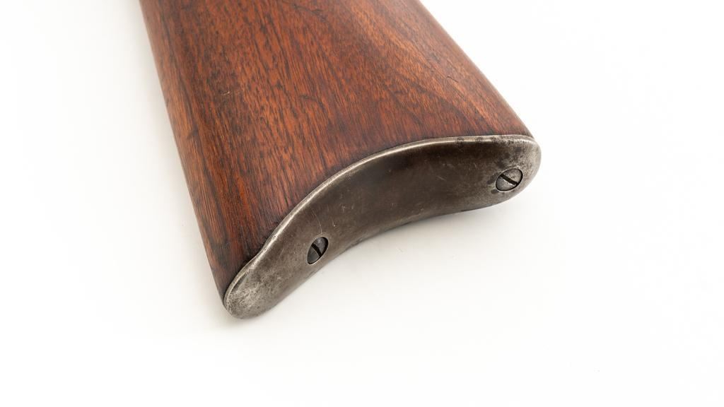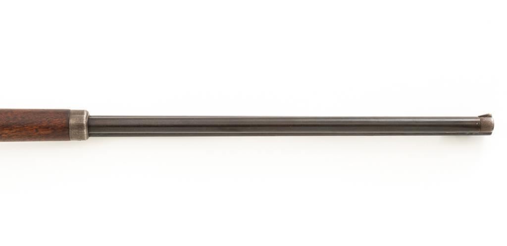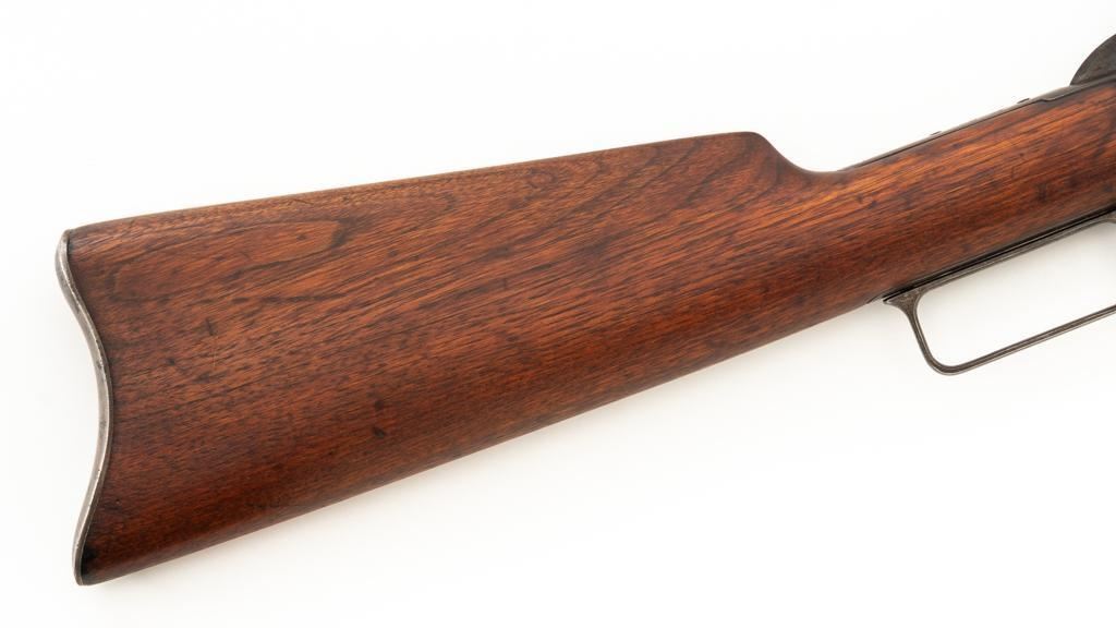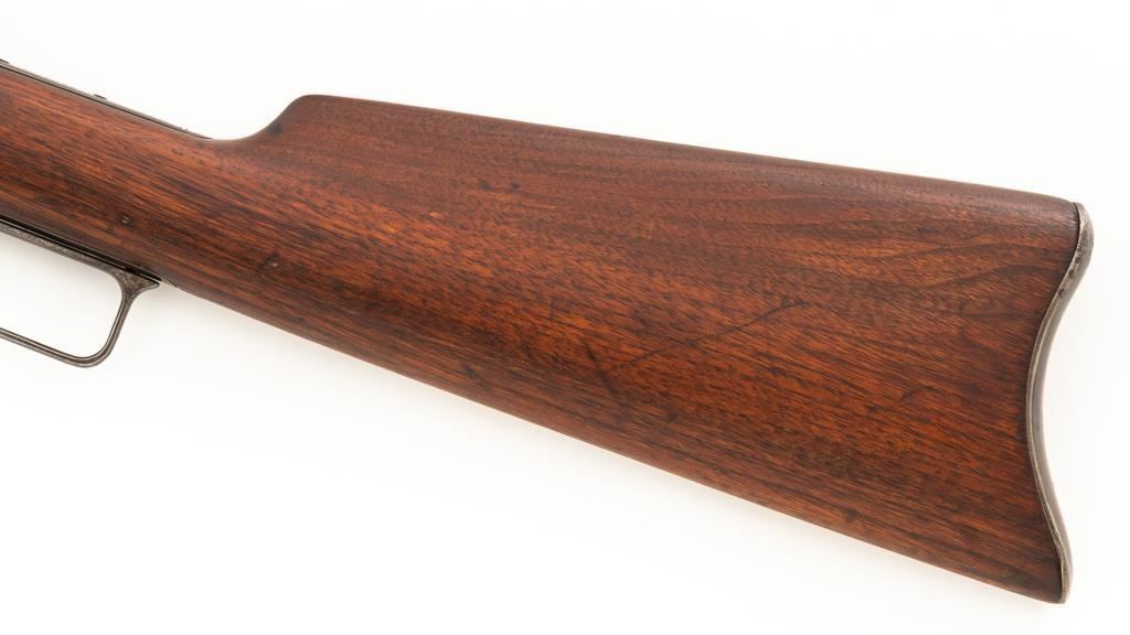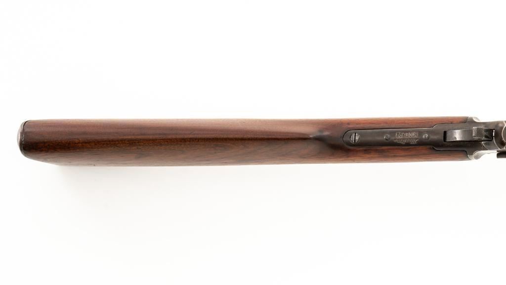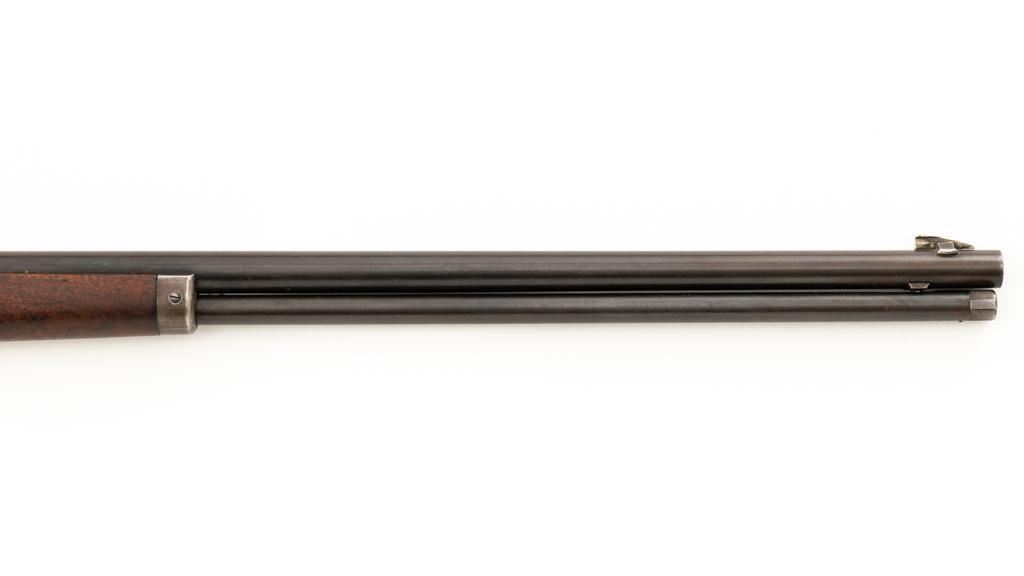 Marlin Model 92 Lever Action Takedown Rifle, #416621, .32 cal., 24'' round barrel, blued finish, case hardened lever and hammer, straight grip walnut stock and forend, crescent steel buttplate, dovetailed Rocky Mountain type front sight, and ''V''-notch rear sight with elevator. Mfg'd circa 1914. Rifle is in good condition, displaying a mixture of thinning and toning blue finish and brown patina across the barrel and magazine tube. Receiver has a dark mottled appearance. Sides of the lever with some silvered case colors; otherwise, dark. Wood is fine, showing expected moderate dents and scratches due to age and use. Markings are clear. Action is crisp and functions smoothly. Bore with scattered spots of moderate erosion and clearly defined rifling. Est.: $500-$700. (C&R/PPT)