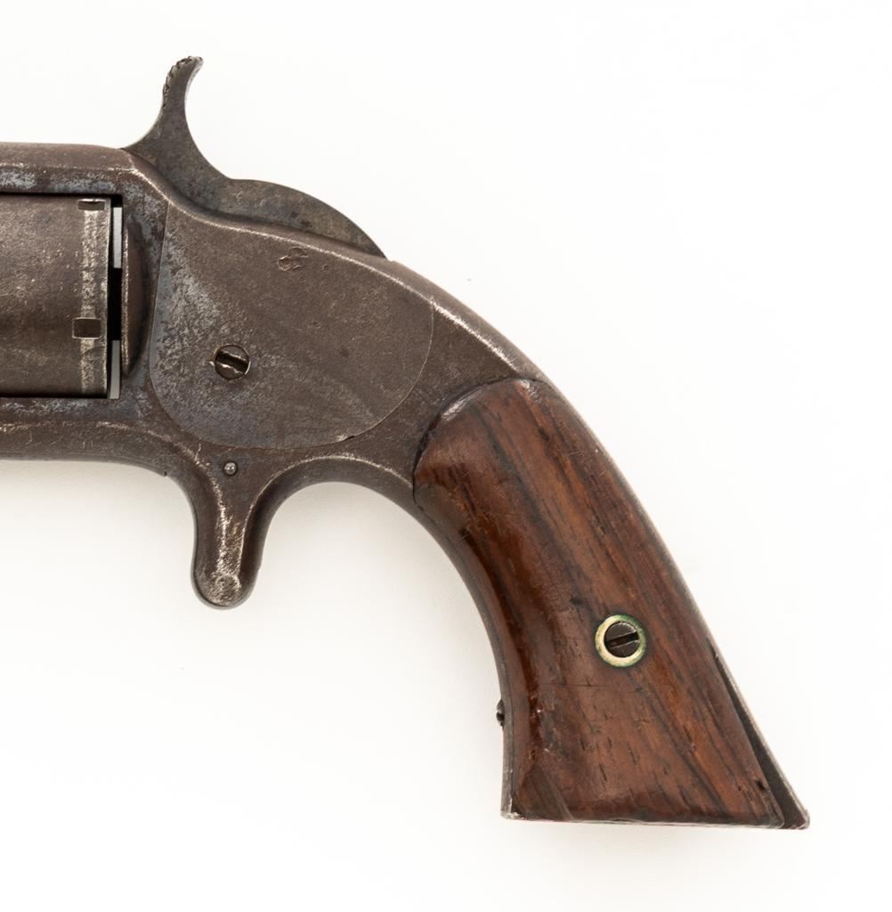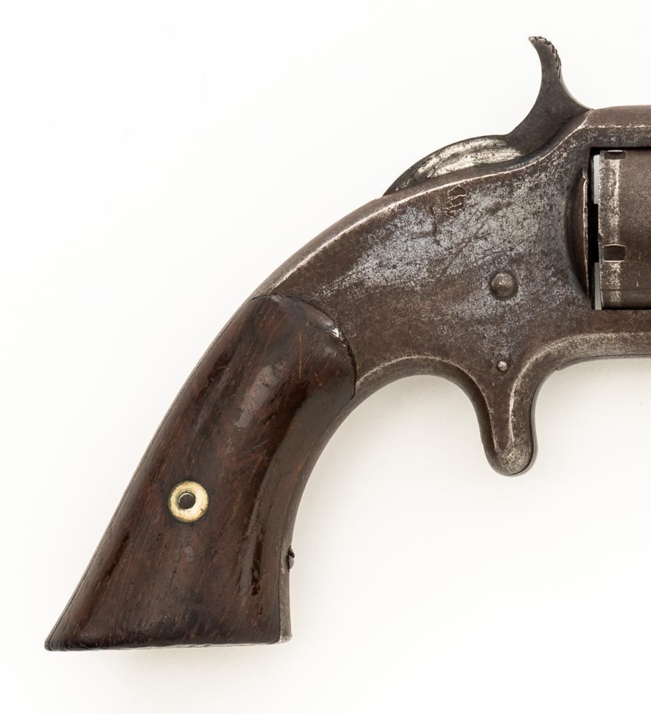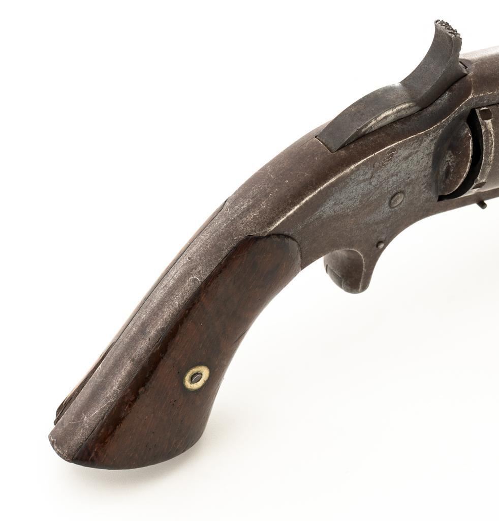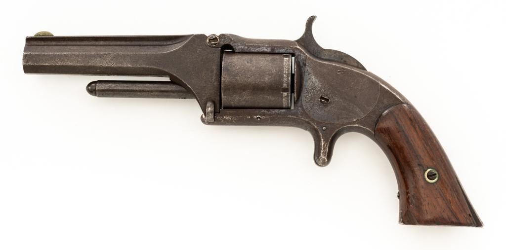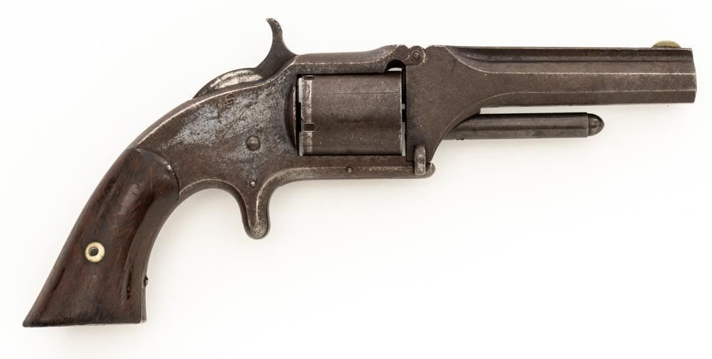 Smith & Wesson First Issue Model 1-1/2 Tip-Up Spur Trigger Revolver, #13259, .32 rimfire (black powder), 3.5'' octagon barrel, blued finish, two-piece hardwood grips, brass blade front sight. Barrel address reads ''SMITH & WESSON SPRINGFIELD. MASS'' / ''PAT'D. APR. 3. 1855. & JULY 5. 1859.''. Mfg'd 1865-68. Overall condition is very good, displaying approx. 30% blue, with the balance gone to a pleasing black/brown patina. Grips are good showing beautiful grain patterns, with small old losses to the bottom of the left grip panel. Action functions well. Bore is very good with clear rifling. Est.: $300-500. (Antique)