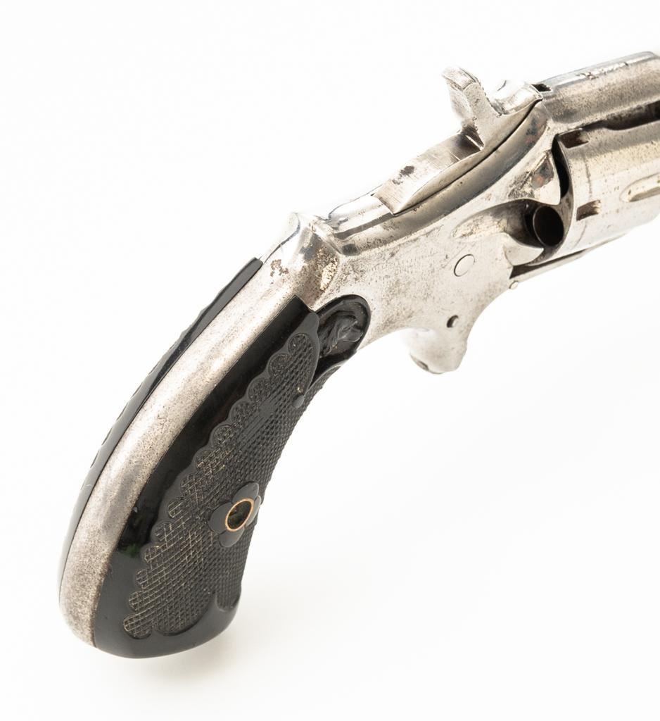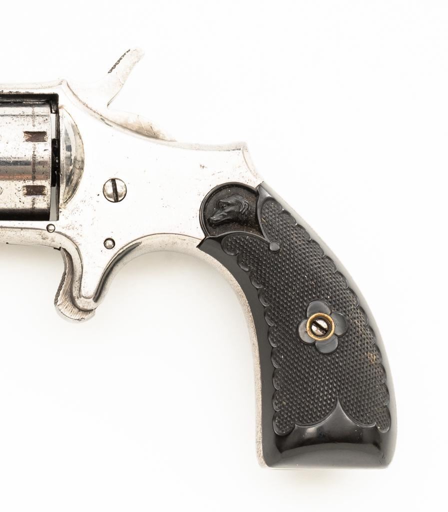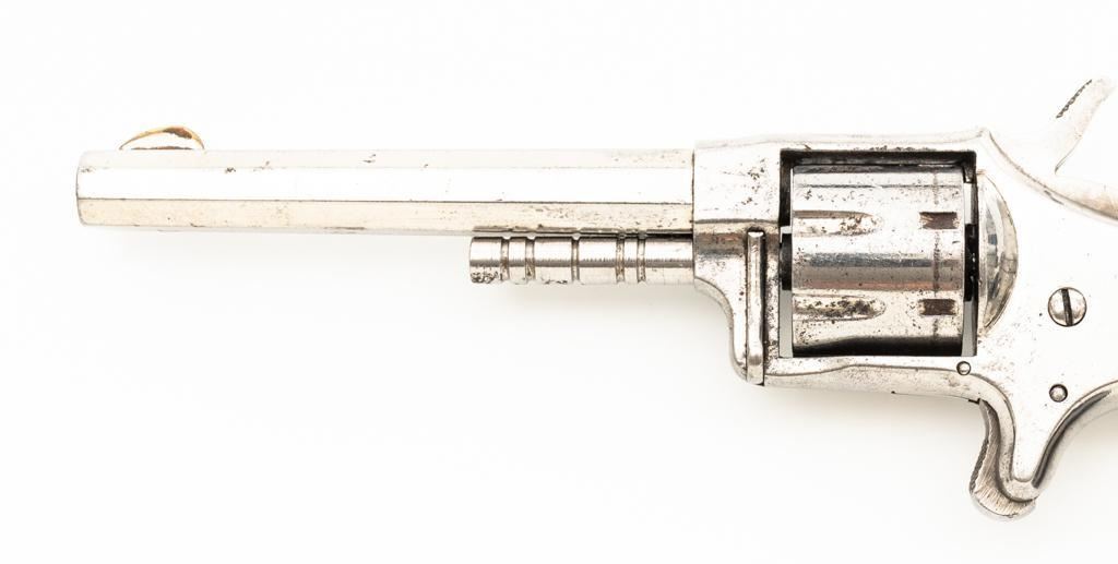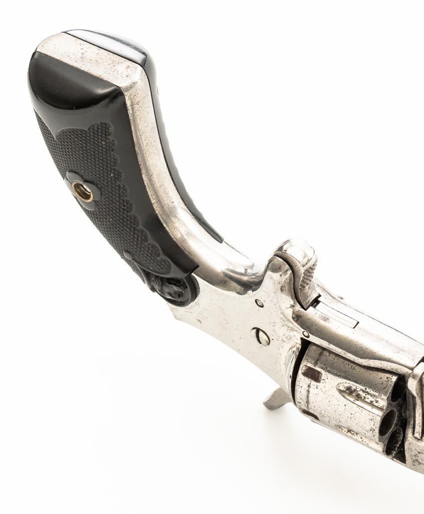 CZAR'' Spur Trigger Seven-Shot Revolver by Hopkins & Allen, #2514, .22 cal., 3.5'' octagon barrel, fluted cylinder, nickel finish, two-piece checkered gutta percha type black grips with dog's head emblem at the top of each panel; fixed blade front sight and notched rear sight. Interior of the right grip panel with matching serial number. Marked ''CZAR'' on the top strap and ''PAT. MCH 28. 73 MAY 27. 79'' on top of the barrel. Mfg'd circa late-1800's. Overall condition is good as refinished, showing most of its nickel finish, with scattered old pitting. Grips are fine. Action functions well. Bore is fair, with visible rifling and scattered erosion. Est.: $150-$250. (Antique)