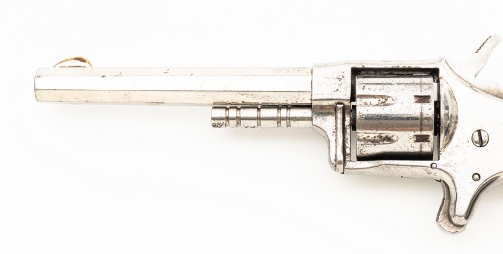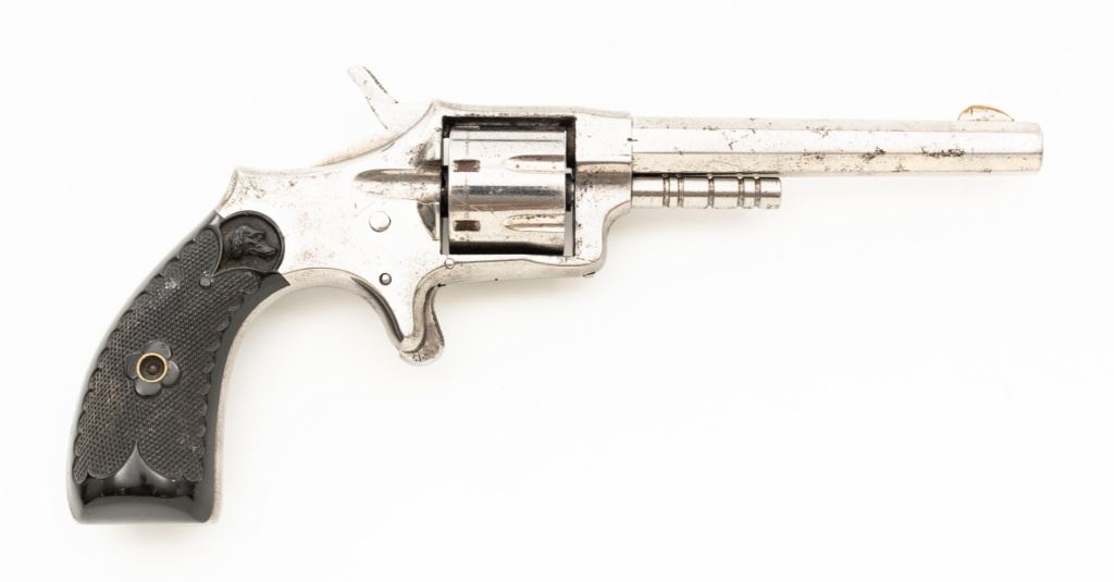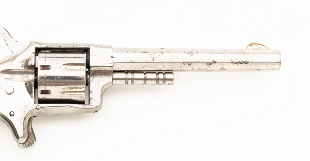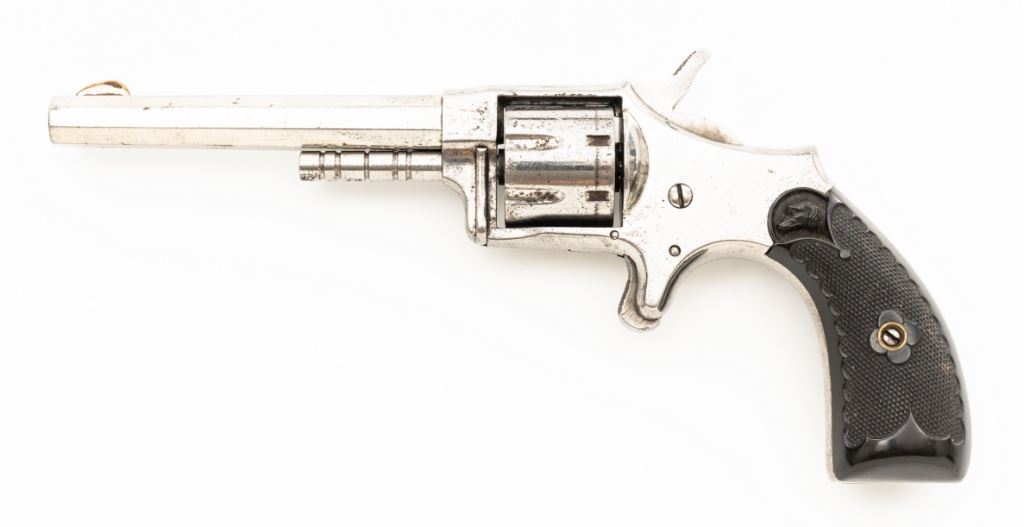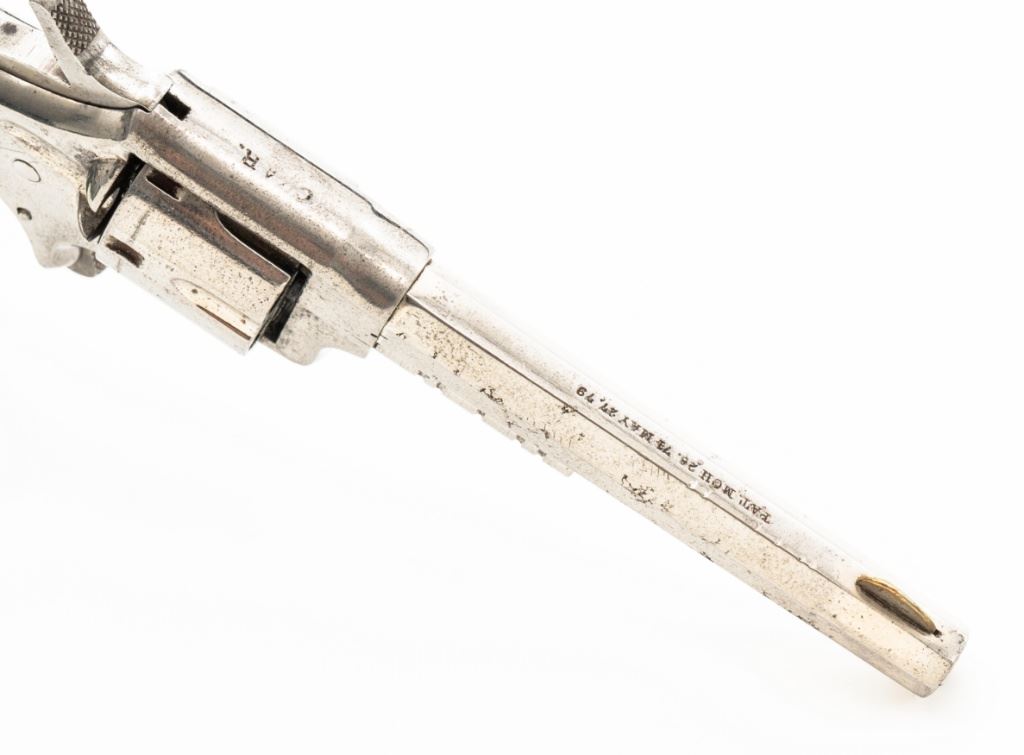 CZAR'' Spur Trigger Seven-Shot Revolver by Hopkins & Allen, #2514, .22 cal., 3.5'' octagon barrel, fluted cylinder, nickel finish, two-piece checkered gutta percha type black grips with dog's head emblem at the top of each panel; fixed blade front sight and notched rear sight. Interior of the right grip panel with matching serial number. Marked ''CZAR'' on the top strap and ''PAT. MCH 28. 73 MAY 27. 79'' on top of the barrel. Mfg'd circa late-1800's. Overall condition is good as refinished, showing most of its nickel finish, with scattered old pitting. Grips are fine. Action functions well. Bore is fair, with visible rifling and scattered erosion. Est.: $150-$250. (Antique)