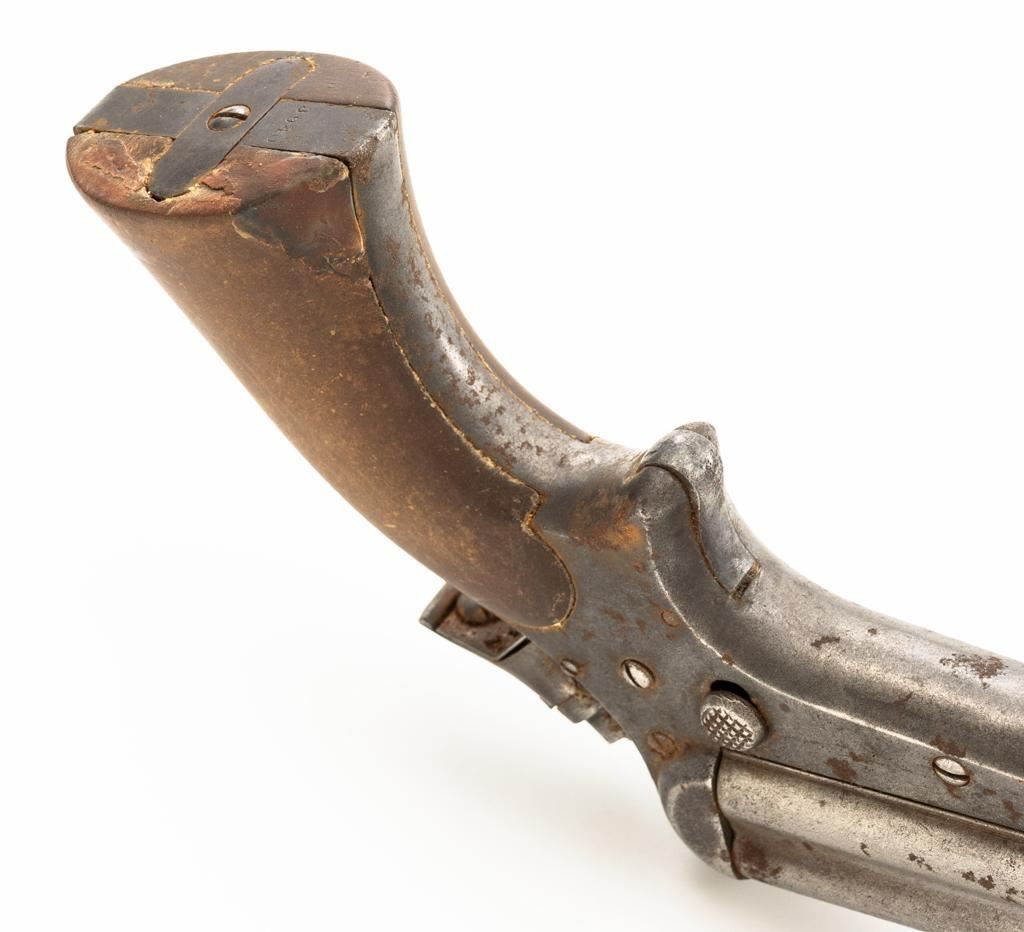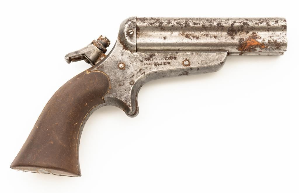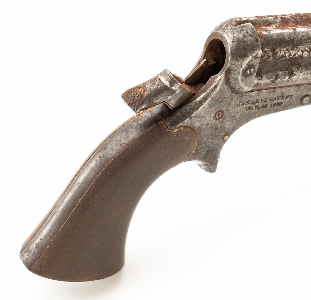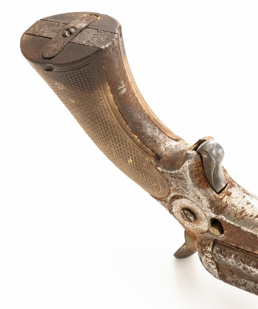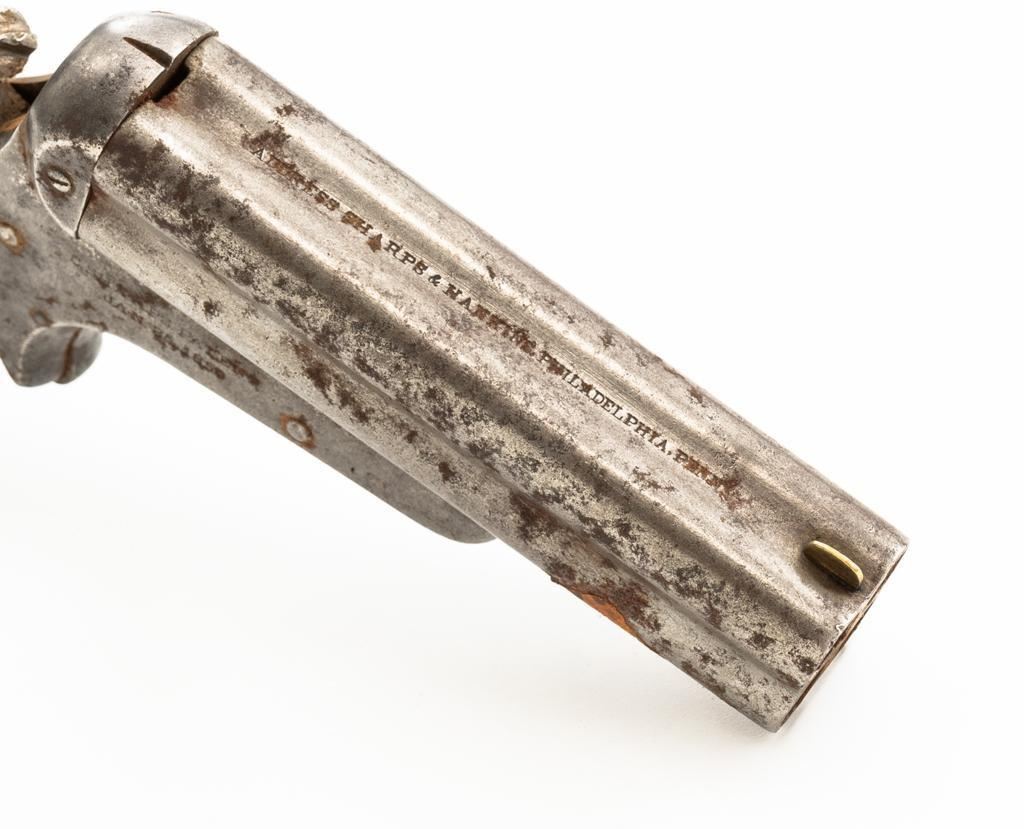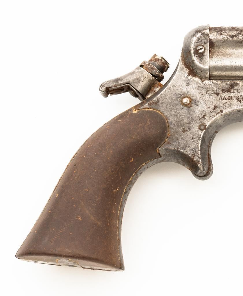 Lot of Three (3) C. Sharps 3rd Model Pepperbox Pistols: 1.) #2607, .32 RF cal., 3.5'' barrels, blue finish, smooth Gutta Percha two-piece grips, with iron frame. Factory markings are mostly legible, except for the barrel address, which is partially obscured. In fair overall condition, showing scattered surface rust due to poor storage. Action is rusted shut and non-functioning. Bores are dark with surface rust and erosion. 2.) #3940, .32 RF cal., 3.5'' barrels, blue finish, smooth Gutta Percha two-piece grips, with iron frame. Factory markings are legible, including a good Sharps & Hankins barrel address. In fair overall condition, showing scattered surface rust due to poor storage. Left grip panel shows old, crude repairs at the base. Hammer is stuck in the cocked position. Action is rusted shut and non-functioning. Bores are dark with surface rust and erosion. 3.) #1190, .32 RF cal., 3.5'' barrels, blue finish, checkered Gutta Percha two-piece grips, with nickeled iron frame. Factory markings are mostly legible, except for the barrel address, which is partially obscured. Pistol is in poor overall condition, with the metal surfaces having gone to dark patina with moderate to heavy surface rust along the barrels due to poor storage. Although discolored, the grips show good checkering detail and fit. Est.: $400-$600/lot. (Antique)
