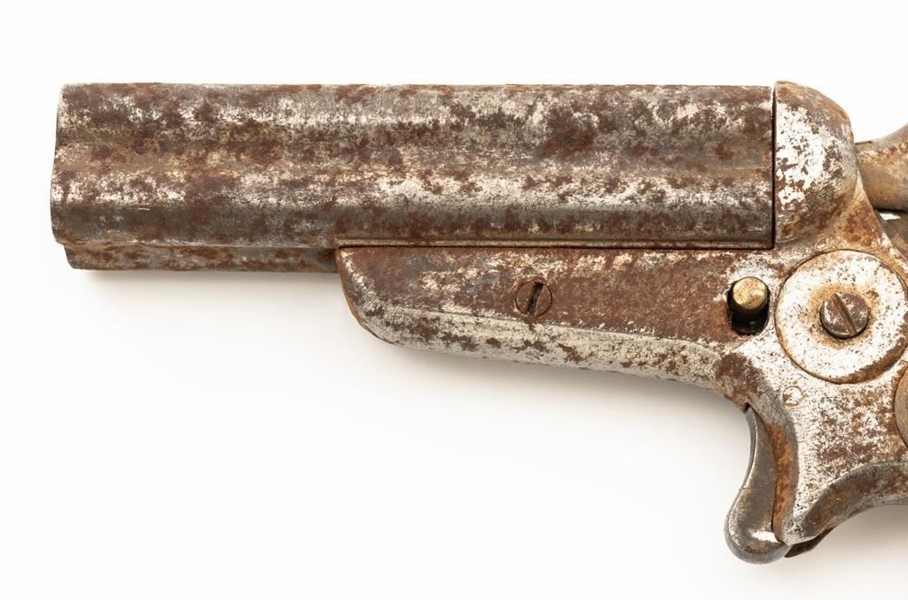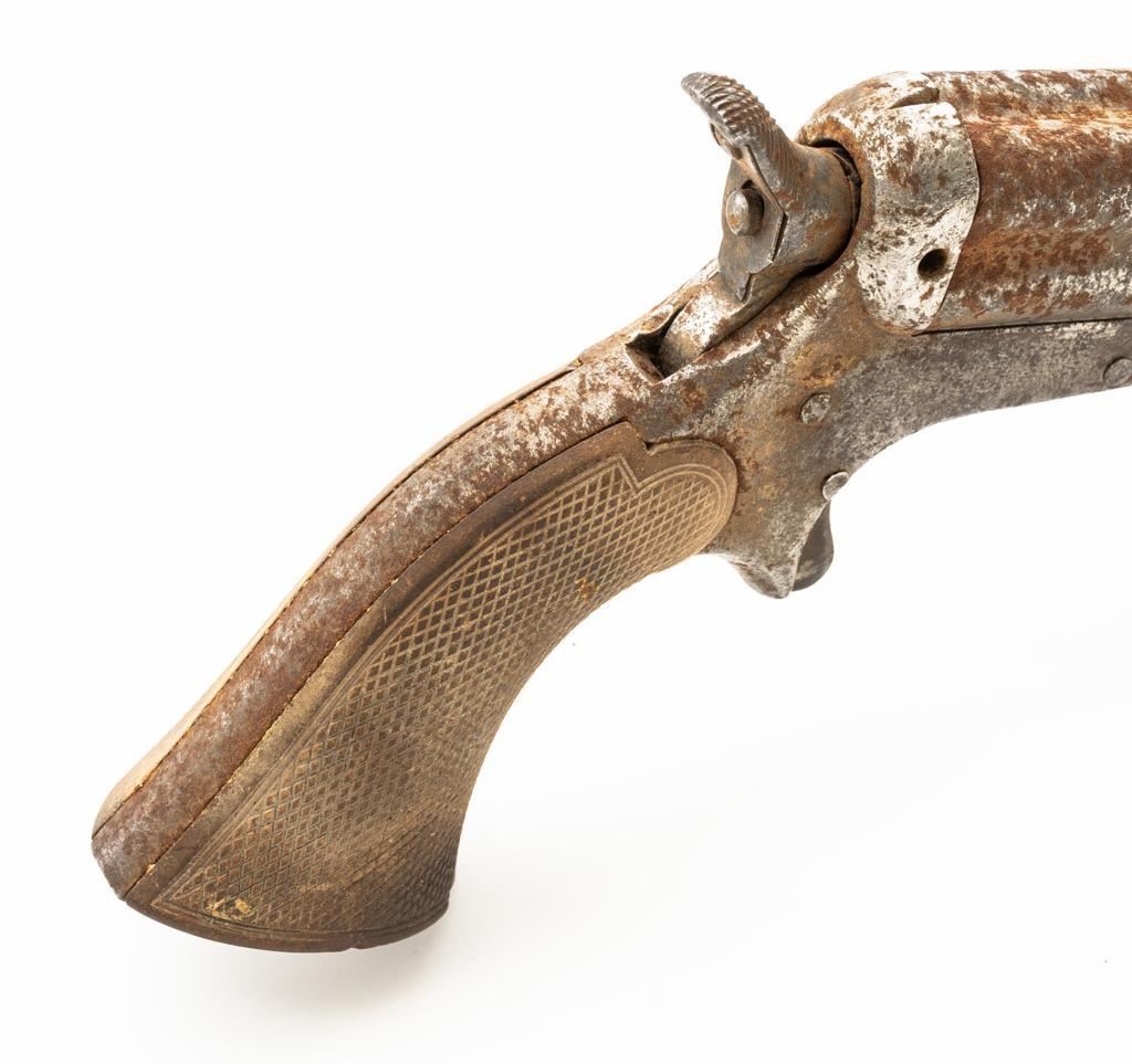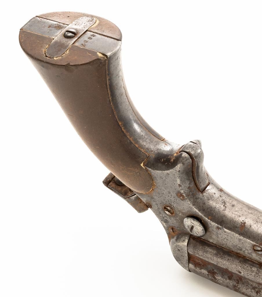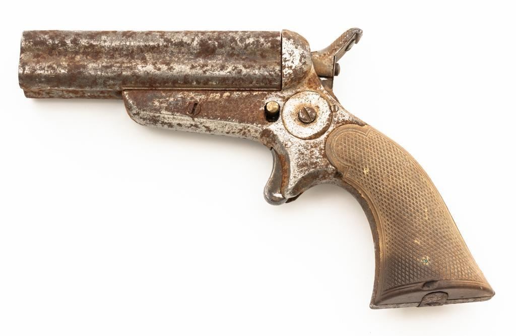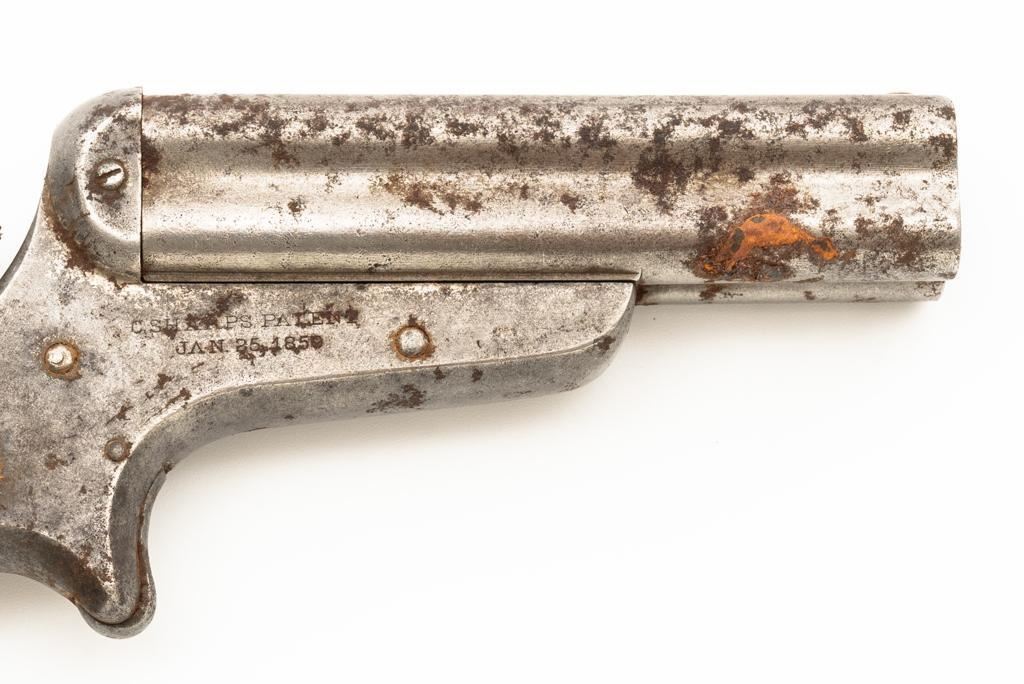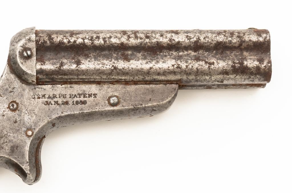 Lot of Three (3) C. Sharps 3rd Model Pepperbox Pistols: 1.) #2607, .32 RF cal., 3.5'' barrels, blue finish, smooth Gutta Percha two-piece grips, with iron frame. Factory markings are mostly legible, except for the barrel address, which is partially obscured. In fair overall condition, showing scattered surface rust due to poor storage. Action is rusted shut and non-functioning. Bores are dark with surface rust and erosion. 2.) #3940, .32 RF cal., 3.5'' barrels, blue finish, smooth Gutta Percha two-piece grips, with iron frame. Factory markings are legible, including a good Sharps & Hankins barrel address. In fair overall condition, showing scattered surface rust due to poor storage. Left grip panel shows old, crude repairs at the base. Hammer is stuck in the cocked position. Action is rusted shut and non-functioning. Bores are dark with surface rust and erosion. 3.) #1190, .32 RF cal., 3.5'' barrels, blue finish, checkered Gutta Percha two-piece grips, with nickeled iron frame. Factory markings are mostly legible, except for the barrel address, which is partially obscured. Pistol is in poor overall condition, with the metal surfaces having gone to dark patina with moderate to heavy surface rust along the barrels due to poor storage. Although discolored, the grips show good checkering detail and fit. Est.: $400-$600/lot. (Antique)