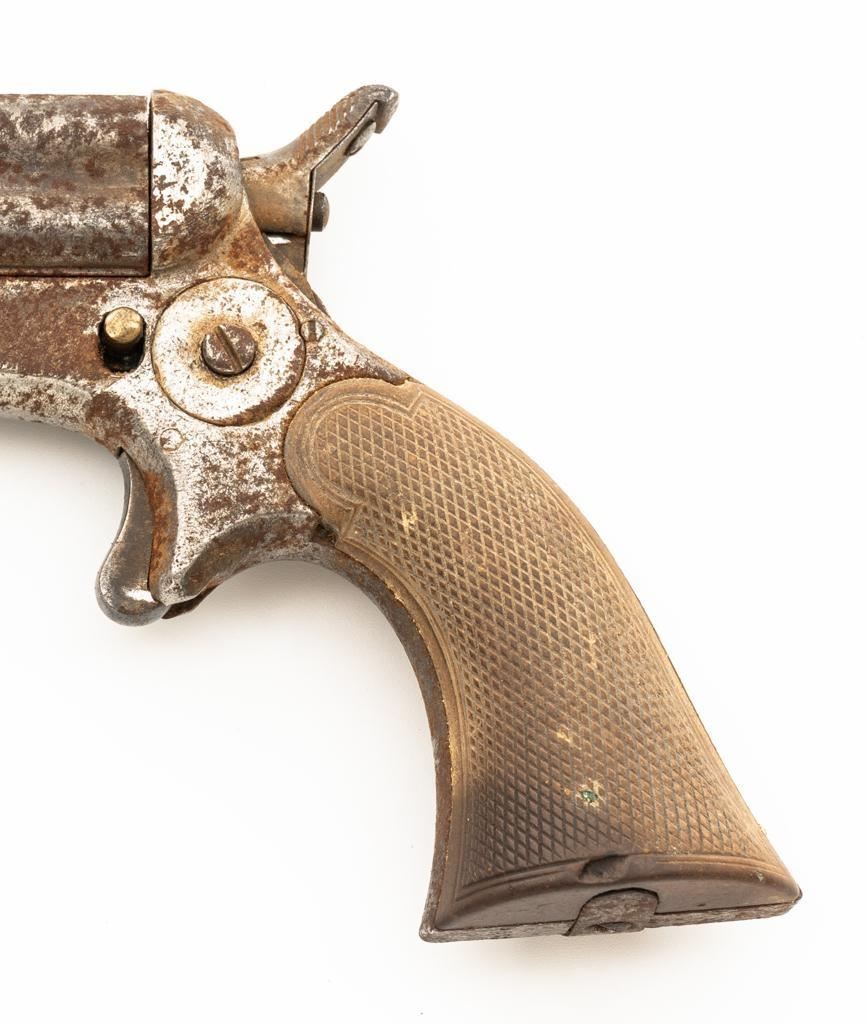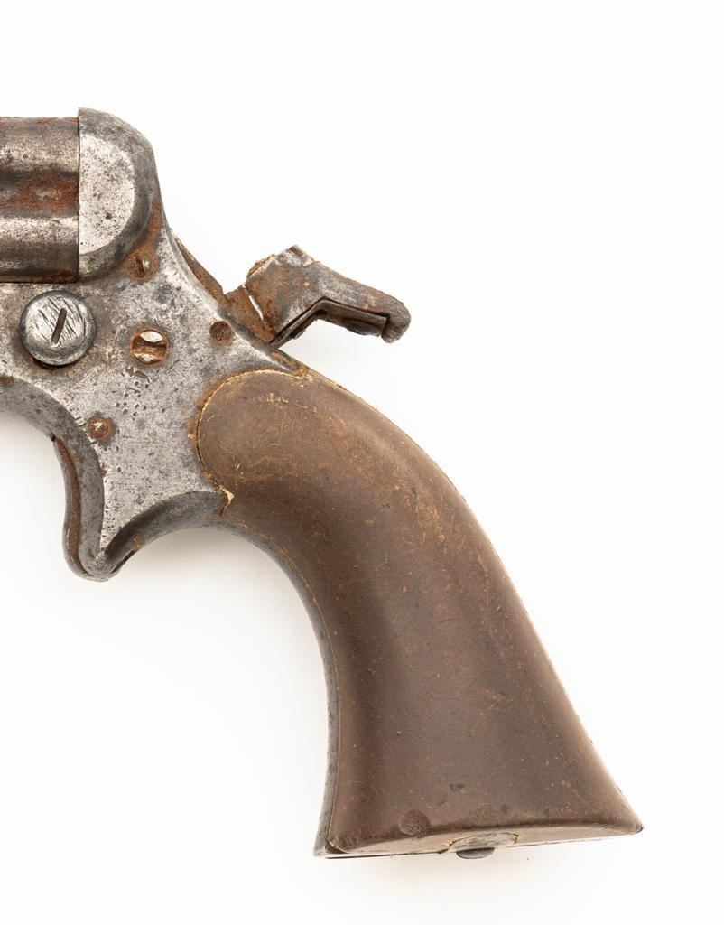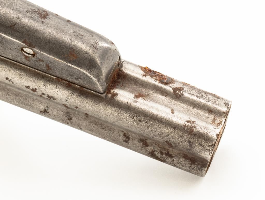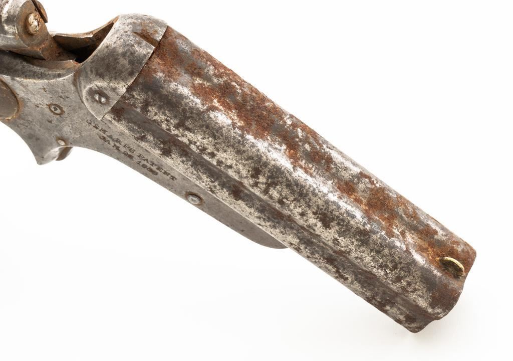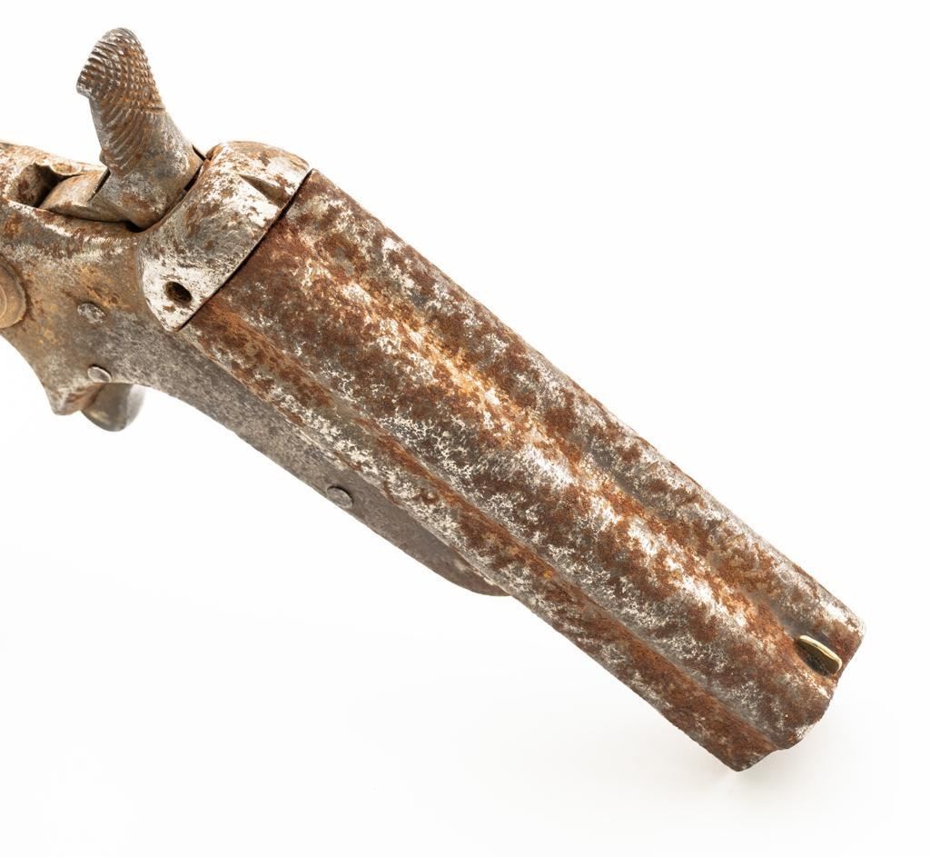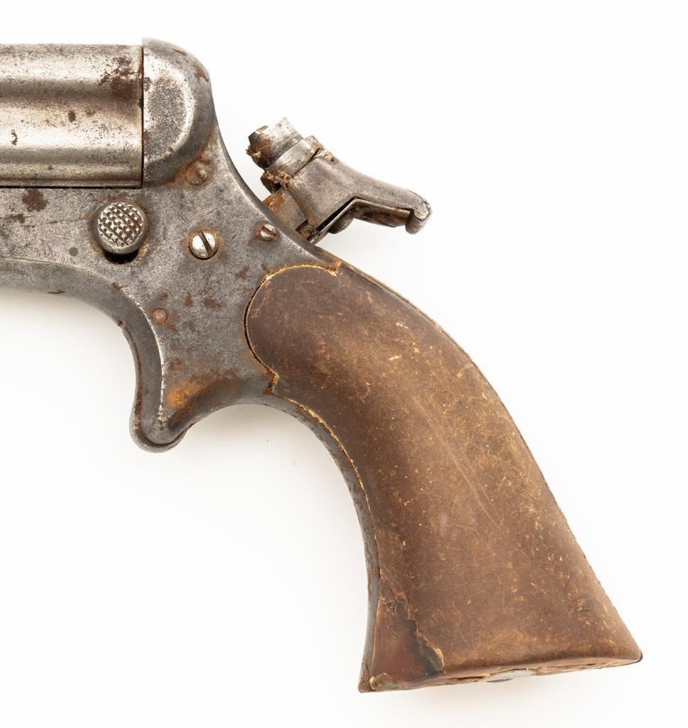 Lot of Three (3) C. Sharps 3rd Model Pepperbox Pistols: 1.) #2607, .32 RF cal., 3.5'' barrels, blue finish, smooth Gutta Percha two-piece grips, with iron frame. Factory markings are mostly legible, except for the barrel address, which is partially obscured. In fair overall condition, showing scattered surface rust due to poor storage. Action is rusted shut and non-functioning. Bores are dark with surface rust and erosion. 2.) #3940, .32 RF cal., 3.5'' barrels, blue finish, smooth Gutta Percha two-piece grips, with iron frame. Factory markings are legible, including a good Sharps & Hankins barrel address. In fair overall condition, showing scattered surface rust due to poor storage. Left grip panel shows old, crude repairs at the base. Hammer is stuck in the cocked position. Action is rusted shut and non-functioning. Bores are dark with surface rust and erosion. 3.) #1190, .32 RF cal., 3.5'' barrels, blue finish, checkered Gutta Percha two-piece grips, with nickeled iron frame. Factory markings are mostly legible, except for the barrel address, which is partially obscured. Pistol is in poor overall condition, with the metal surfaces having gone to dark patina with moderate to heavy surface rust along the barrels due to poor storage. Although discolored, the grips show good checkering detail and fit. Est.: $400-$600/lot. (Antique)