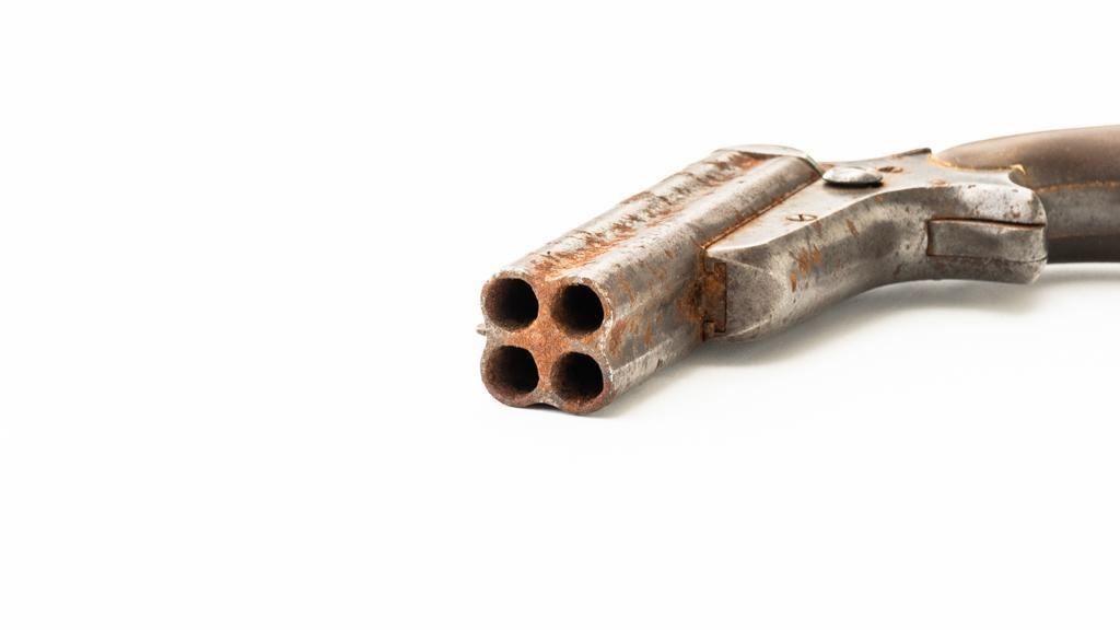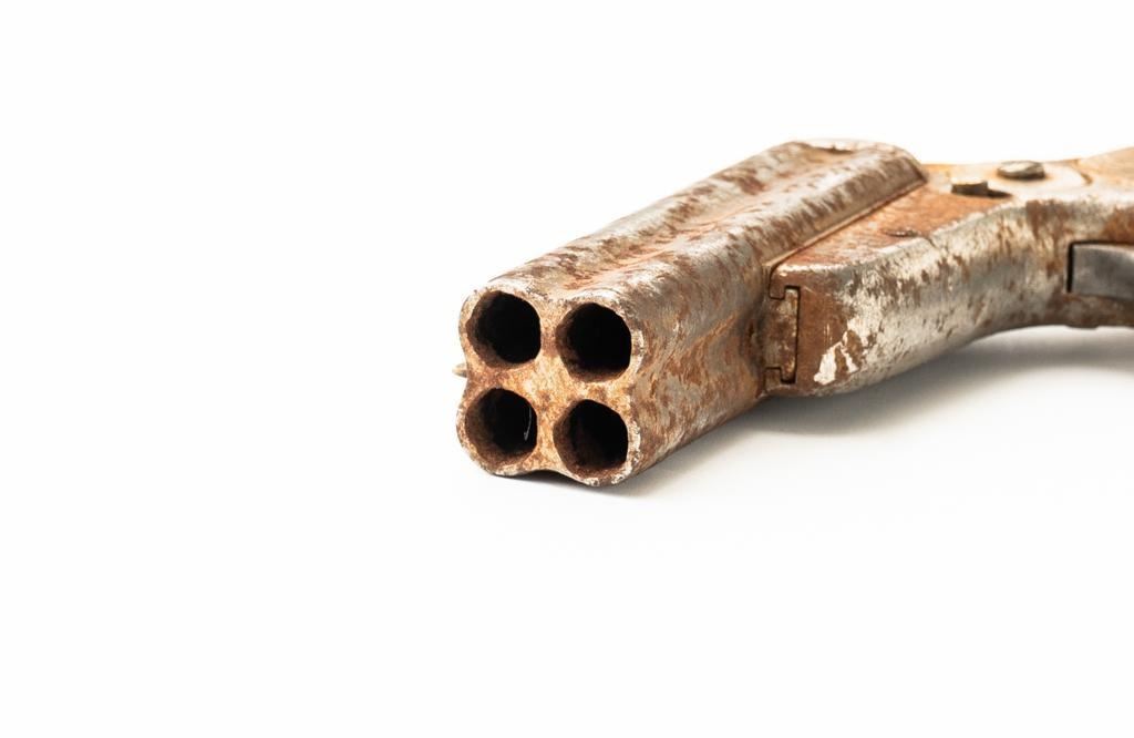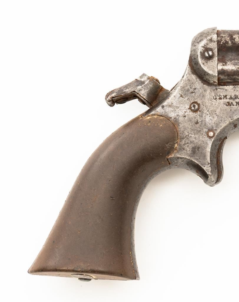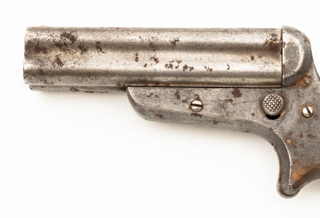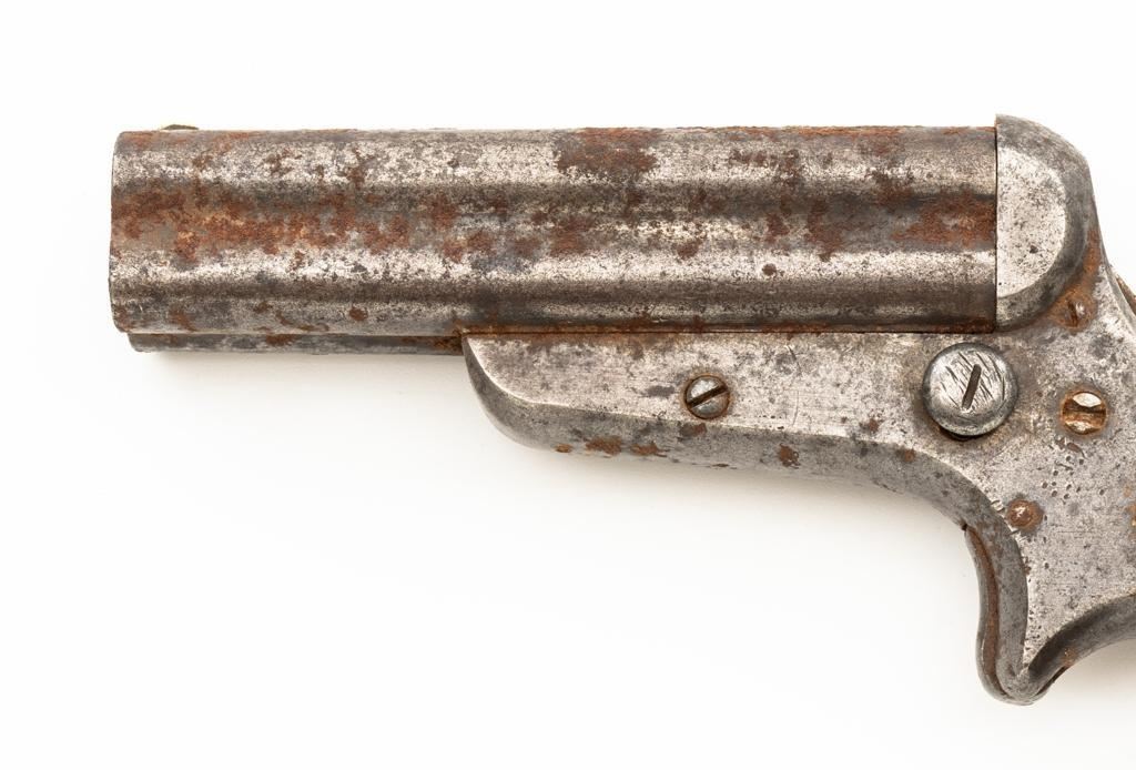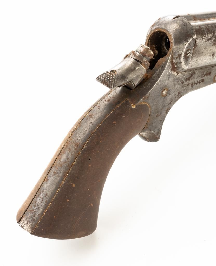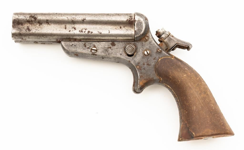 Lot of Three (3) C. Sharps 3rd Model Pepperbox Pistols: 1.) #2607, .32 RF cal., 3.5'' barrels, blue finish, smooth Gutta Percha two-piece grips, with iron frame. Factory markings are mostly legible, except for the barrel address, which is partially obscured. In fair overall condition, showing scattered surface rust due to poor storage. Action is rusted shut and non-functioning. Bores are dark with surface rust and erosion. 2.) #3940, .32 RF cal., 3.5'' barrels, blue finish, smooth Gutta Percha two-piece grips, with iron frame. Factory markings are legible, including a good Sharps & Hankins barrel address. In fair overall condition, showing scattered surface rust due to poor storage. Left grip panel shows old, crude repairs at the base. Hammer is stuck in the cocked position. Action is rusted shut and non-functioning. Bores are dark with surface rust and erosion. 3.) #1190, .32 RF cal., 3.5'' barrels, blue finish, checkered Gutta Percha two-piece grips, with nickeled iron frame. Factory markings are mostly legible, except for the barrel address, which is partially obscured. Pistol is in poor overall condition, with the metal surfaces having gone to dark patina with moderate to heavy surface rust along the barrels due to poor storage. Although discolored, the grips show good checkering detail and fit. Est.: $400-$600/lot. (Antique)