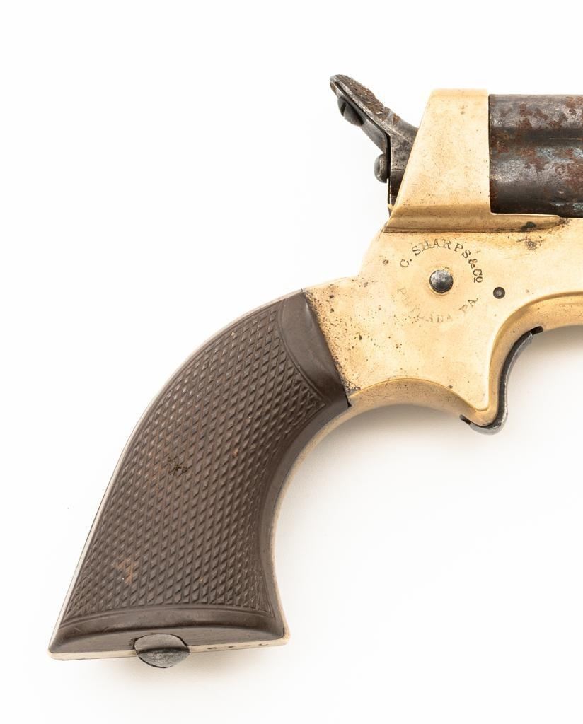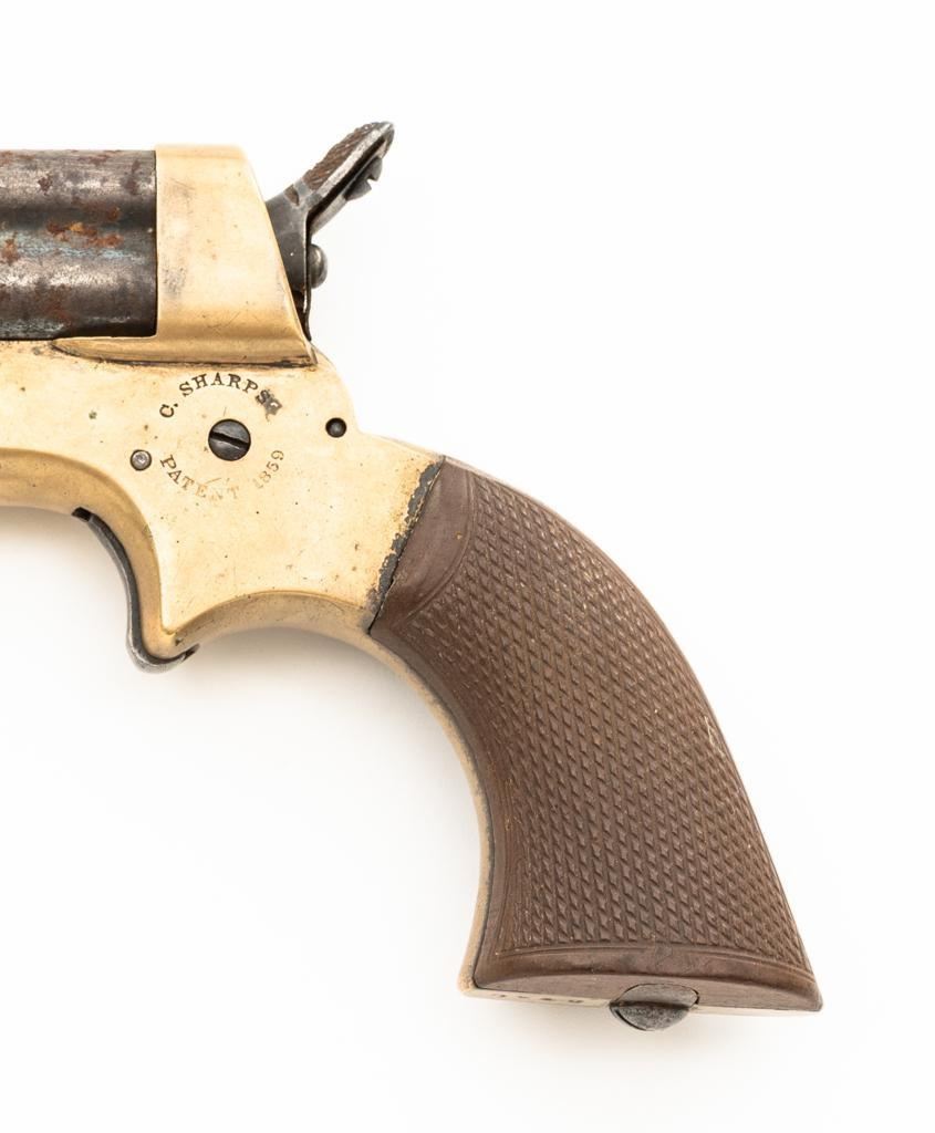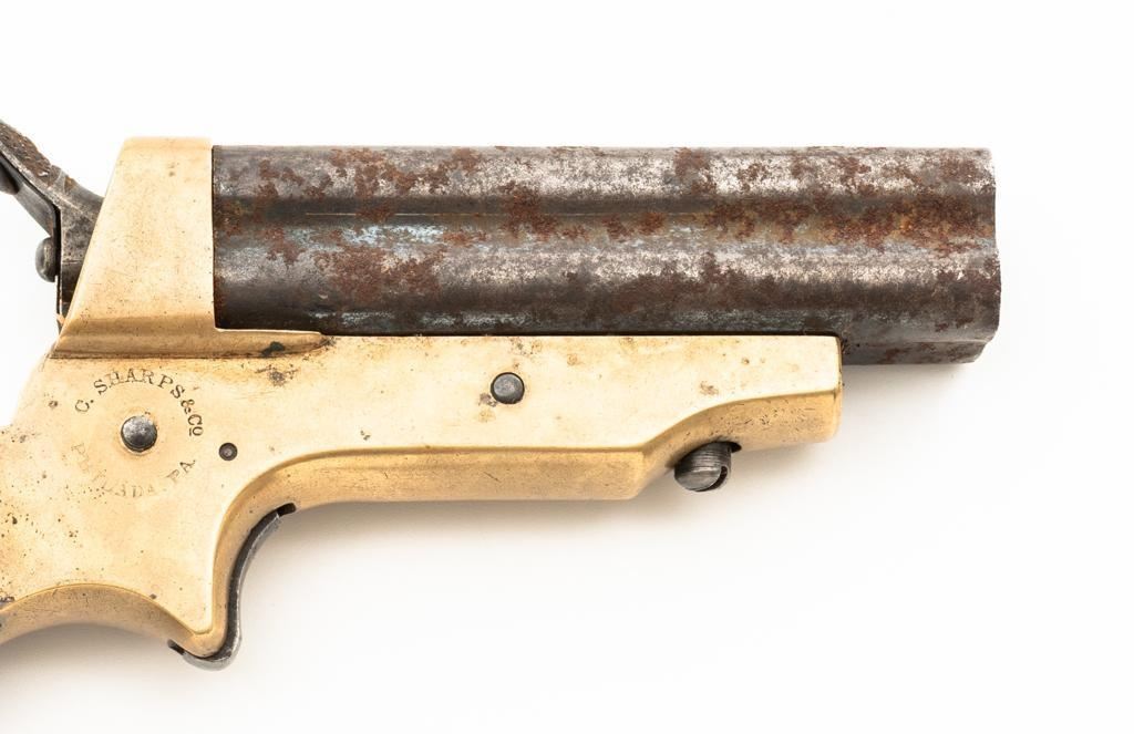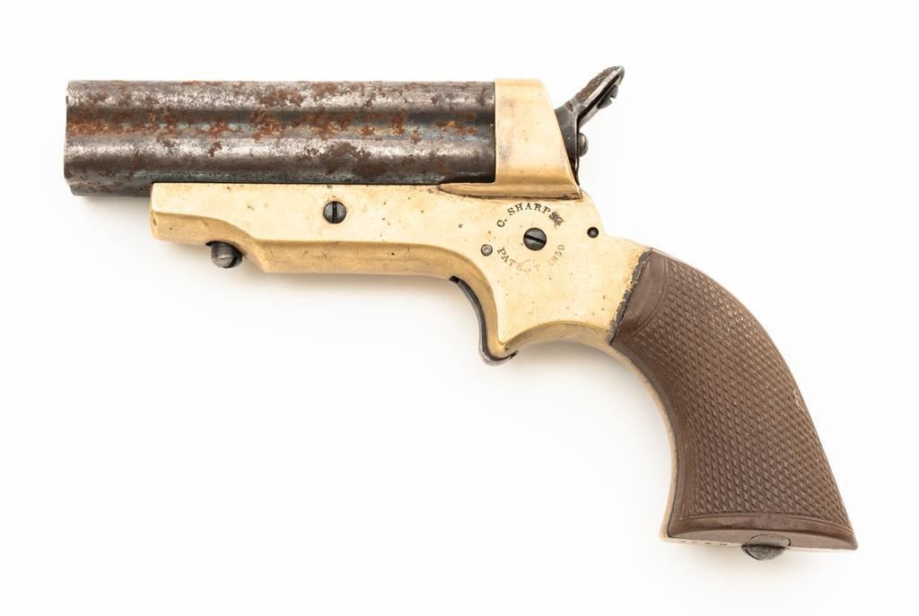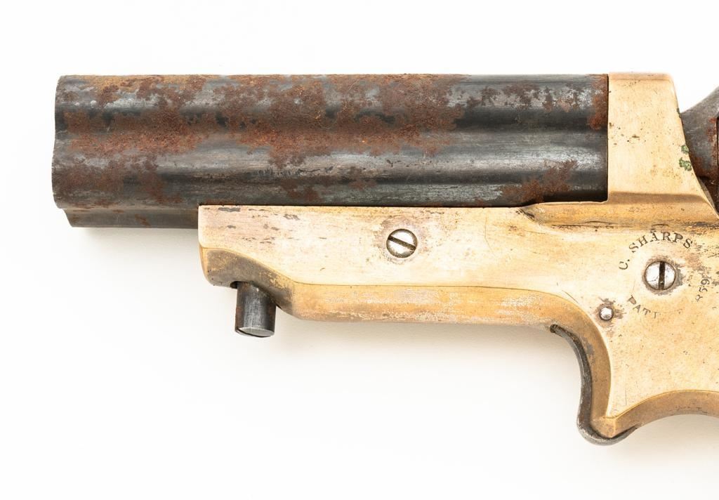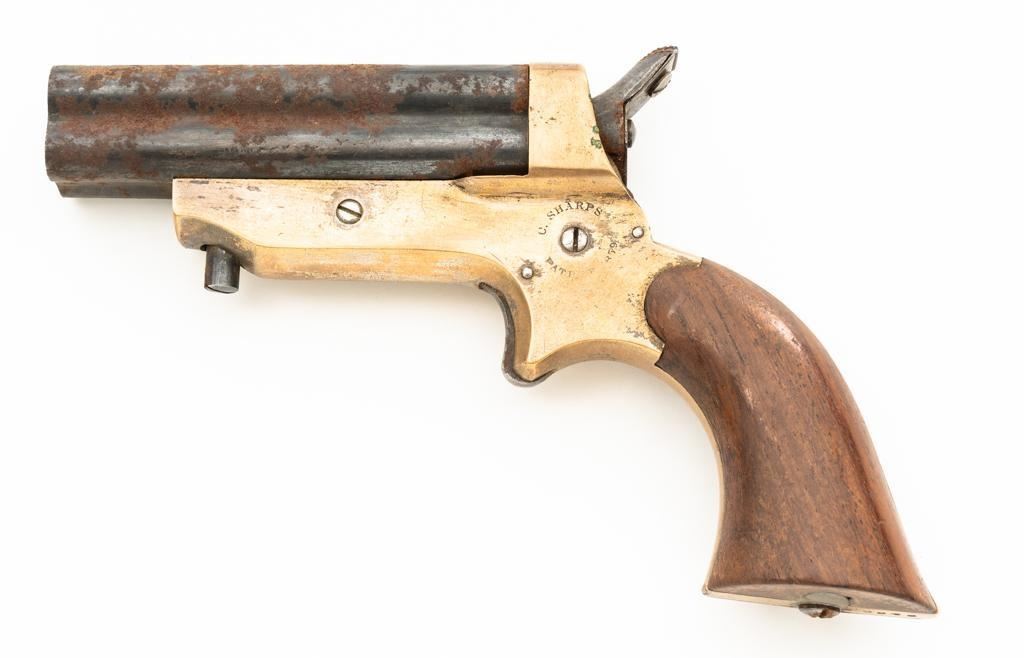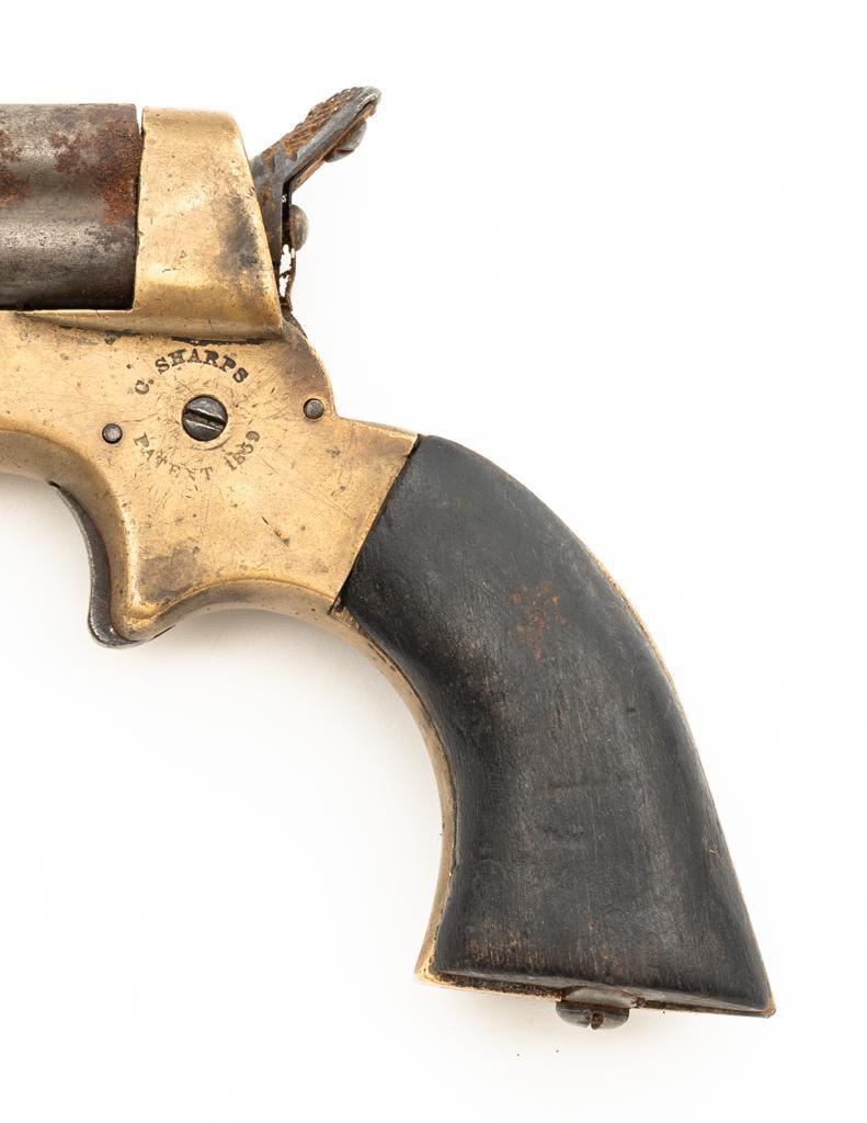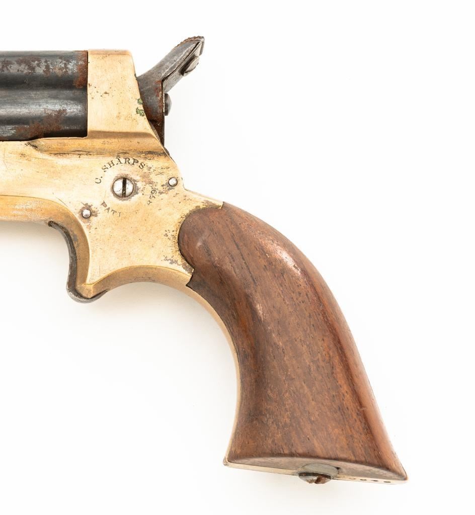 Lot of Four (4) C. Sharps 2nd Model .30 RF Pepperbox 4-Shot Pistols: 1.) #10972, .30 RF cal., 3'' barrels, blue finish, smooth walnut two-piece grips, with brass frame. Factory markings are legible. Grips are mismatched with the left side smooth and right side checkered. 2.) #2646, .30 RF cal., 3'' barrels, blue finish, smooth walnut two-piece grips, with brass frame. Factory markings are legible. 3.) #100, .30 RF cal., 3'' barrels, blue finish, checkered hard rubber two-piece grips, with brass frame. Factory markings are legible. 4.) #9342, .30 RF cal., 3'' barrels, blue finish, checkered hard rubber two-piece grips, with brass frame. All the pistols are in fair overall condition, showing varying amounts of scattered surface rust due to poor storage. Brass frames display a moderate patina. Actions are rusted shut and non-functioning. Bores are dark with varying amount of surface rust and light erosion. All are candidates for careful restoration or for parts. Est.: $600-$900/lot. (Antique)