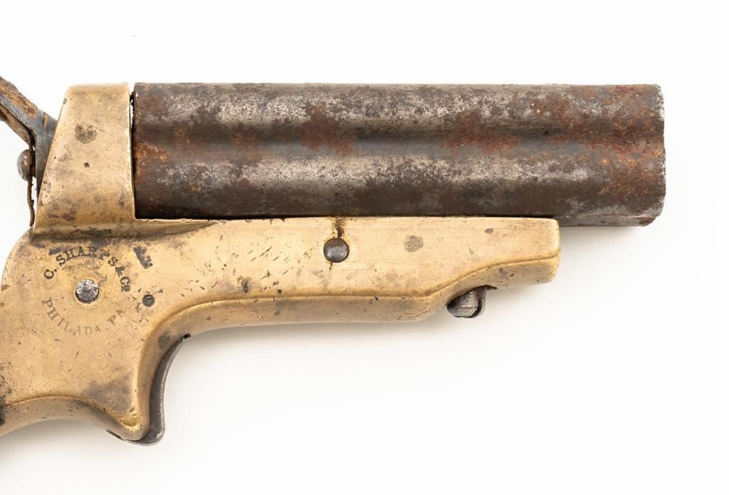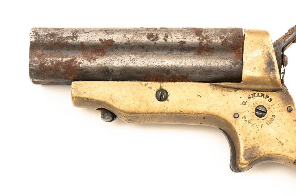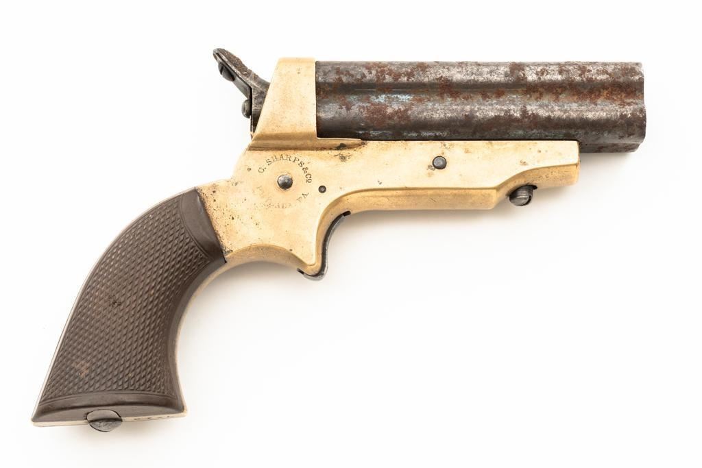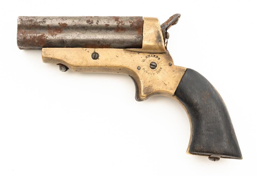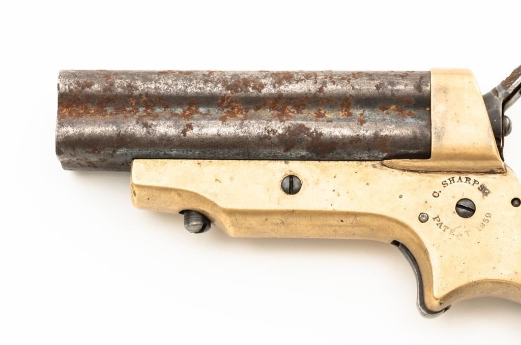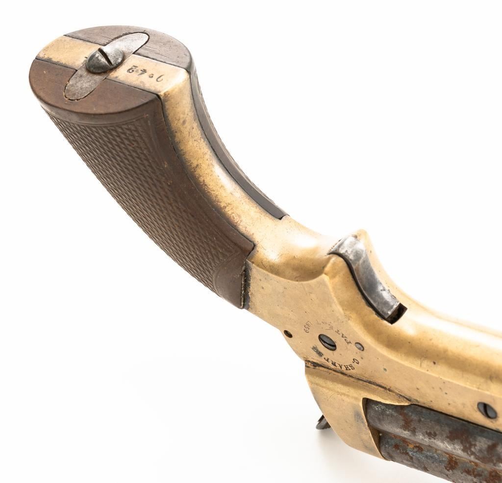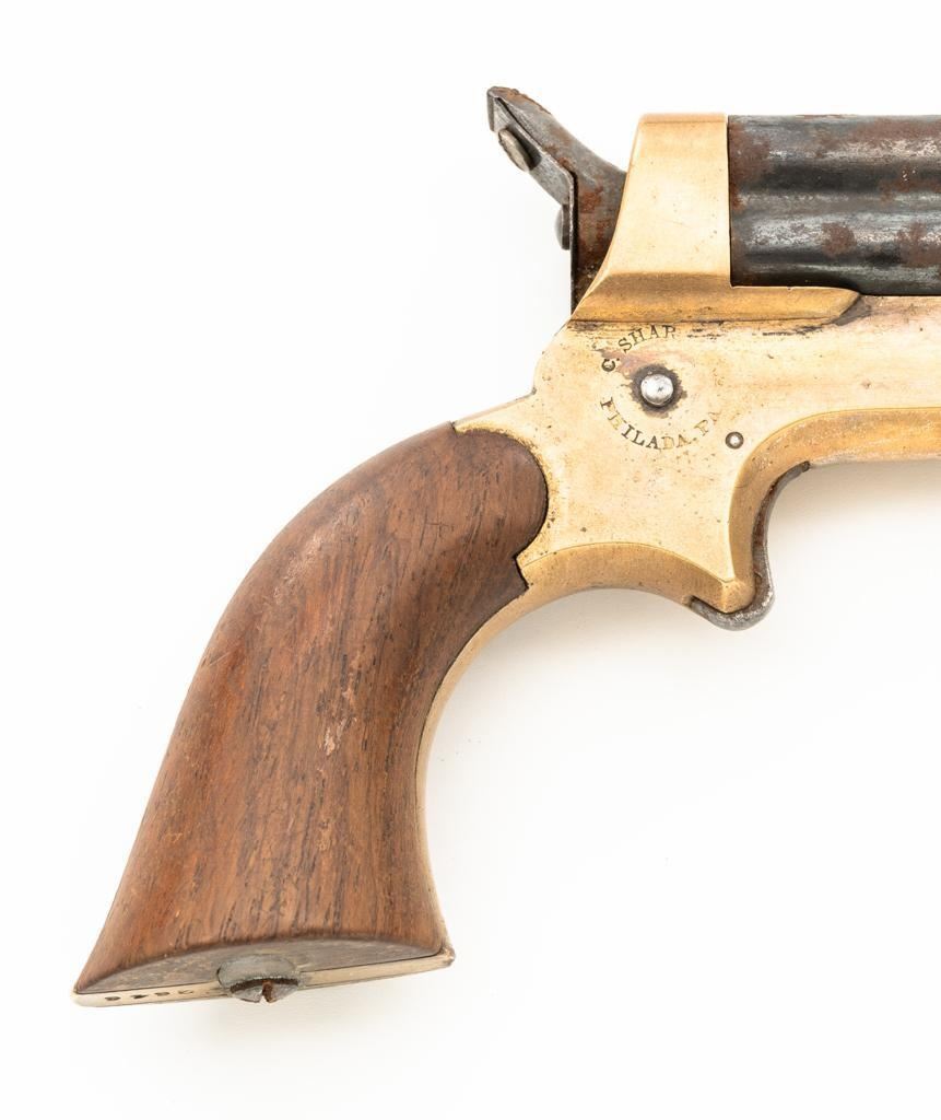 Lot of Four (4) C. Sharps 2nd Model .30 RF Pepperbox 4-Shot Pistols: 1.) #10972, .30 RF cal., 3'' barrels, blue finish, smooth walnut two-piece grips, with brass frame. Factory markings are legible. Grips are mismatched with the left side smooth and right side checkered. 2.) #2646, .30 RF cal., 3'' barrels, blue finish, smooth walnut two-piece grips, with brass frame. Factory markings are legible. 3.) #100, .30 RF cal., 3'' barrels, blue finish, checkered hard rubber two-piece grips, with brass frame. Factory markings are legible. 4.) #9342, .30 RF cal., 3'' barrels, blue finish, checkered hard rubber two-piece grips, with brass frame. All the pistols are in fair overall condition, showing varying amounts of scattered surface rust due to poor storage. Brass frames display a moderate patina. Actions are rusted shut and non-functioning. Bores are dark with varying amount of surface rust and light erosion. All are candidates for careful restoration or for parts. Est.: $600-$900/lot. (Antique)