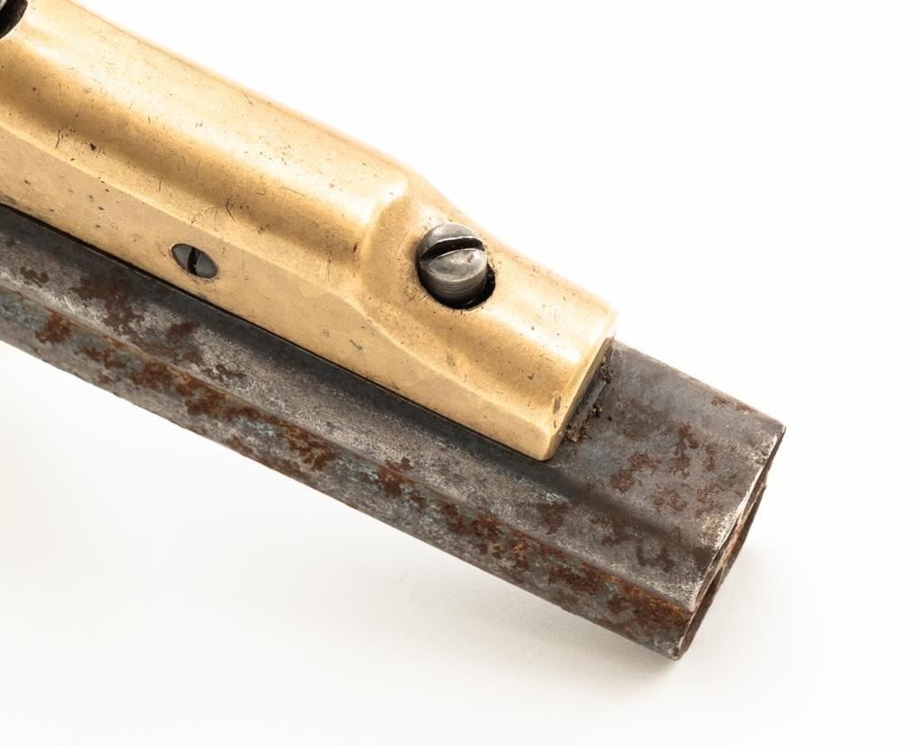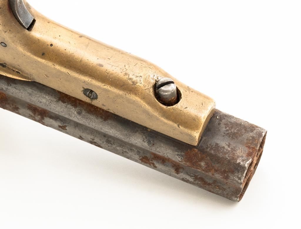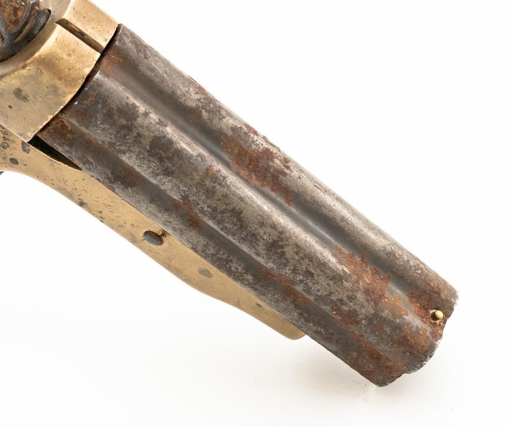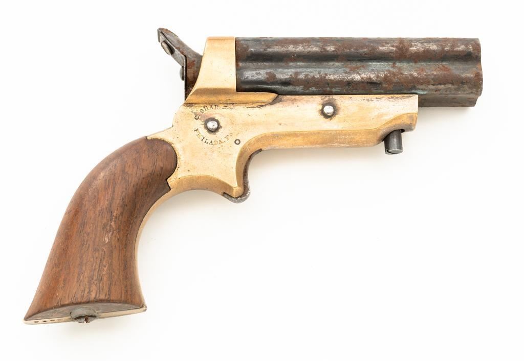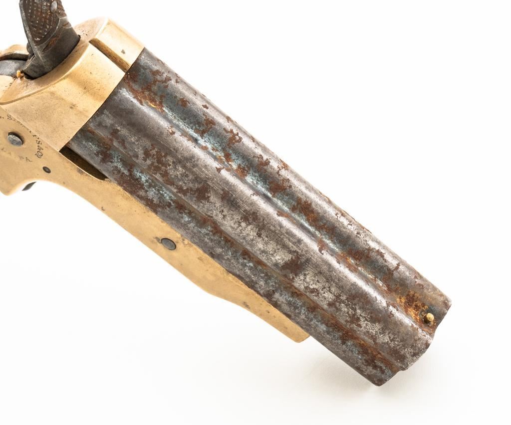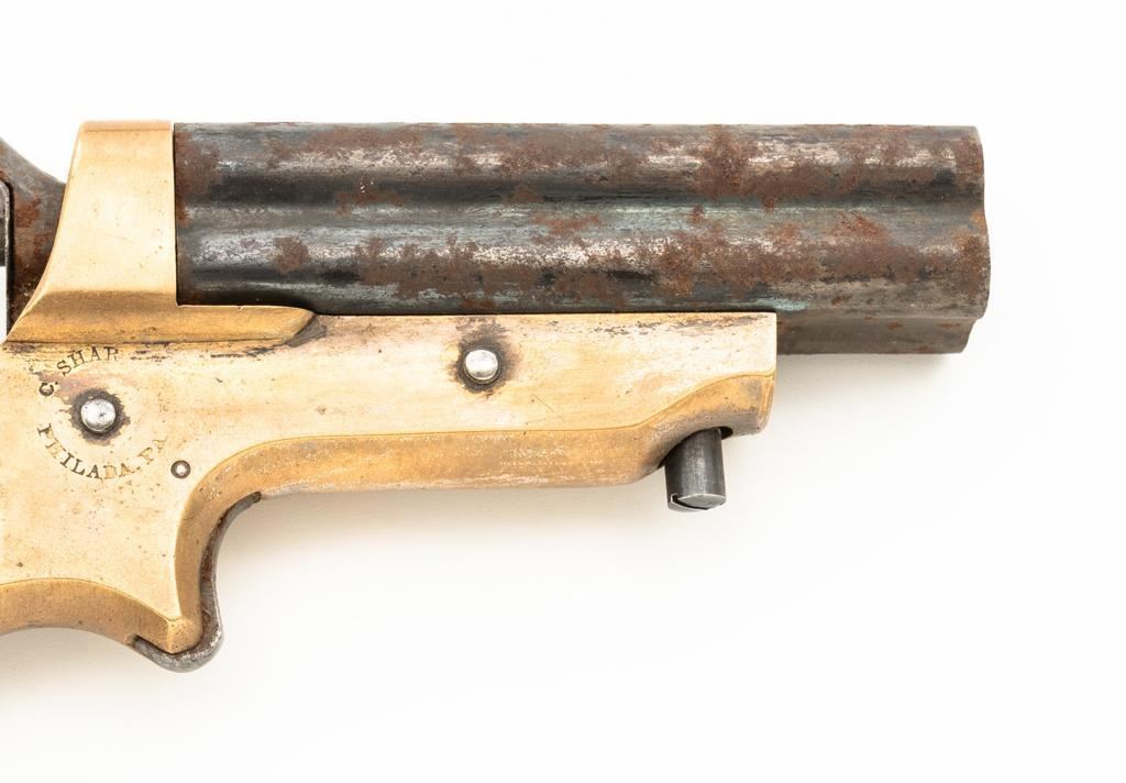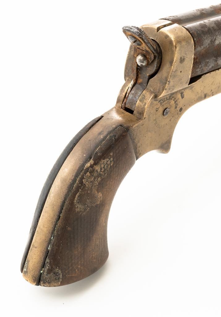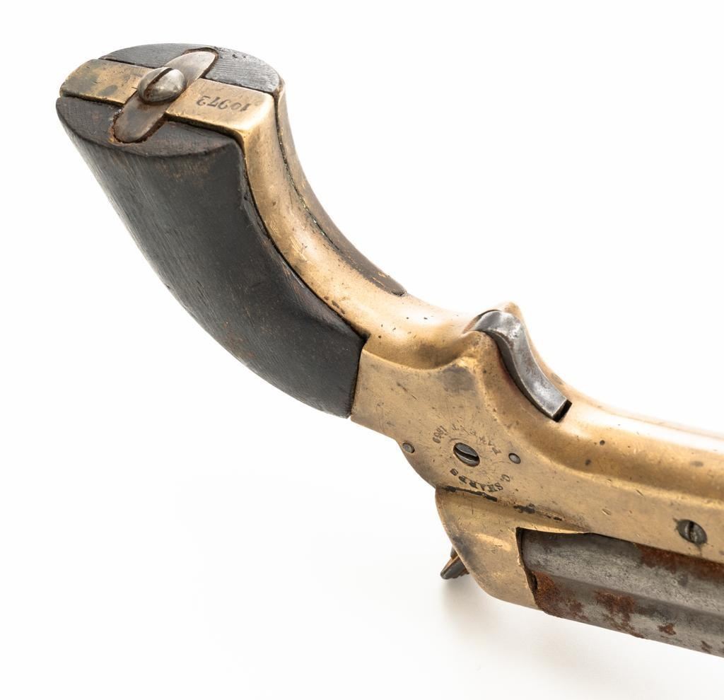 Lot of Four (4) C. Sharps 2nd Model .30 RF Pepperbox 4-Shot Pistols: 1.) #10972, .30 RF cal., 3'' barrels, blue finish, smooth walnut two-piece grips, with brass frame. Factory markings are legible. Grips are mismatched with the left side smooth and right side checkered. 2.) #2646, .30 RF cal., 3'' barrels, blue finish, smooth walnut two-piece grips, with brass frame. Factory markings are legible. 3.) #100, .30 RF cal., 3'' barrels, blue finish, checkered hard rubber two-piece grips, with brass frame. Factory markings are legible. 4.) #9342, .30 RF cal., 3'' barrels, blue finish, checkered hard rubber two-piece grips, with brass frame. All the pistols are in fair overall condition, showing varying amounts of scattered surface rust due to poor storage. Brass frames display a moderate patina. Actions are rusted shut and non-functioning. Bores are dark with varying amount of surface rust and light erosion. All are candidates for careful restoration or for parts. Est.: $600-$900/lot. (Antique)