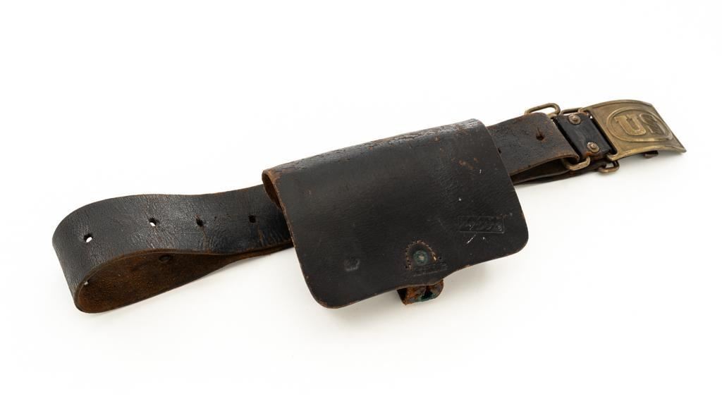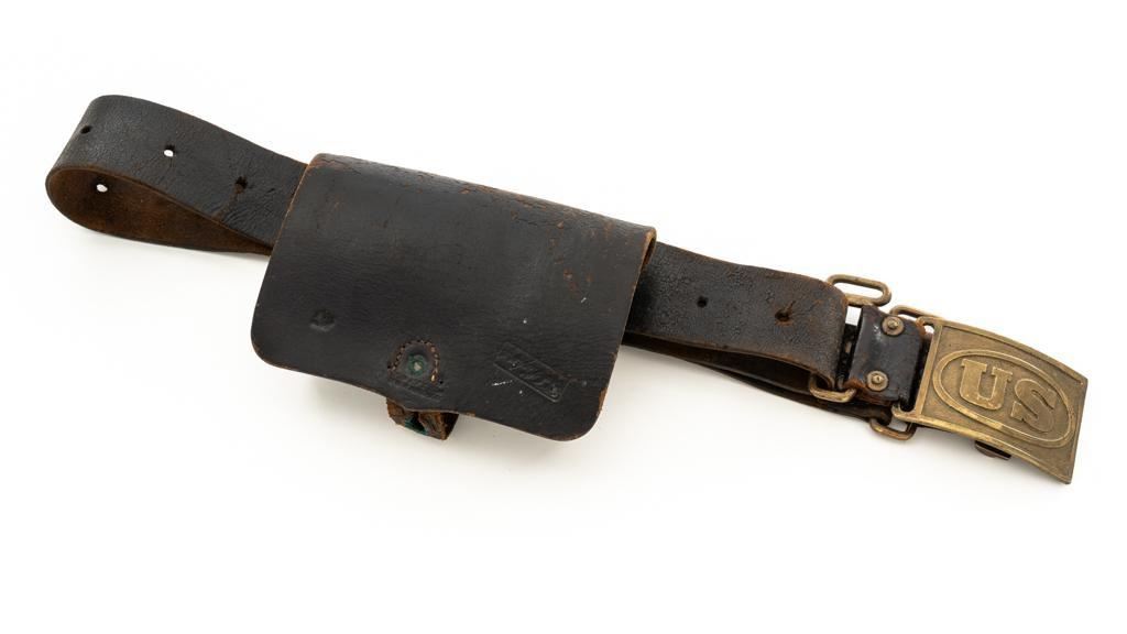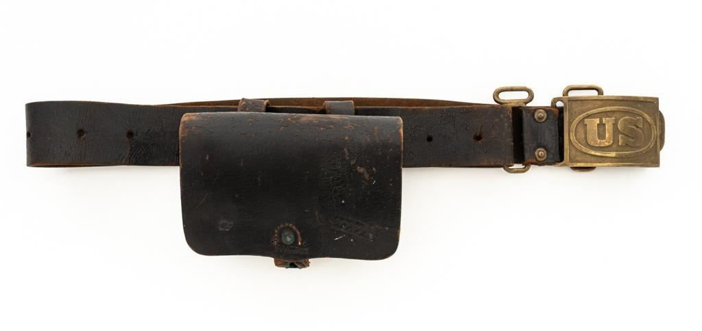Indian Wars Period ''US'' Leather Belt and Brass Buckle with Civil War Era Leather Cartridge Box. Lot includes a period leather infantry belt with brass hardware and rectangular ''US'' marked cast brass buckle. Additionally, the attached cartridge box is Civil War era, marked ''US'', displaying a ''T.J. SHEPARD'' inspection mark. Cartridge case is marked at the front base ''J. DAVY & Co / NEWARK, N.J.'' with intact straps and brass hardware showing light verdigris. Belt is in good condition with age cracks and weathering. Buckle is very good with standard hook closure, showing dents, and scuffs consistent with service use. Cartridge box is very good with age cracks, loss of finish, and tight stitching. Est.: $200-$400.