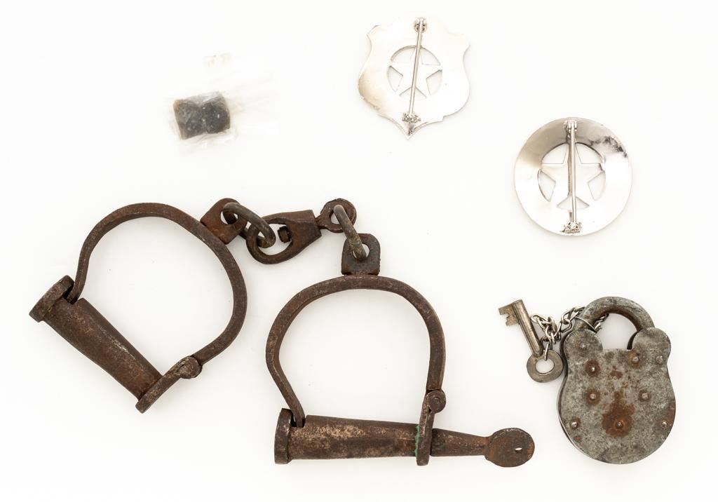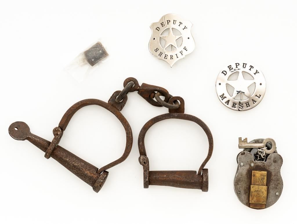 Lot of Old West Lawman Gear. The lot includes a Civil War era pair of iron handcuffs in fair condition, measuring 3'' x 3.25'' with two rings and swiveling connector ring, 11'' in length. Cuffs have gone to brown patina with rust and erosion, marked ''2 3 J'' on one cuff and ''311'' on the other. Key is retained and they function properly. The lot additionally contains an old flint, early padlock marked ''CSA'' in an oval on one side and ''PATENT 336H3'' on the right. Brass locking latch is marked ''PATENT 534311'' AND ''SECURE / 2 / LEVER''. Lock is in good condition, gone to gray patina, and includes a key. The lot also includes two (2) modern reproduction Deputy Sheriff and Deputy Marshal badges that appear as new with bright finish. Est. $150-$250/lot.