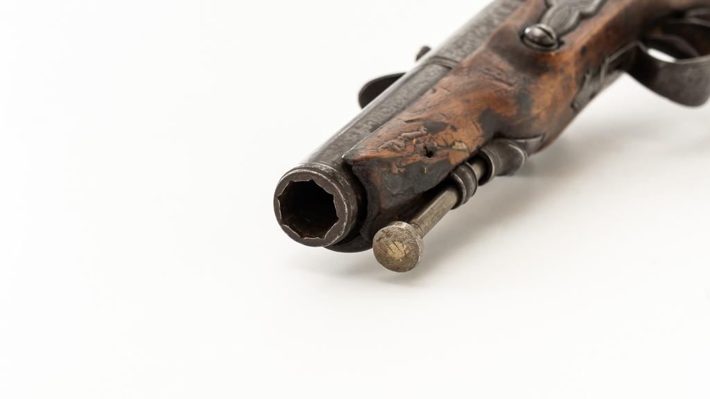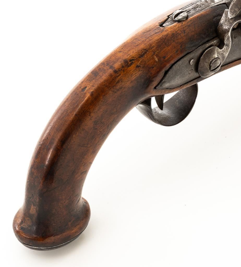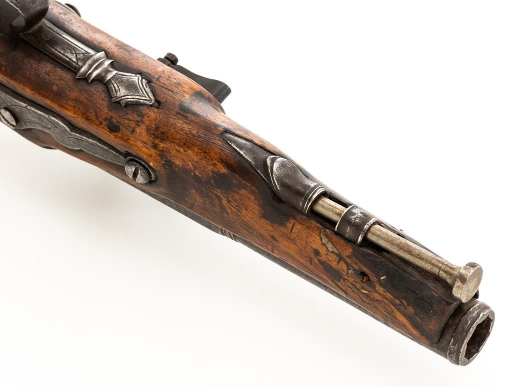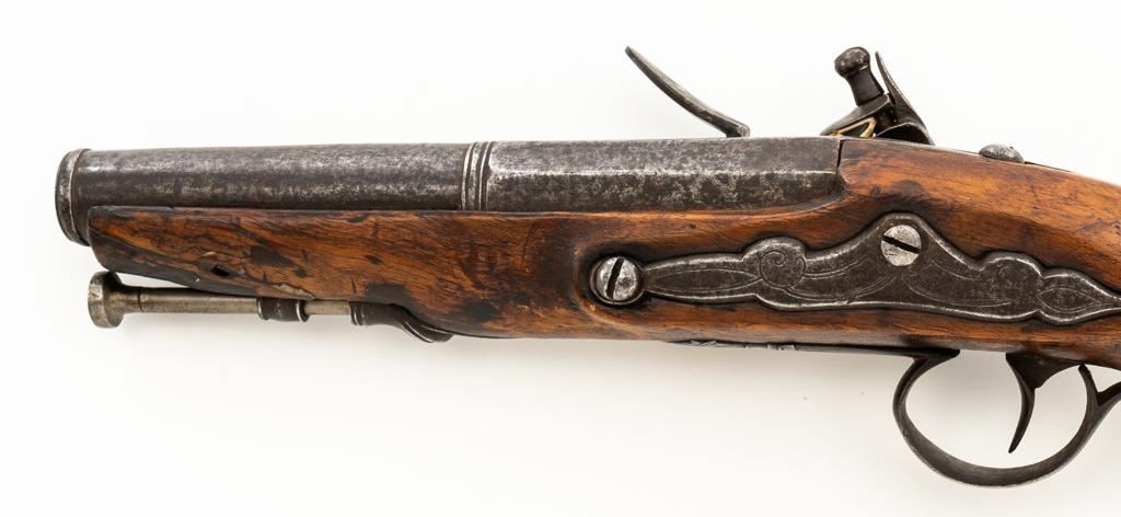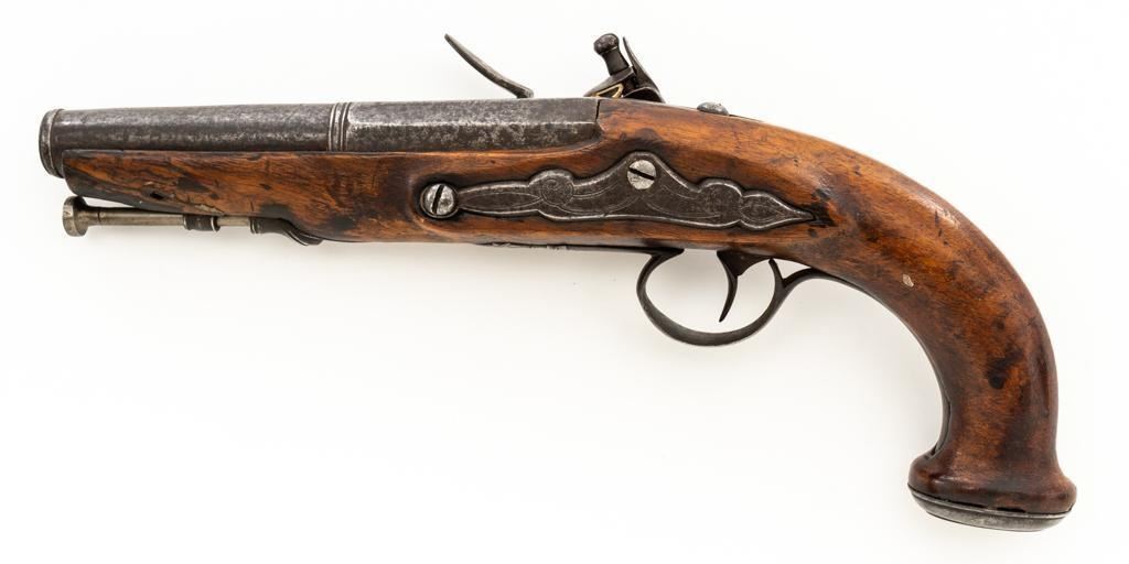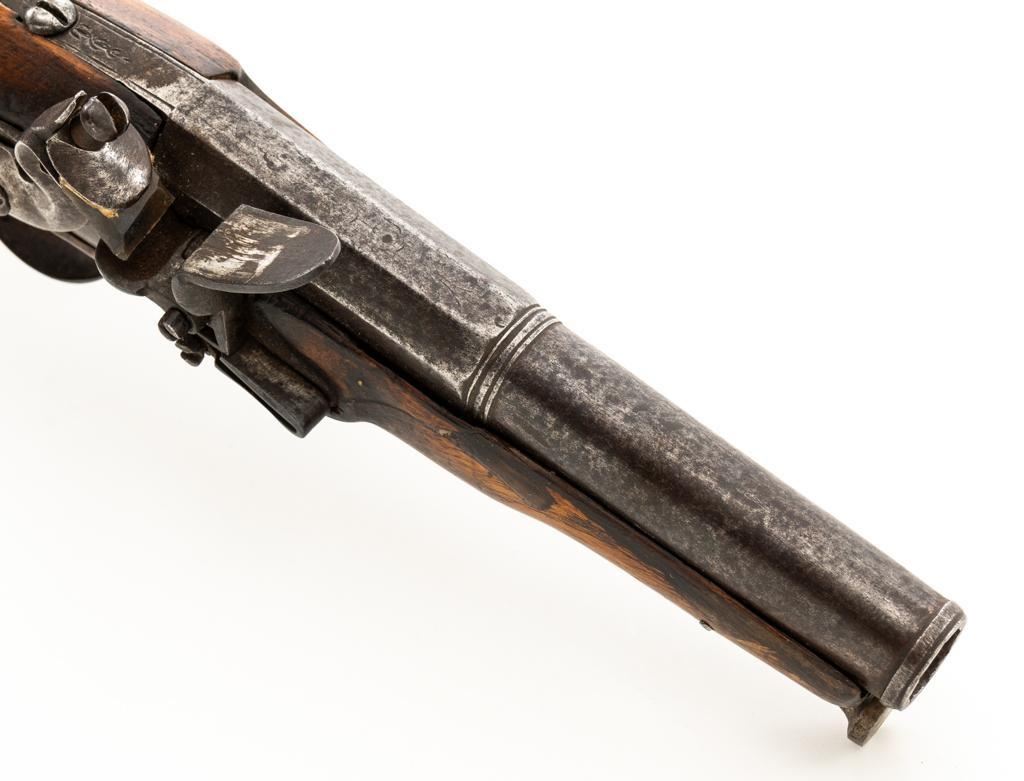 Unmarked Two-Stage Round/Octagon Barrel Flintlock Pistol, NVSN, .50 cal., 5.75'' barrel, no finish, smooth hardwood stock. Featuring period engraving to the top barrel tang, trigger guard, buttcap and left side lockplate securing base. Mfg'd circa late-17 th century. Pistol is in overall good condition, displaying an even gray/brown patina to the metal parts. Stock is good showing an old, well-accomplished repair to both sides of the forend area. Action is strong. Bore is rough. Est.: $300-$500. (Antique)