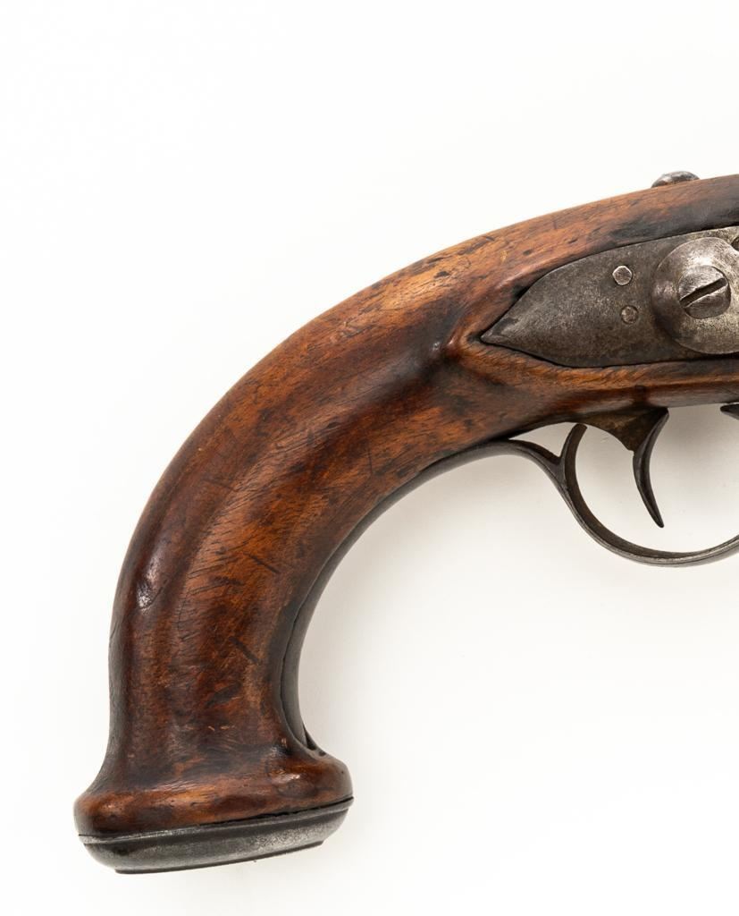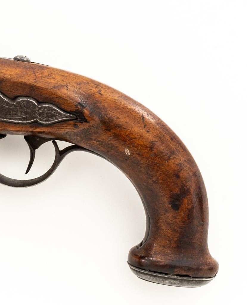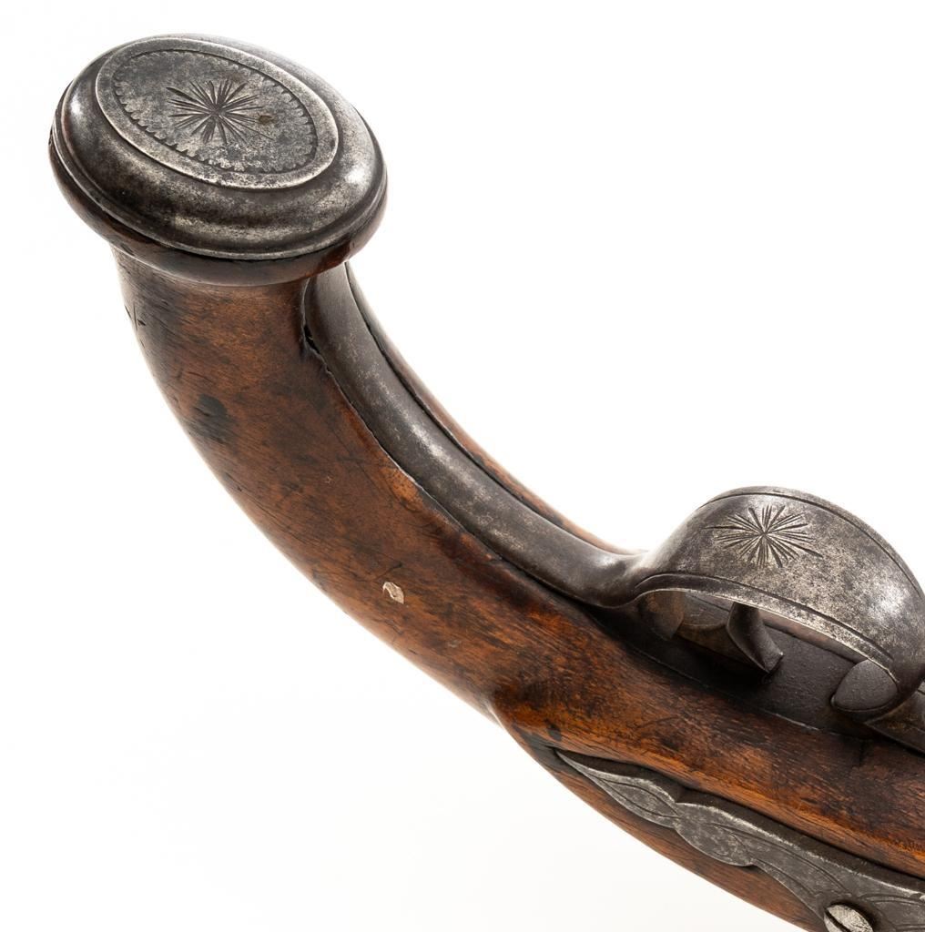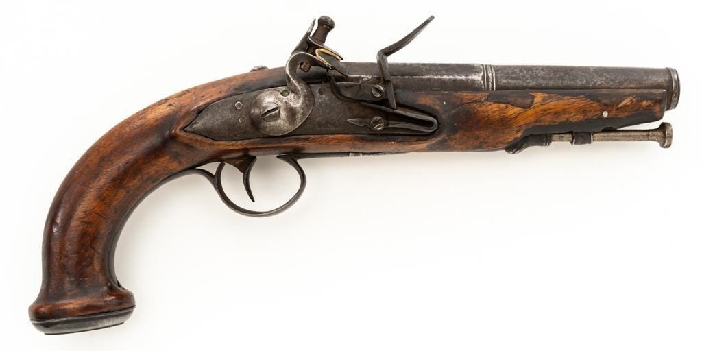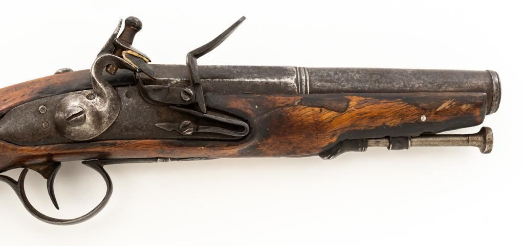 Unmarked Two-Stage Round/Octagon Barrel Flintlock Pistol, NVSN, .50 cal., 5.75'' barrel, no finish, smooth hardwood stock. Featuring period engraving to the top barrel tang, trigger guard, buttcap and left side lockplate securing base. Mfg'd circa late-17 th century. Pistol is in overall good condition, displaying an even gray/brown patina to the metal parts. Stock is good showing an old, well-accomplished repair to both sides of the forend area. Action is strong. Bore is rough. Est.: $300-$500. (Antique)