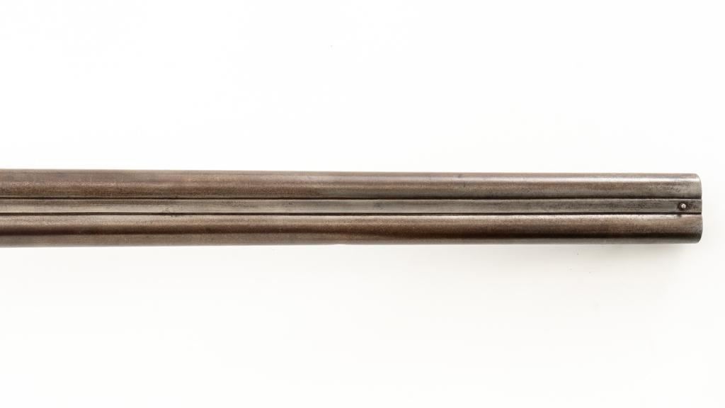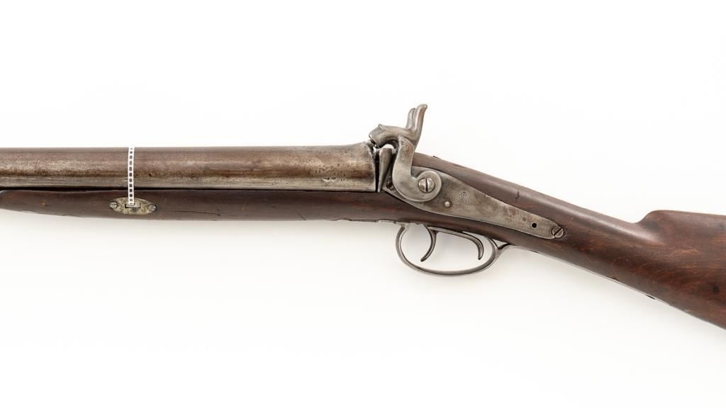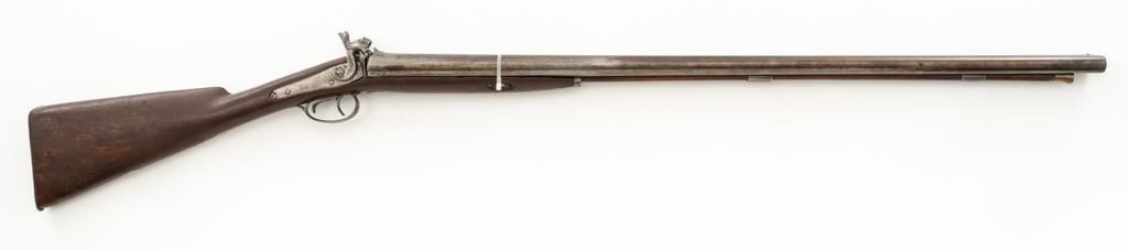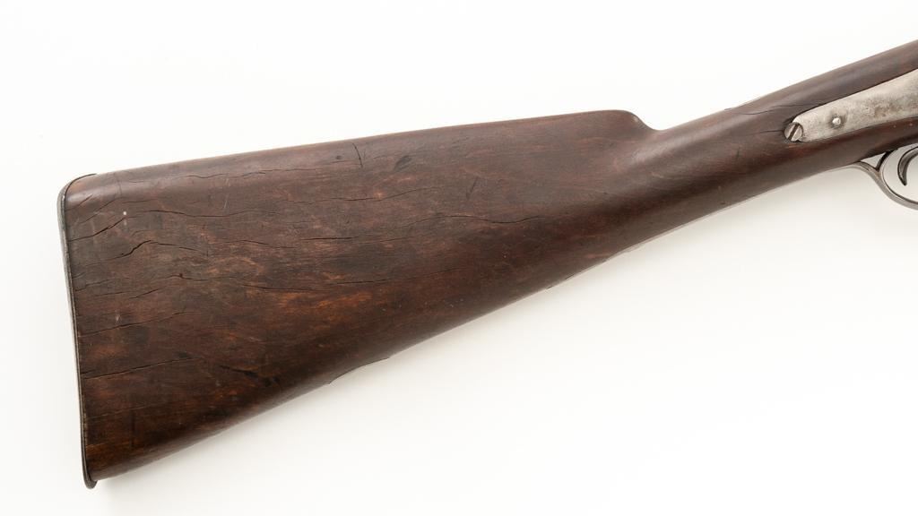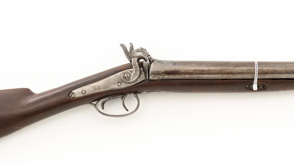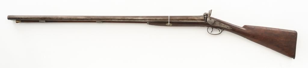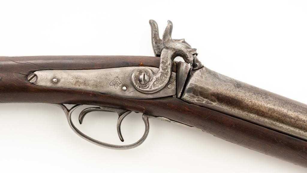 Antique Belgian Dresse-LaLoux & Cie Muzzleloading Exposed Hammer Percussion Side-by-Side Shotgun, #NVSN, 12 ga., blue and color case hardened finish, smooth walnut one-piece straight grip stock, ending with smooth iron butt plate, providing a 14.5'' LOP. Shotgun also features a steel bead front sight, double triggers, and exposed hammers. Most markings were removed but there are sharp Dresse-LaLoux ''insect'' markings on both sides of the receiver. Mfg'd circa late-19th century. Shotgun is in fair condition with the metal surfaces gone to dark patina, showing surface erosion and significant pitting, wear and damage at the breech and around the nipples. Sideplates show traces of silvered color case hardened finish, with a replacement hammer on the left side. Stock is in good condition with impressions and bruising consistent with years of field use. Full-length wooden ramrod features a brass tip. Buttplate is proud at the toe due to shrinkage. Bores are dark and the action is inoperable on this interesting, old shotgun that is best served as a wall hanger. Est.: $200-$400. (Antique)