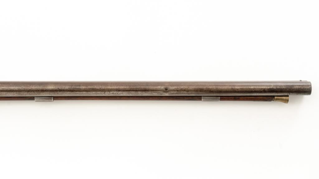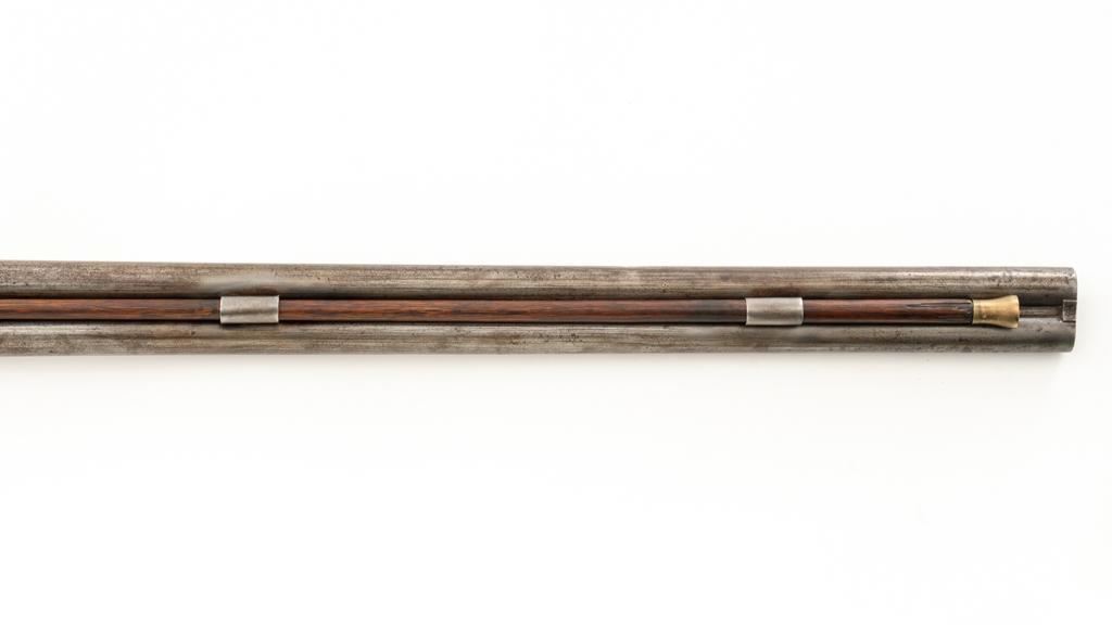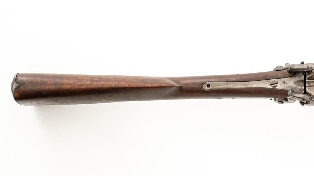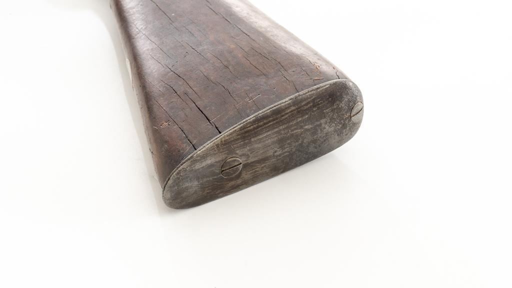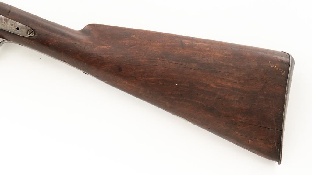 Antique Belgian Dresse-LaLoux & Cie Muzzleloading Exposed Hammer Percussion Side-by-Side Shotgun, #NVSN, 12 ga., blue and color case hardened finish, smooth walnut one-piece straight grip stock, ending with smooth iron butt plate, providing a 14.5'' LOP. Shotgun also features a steel bead front sight, double triggers, and exposed hammers. Most markings were removed but there are sharp Dresse-LaLoux ''insect'' markings on both sides of the receiver. Mfg'd circa late-19th century. Shotgun is in fair condition with the metal surfaces gone to dark patina, showing surface erosion and significant pitting, wear and damage at the breech and around the nipples. Sideplates show traces of silvered color case hardened finish, with a replacement hammer on the left side. Stock is in good condition with impressions and bruising consistent with years of field use. Full-length wooden ramrod features a brass tip. Buttplate is proud at the toe due to shrinkage. Bores are dark and the action is inoperable on this interesting, old shotgun that is best served as a wall hanger. Est.: $200-$400. (Antique)