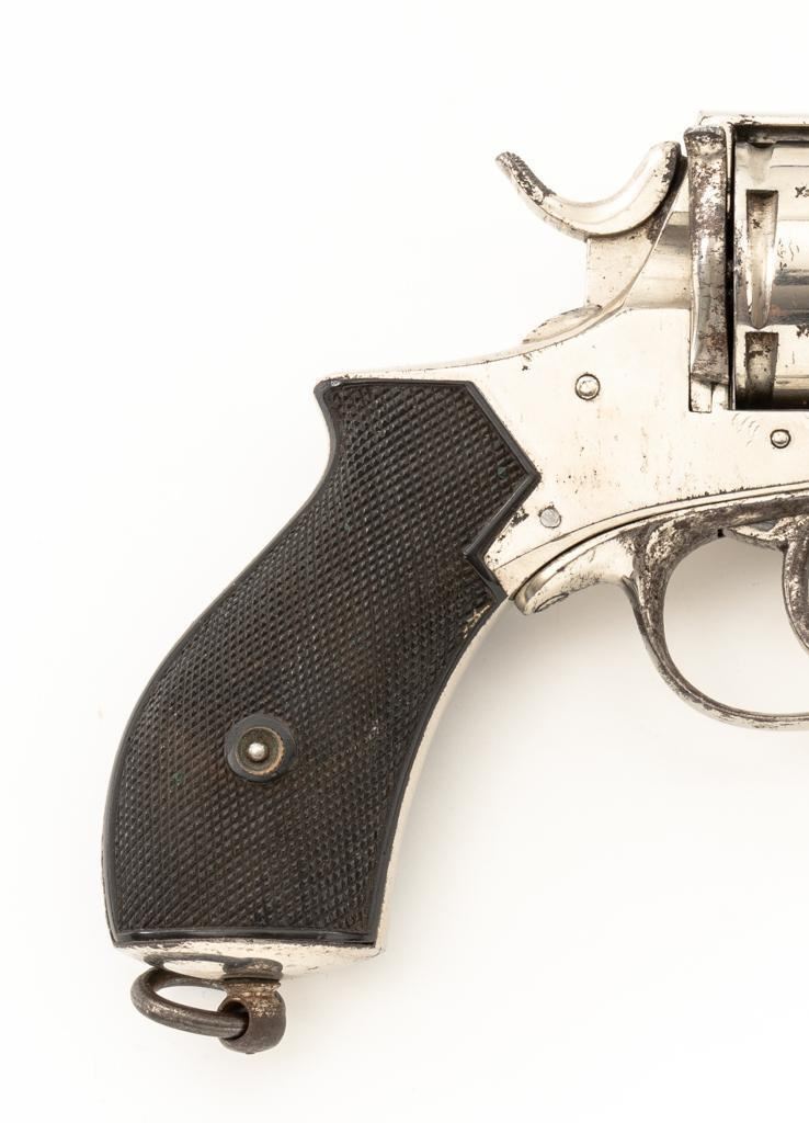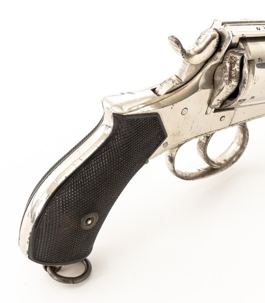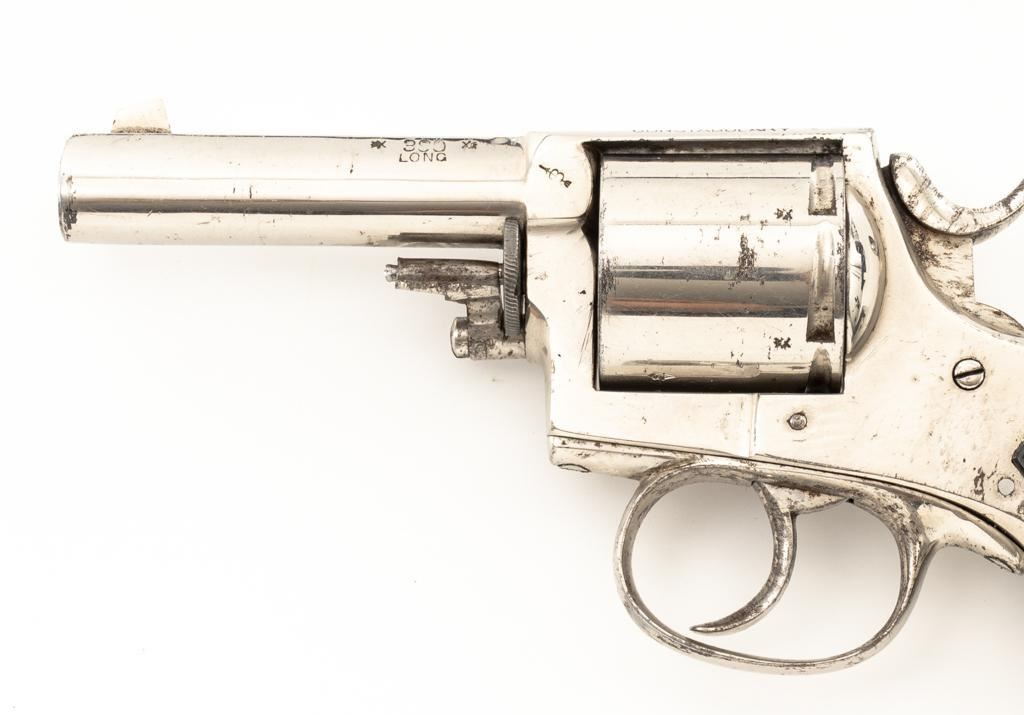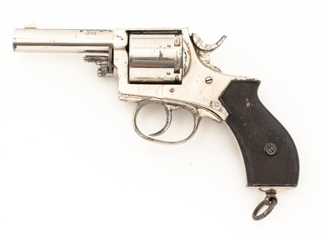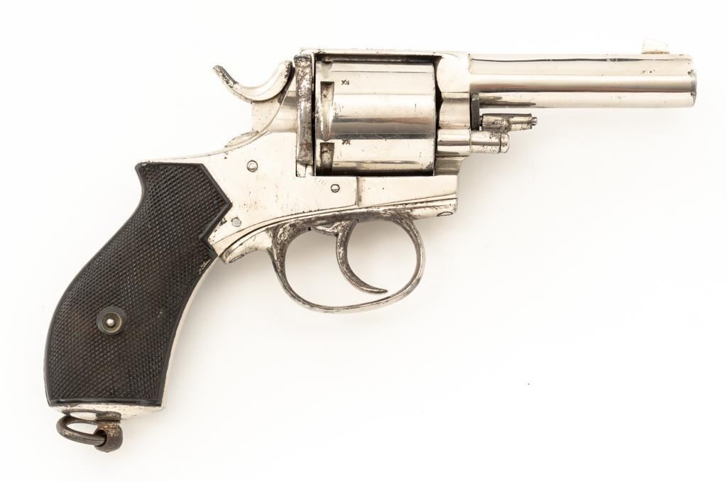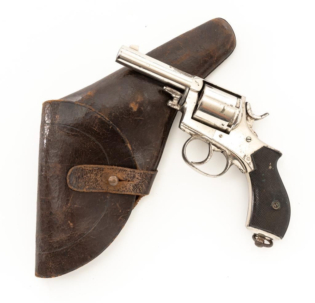 Irish Constabulary Marked Solid Frame Double Action Revolver with Holster, #NVSN, .380 Long cal., 3.25'' barrel, nickel finish, checkered grips, blade front sight, fixed rear sight with ''V''-notch and swiveling lanyard ring. The unmarked brown leather flap holster is in fair condition with overall wear and cracking. All stitching and fittings are present. Pistol is marked ''IRISH CONSTABULARY'' on top of the frame with an ''8 with arrow'' symbol on the left side, and numerous crowned ''(scepter)'' stamps to the frame, barrel, and cylinder. Additionally, there is a ''V'' stamped on top of the barrel. Condition overall is good, showing wear, flaking, and patina to the nickel. Grips are very good with light wear to the checkering. Action cycles smoothly in single and double action. The head is missing from the ejector rod and the assembly is jammed in the stored position. Bore and chambers are good, showing areas of patina with clear rifling. Est.: $250-$450. (Antique)